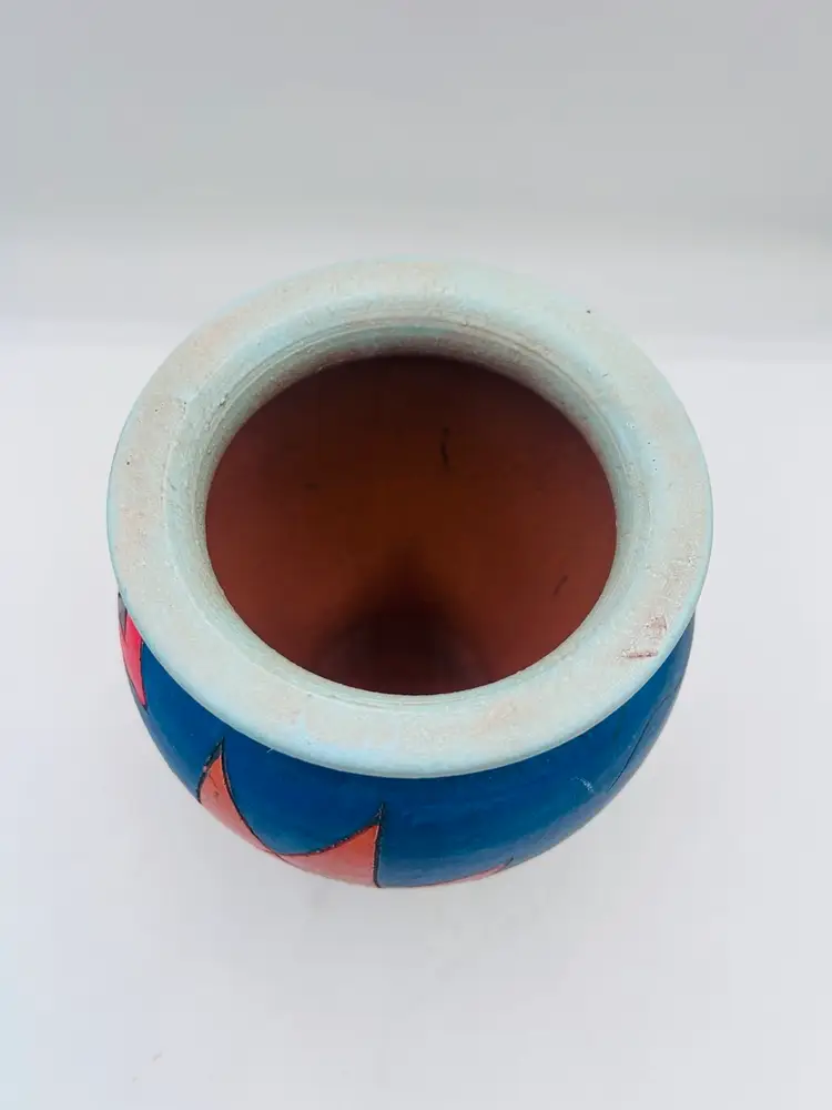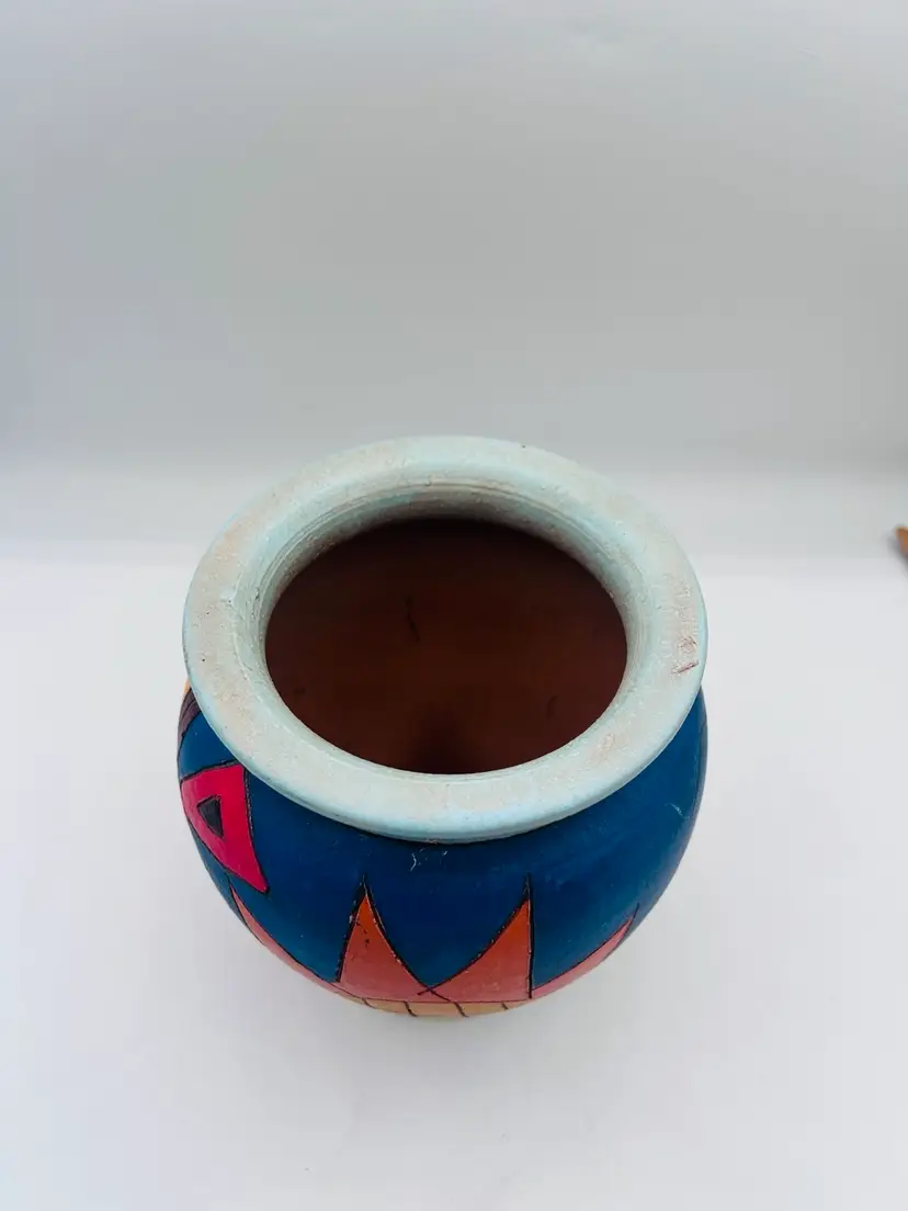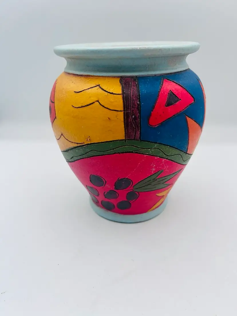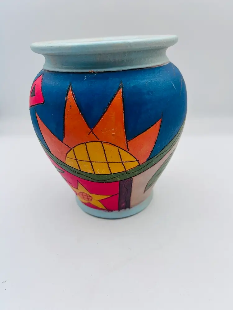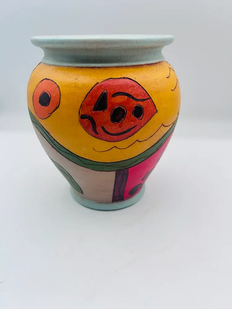 This handmade pottery vase features a unique eclectic free-spirit design with bright colors like yellows, blues, greens, and oranges. Signed by the artist, this vintage piece is made of clay and showcases a creative free-form pattern inspired by nature, such as sun, plants, fish, and fruits. The vase is handcrafted with an etched semi-matte finish and bears the artist's signature on the bottom. Measurements are 7” at widest point 6”. Very good condition.