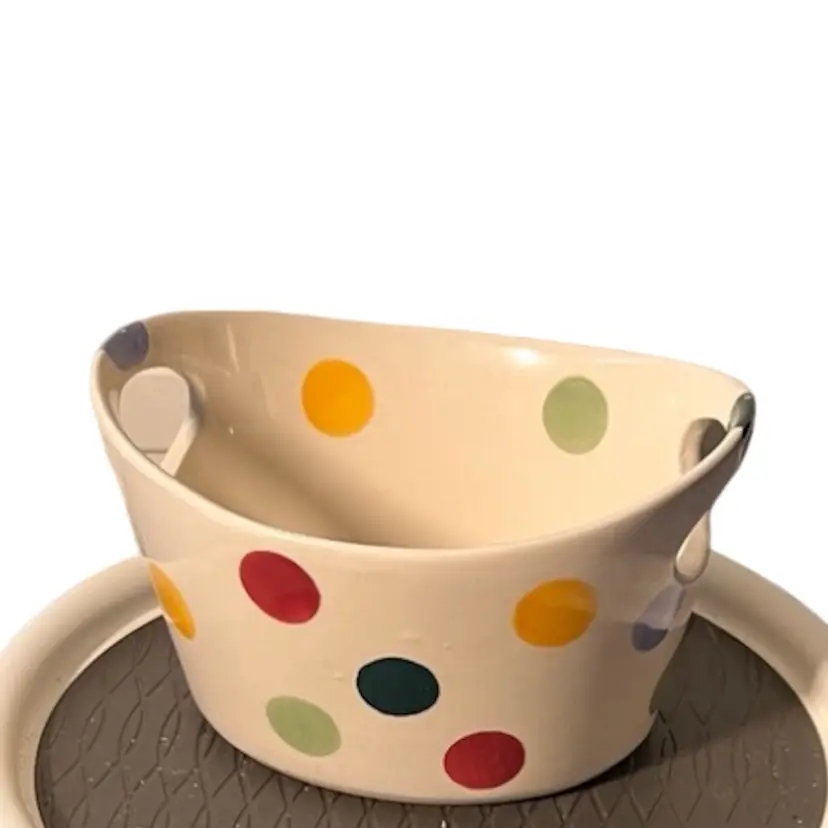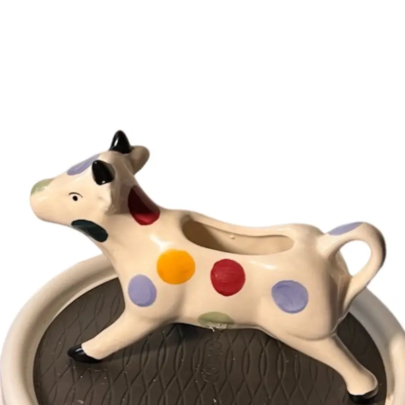 Beautiful matching polka dots. Both items are free from cracks or blemishes creamer is 6”w x 3 1/2” h bowl is 7 1/2” w x 5”h