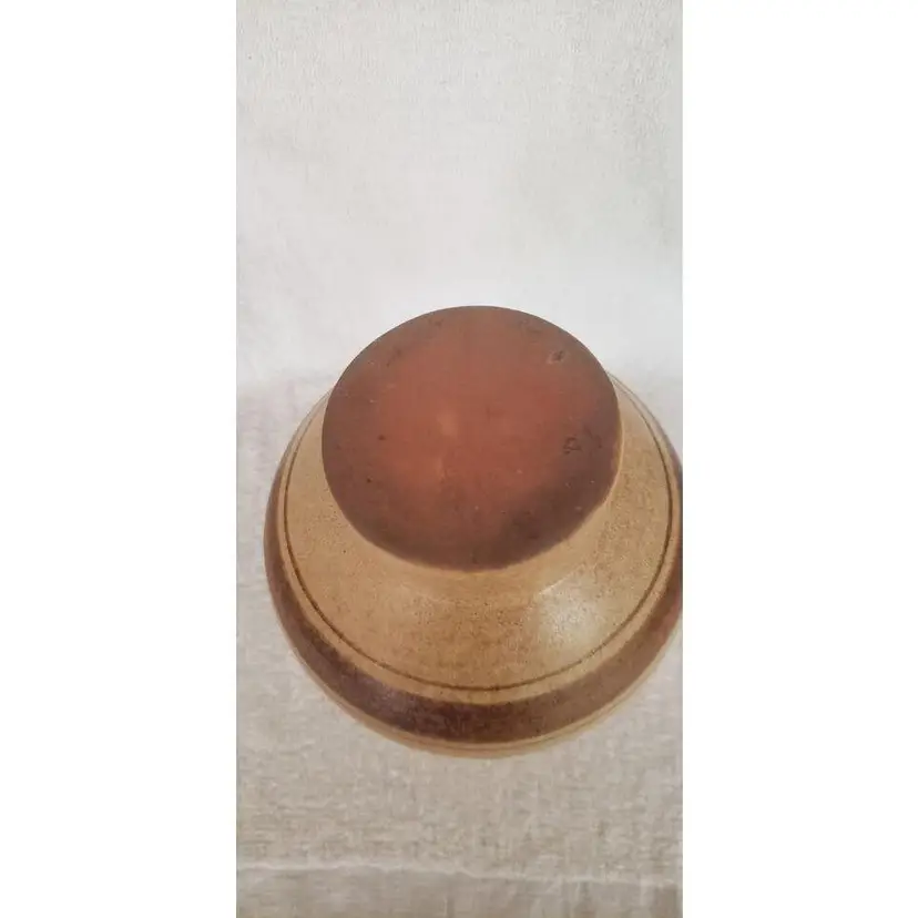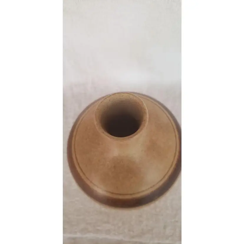A medium sized vase adds contemporary retro vibes to your decor. No chips/cracks- rim is smooth - bottom does show some age related wear due to use- display over the years- From 1980's. Features Beige background and Brown banded detailing. Approx 9"H x 6" W