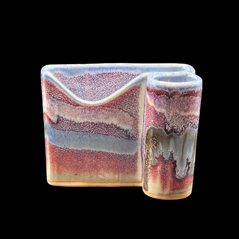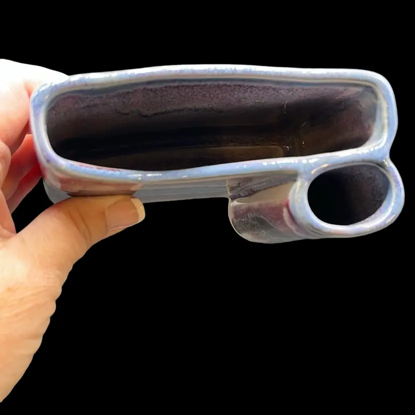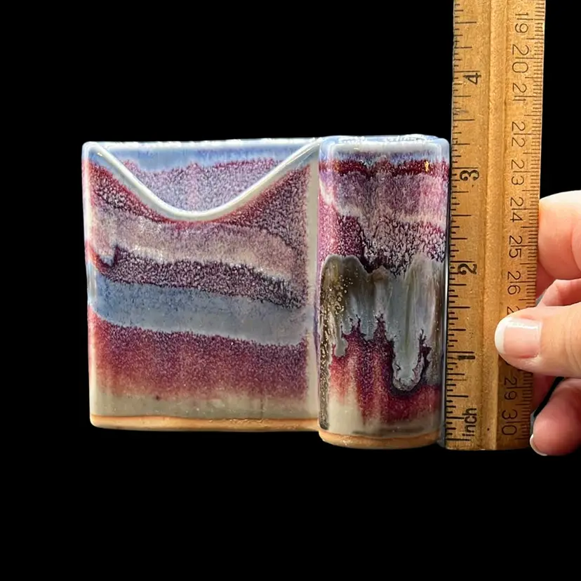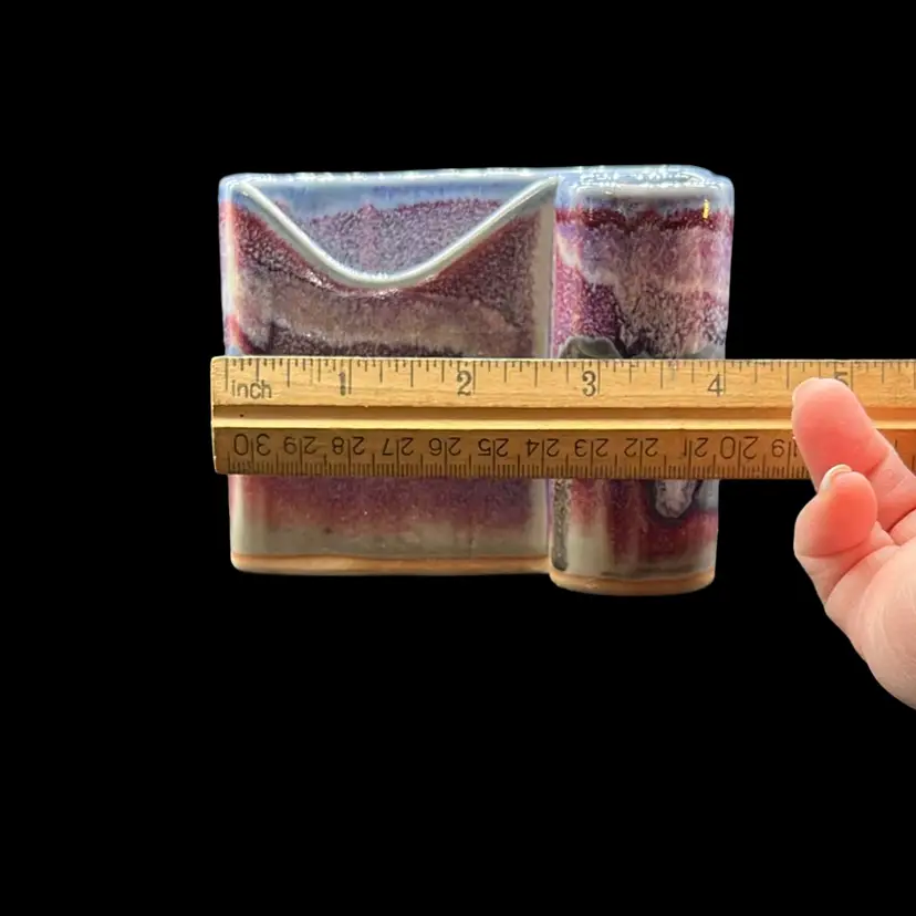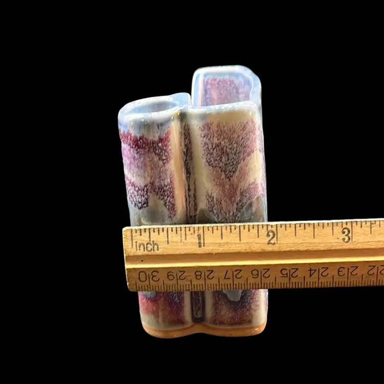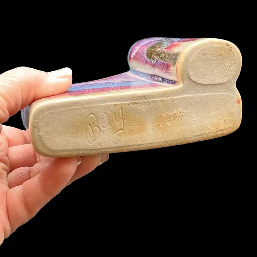 Beautiful hues of purple in glazes. Perfect addition to any desk. Signed by artist, Bay. No chips or cracks. Approx: 4.25” w x 2”d x 3.5” h