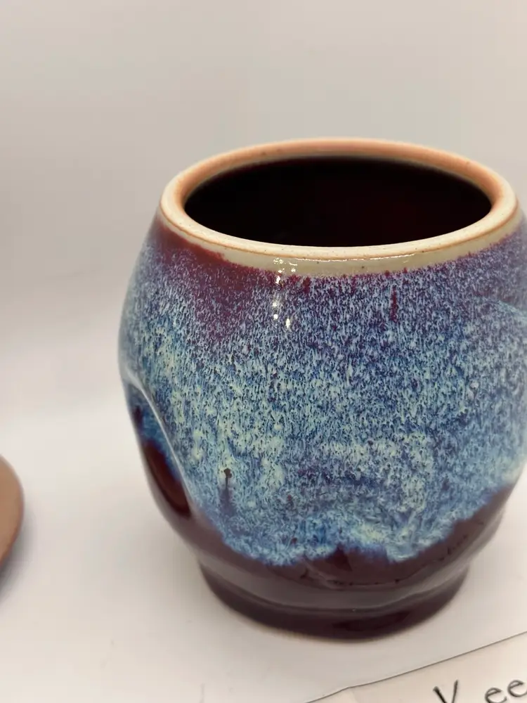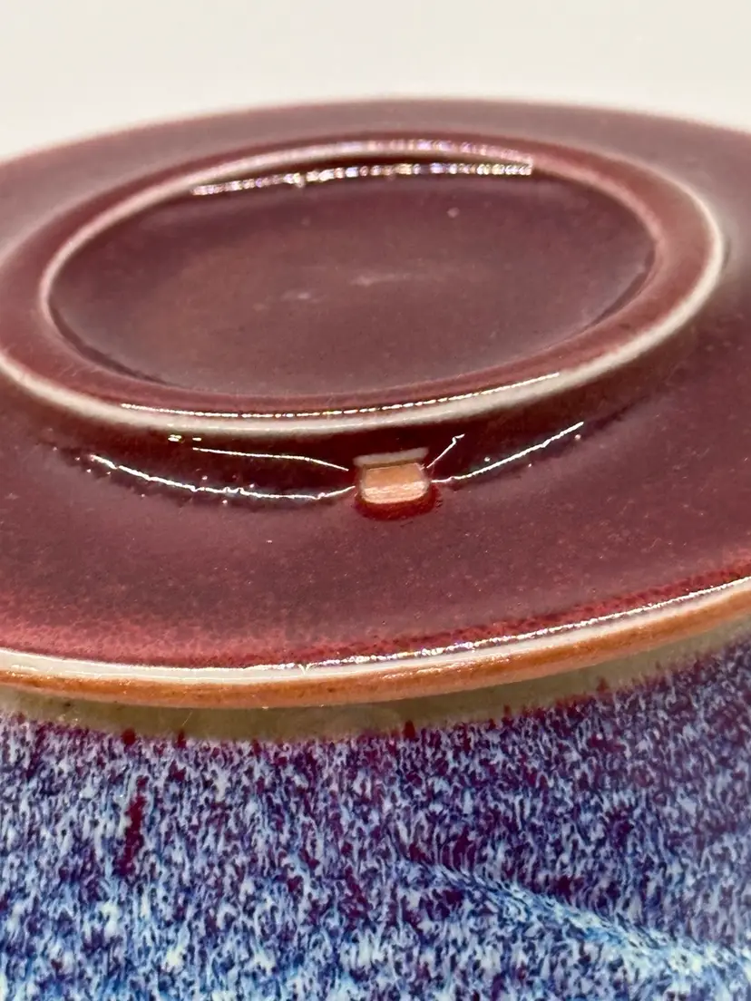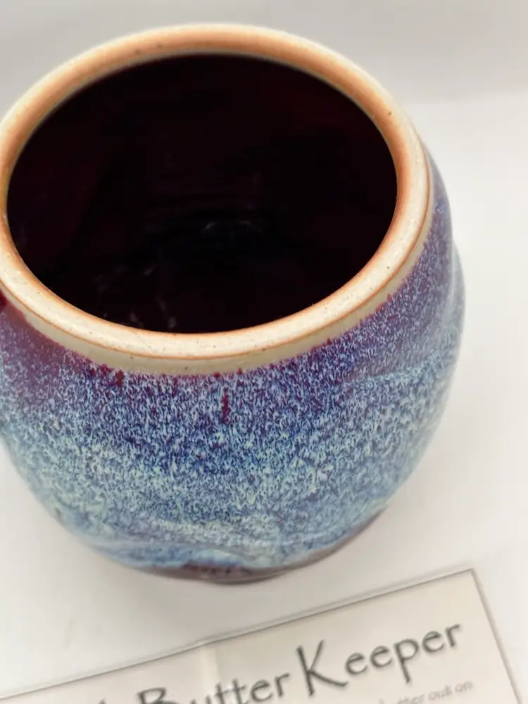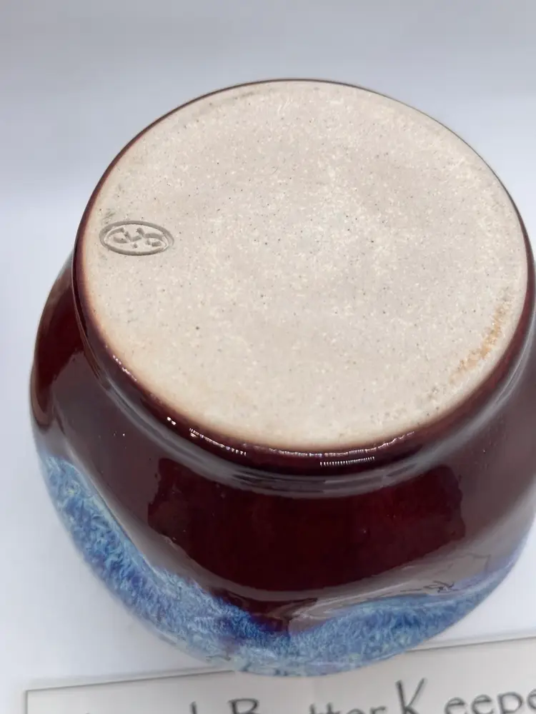 French butter keeper. Instructions included. A pretty blue and brown glaze. Looks new. There looks like a small paint chip on the lid or is part of the glaze. 4.5” tall.