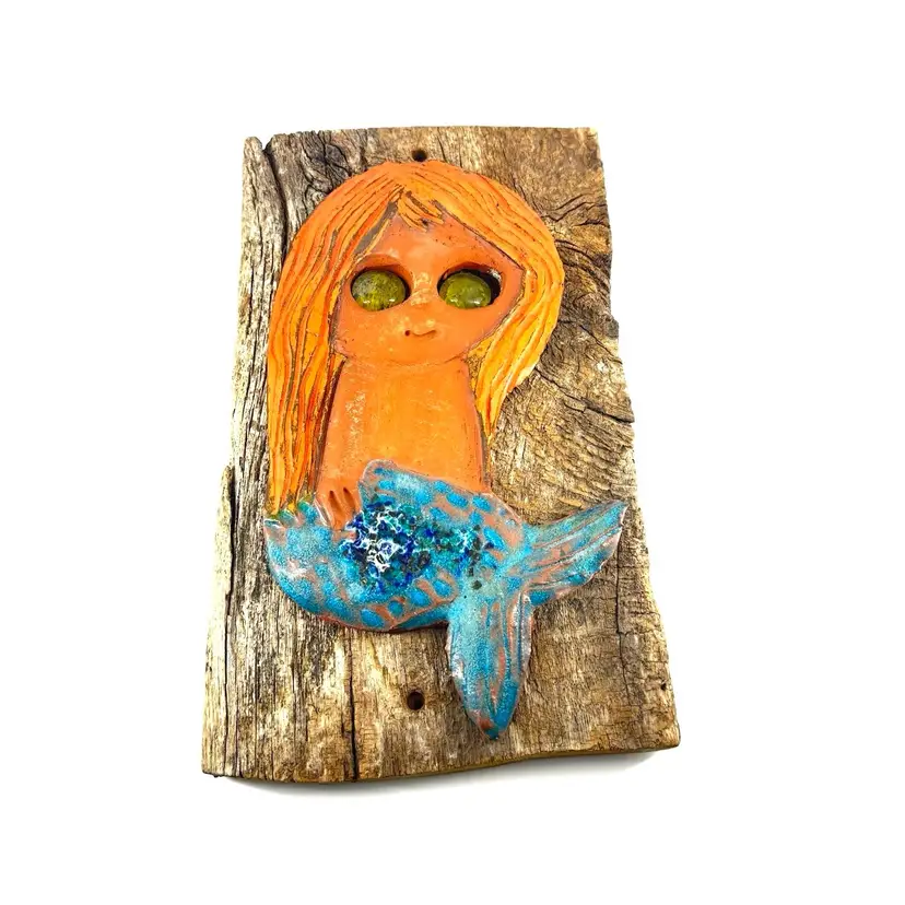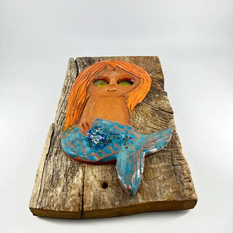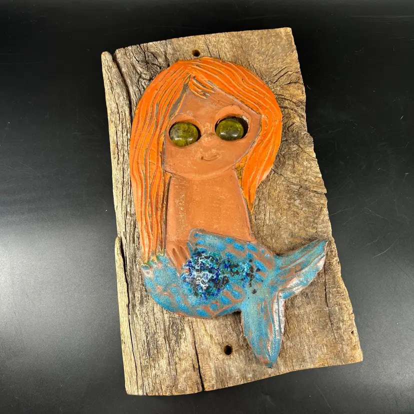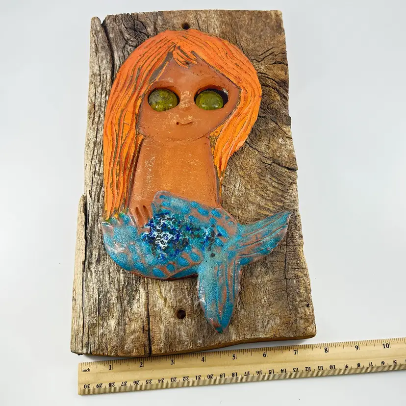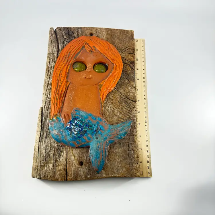 Height approximately 12” Length approximately 8” The mermaid is made out of pottery with glass eyes there are no chips or cracks on her. Also is not signed.