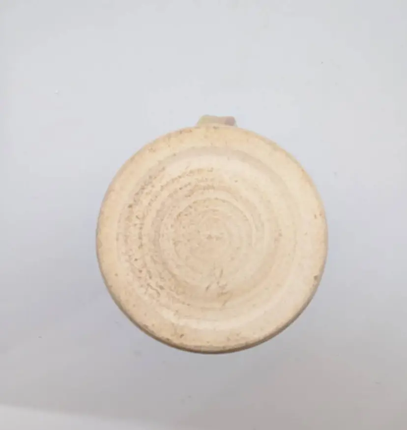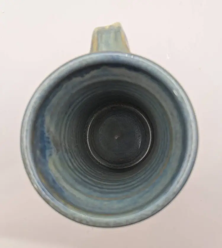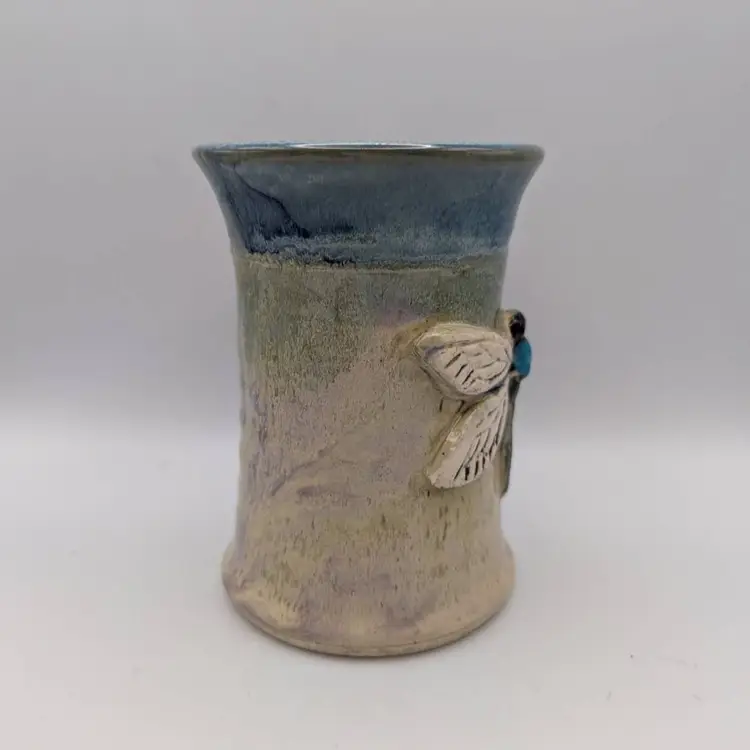 This is a beautiful studio art pottery mug with a dragonfly applied. It is signed- but I am unfamiliar with signature. The colors are blues, cream and some violet- with a unique design in the drip glaze. The handle is very strong and secure and the mug feels good in the hand. Measures: 5 inches tall, with a mouth diameter of 3.25 inches. Holds: 12 ounces