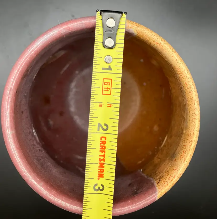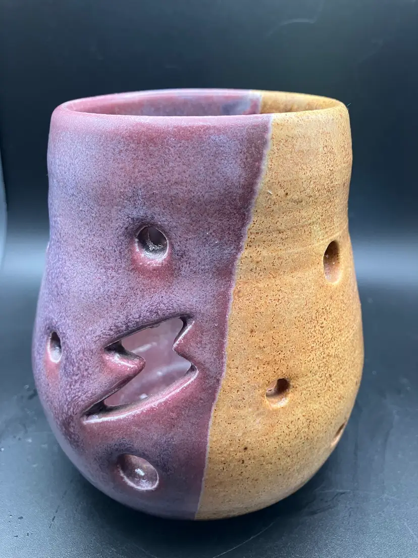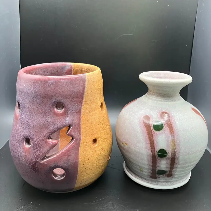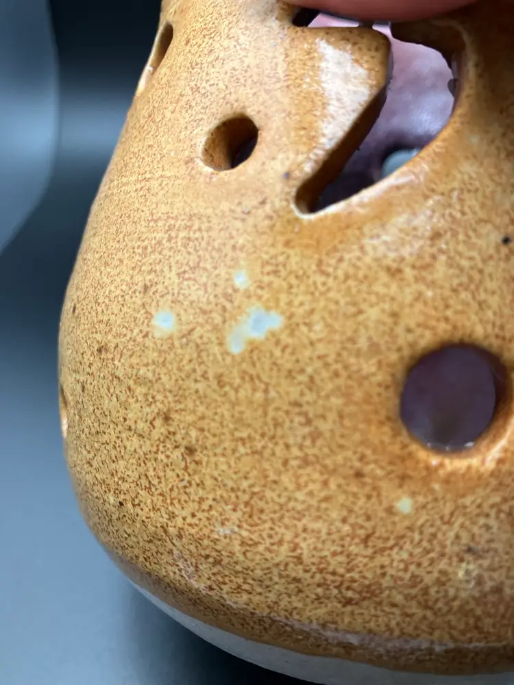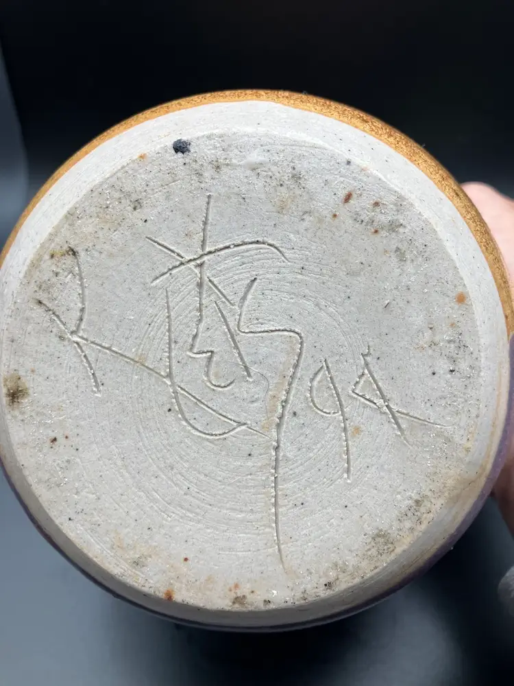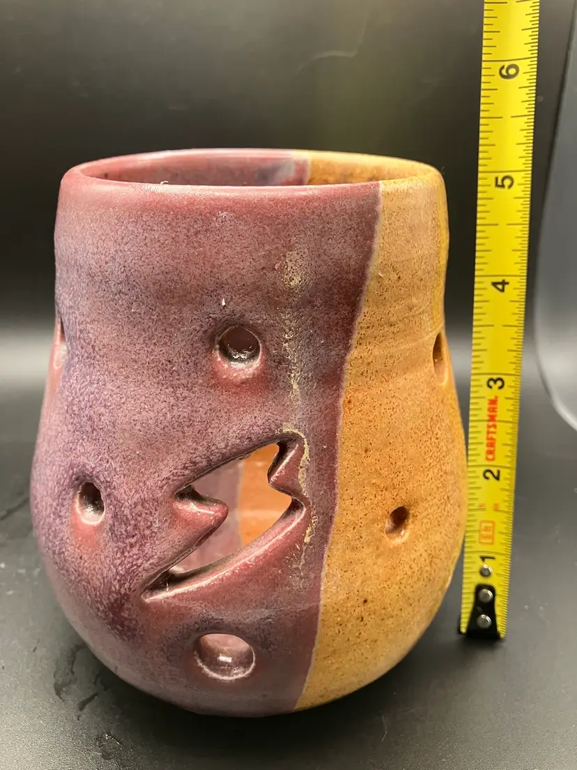 Candle holder is signed on the bottom. Small part where tan glaze missed - see pic. Good condition. Check shipping- will refund overages.