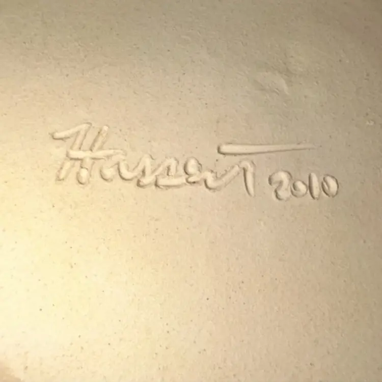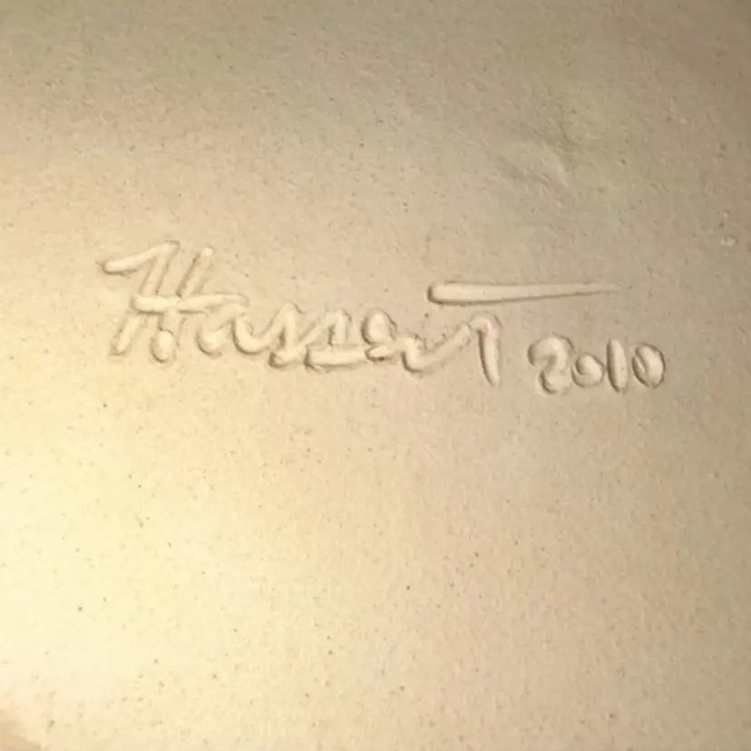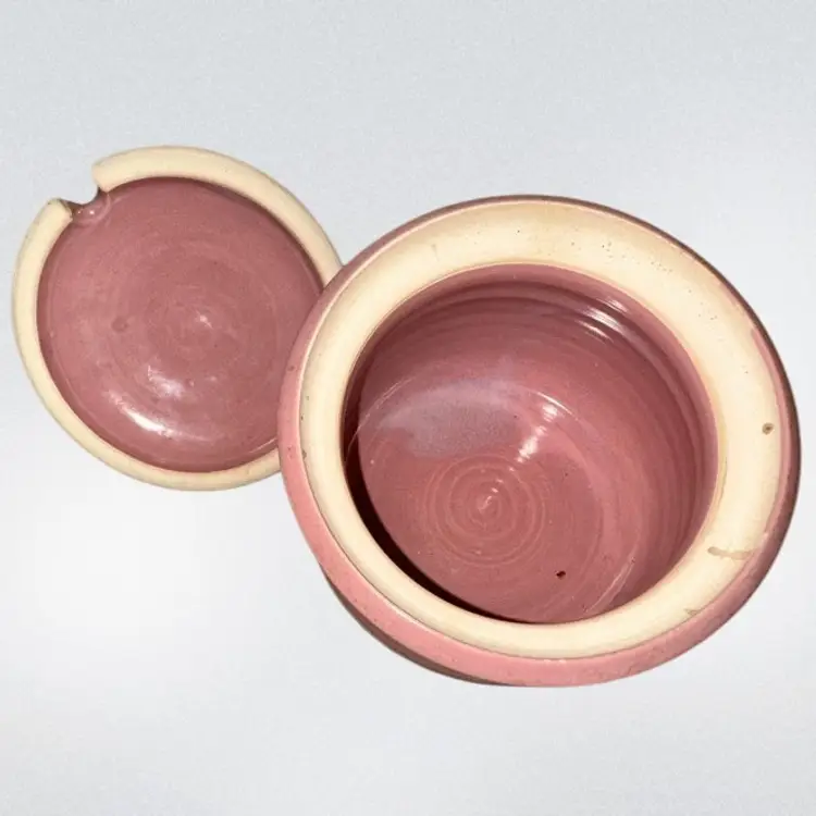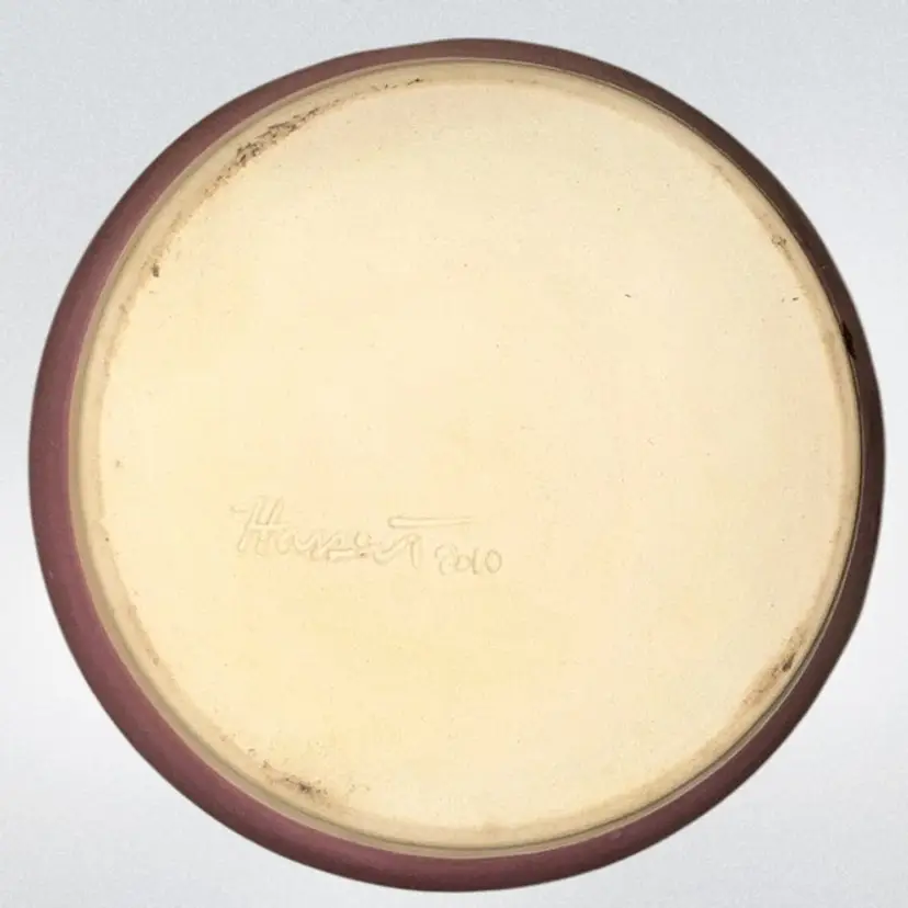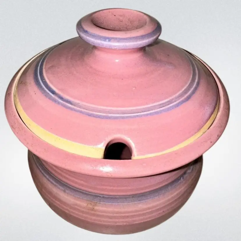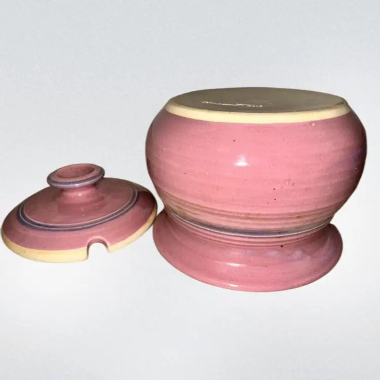Pottery Pink Bluish Purple Striped Jam Jar /Sugar Bowl Signed Hassert 2010 Excellent condition! Measures 4 1/4 inches tall, with lid by 4 3/4 inches in diameter