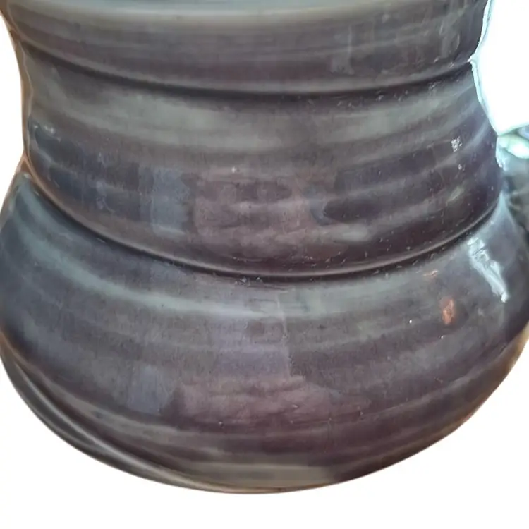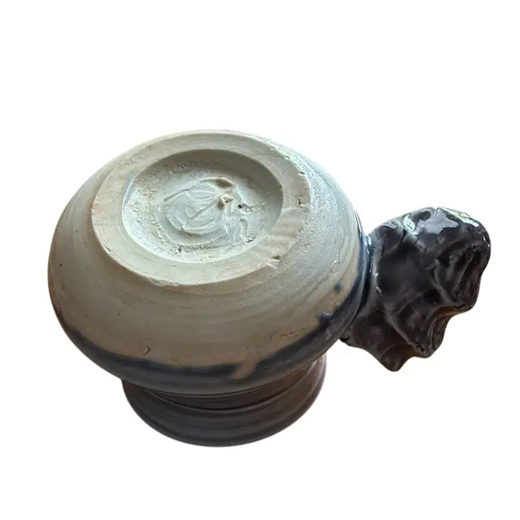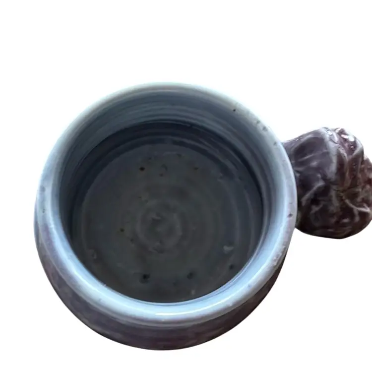 Unique studio pottery, signed, right handed grip mug. Perfectly fits right hand grip. Beautiful glaze in light blue and purple. No chips or cracks. Measures 4” tall by 6.5” wide.