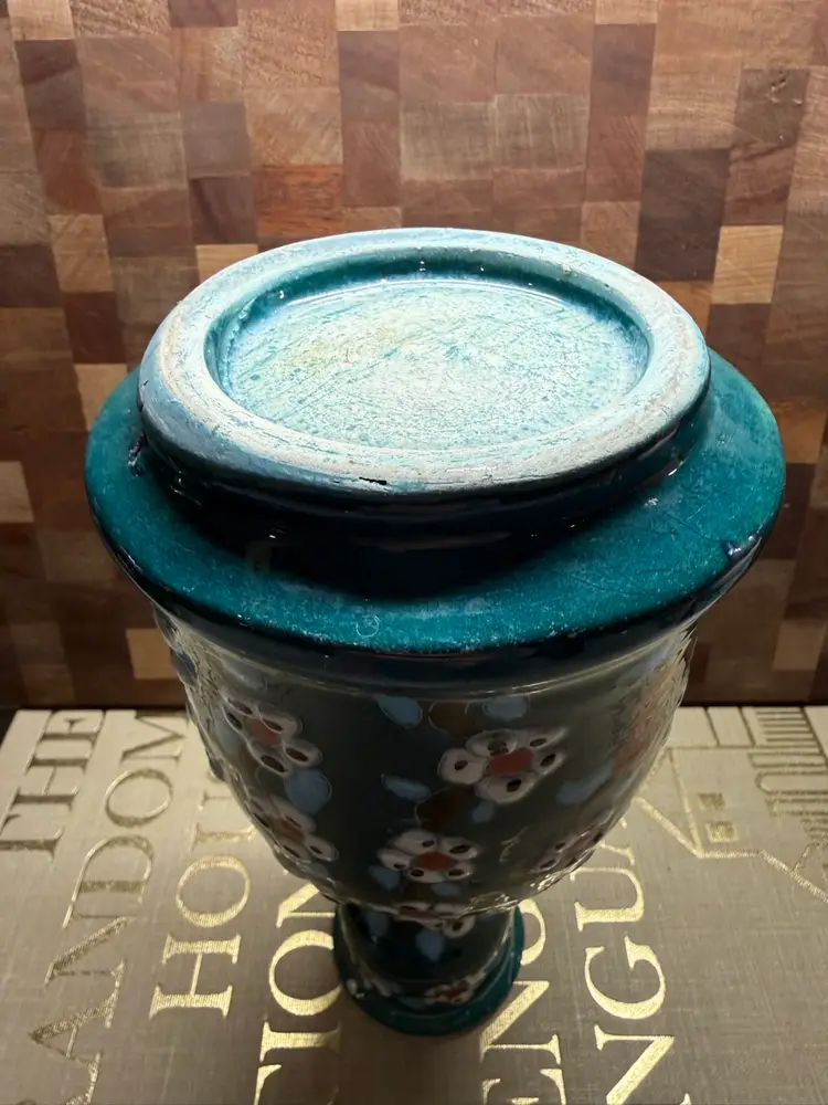 Pottery Stoneware Vase. This beautiful piece features a rich teal or dark blue base glaze adorned with hand-painted floral patterns in white, red, and light blue. A classic example of Polish folk art craftsmanship.