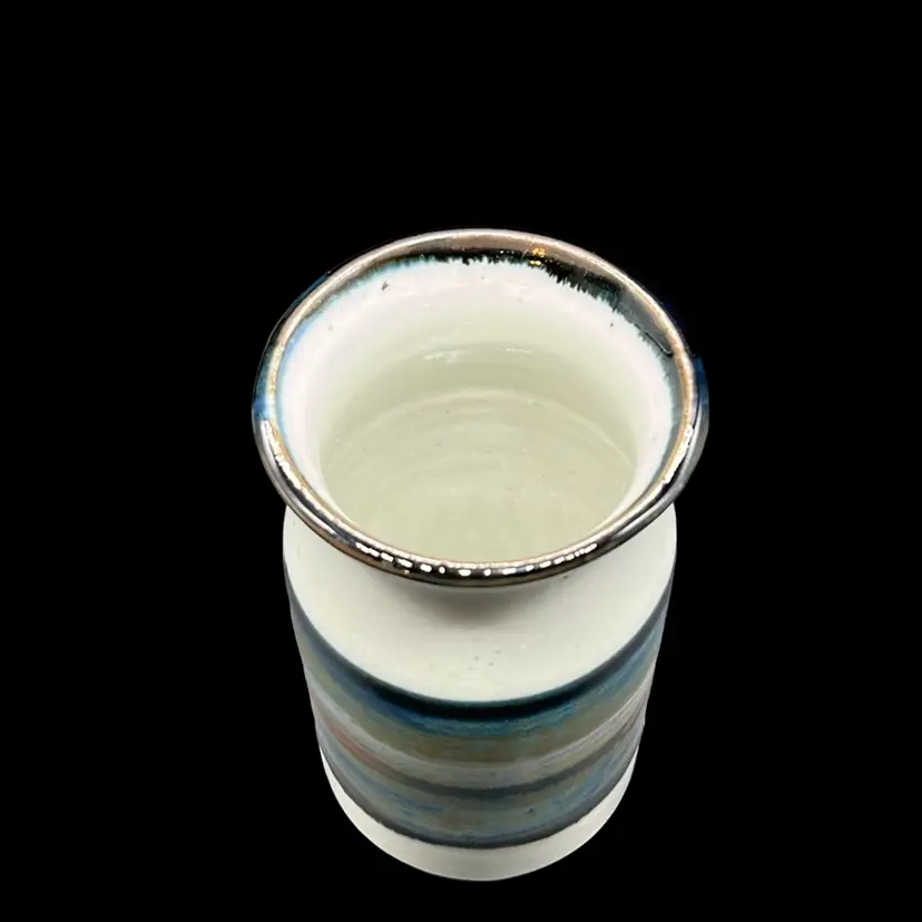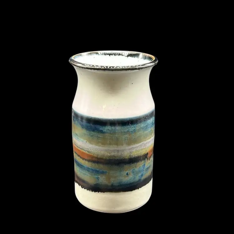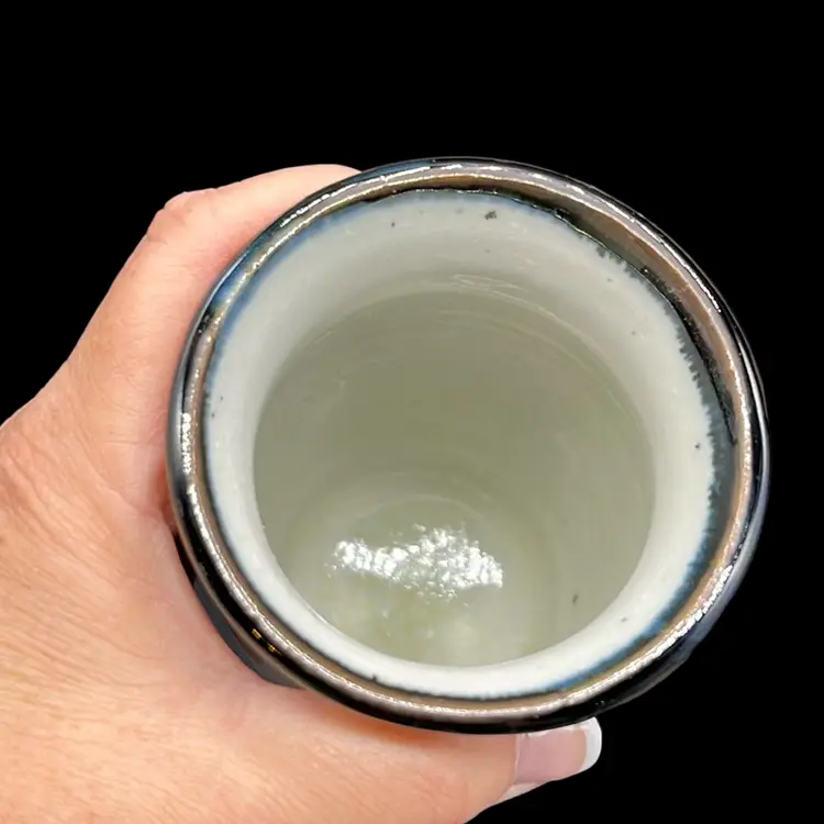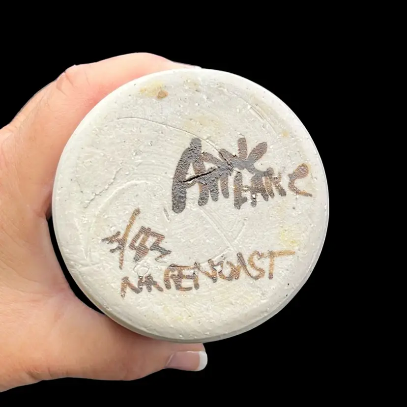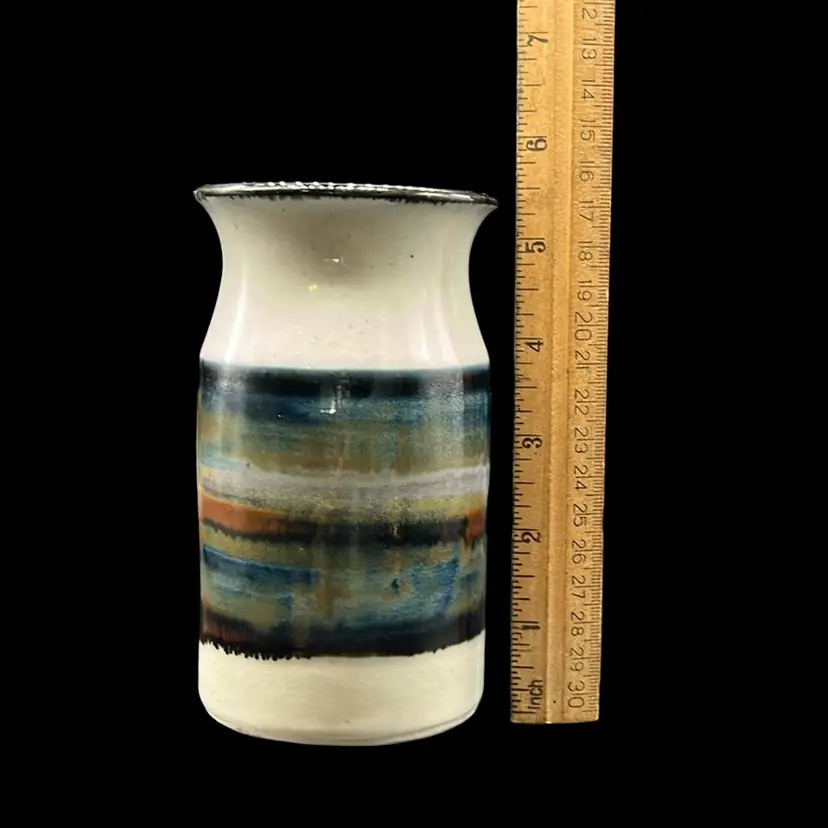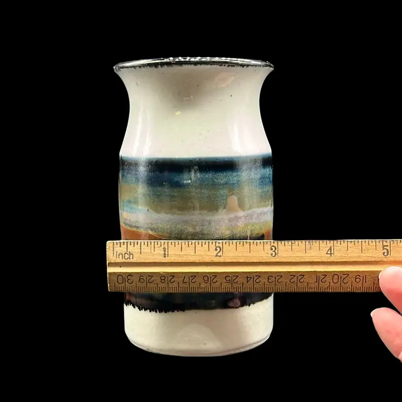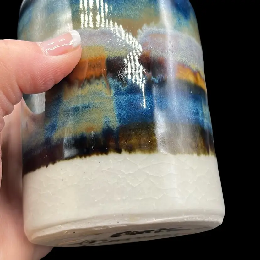 Pottery Vase or Vessel w/ dark blue and hints of burnt orange and multiple earth tones. Showing crazing throughout. No chips or cracks. Signed by artist, 3/83 Bill Nagengast. Approx. 5.5” h x 3”d