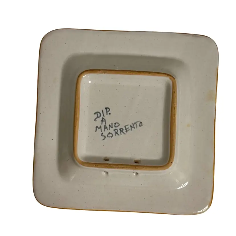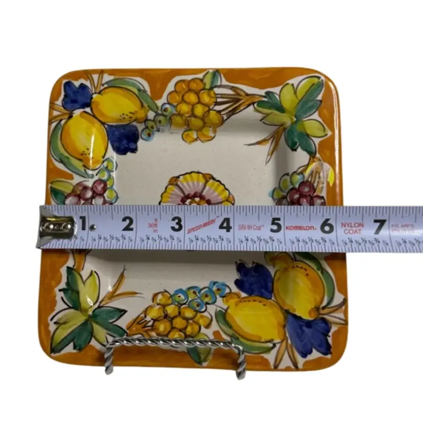 Pottery wall art/trinket tray hand painted fruit, signed. Holes in back for hanging. Stand not included.