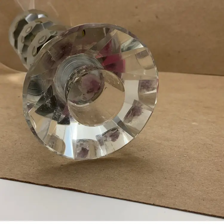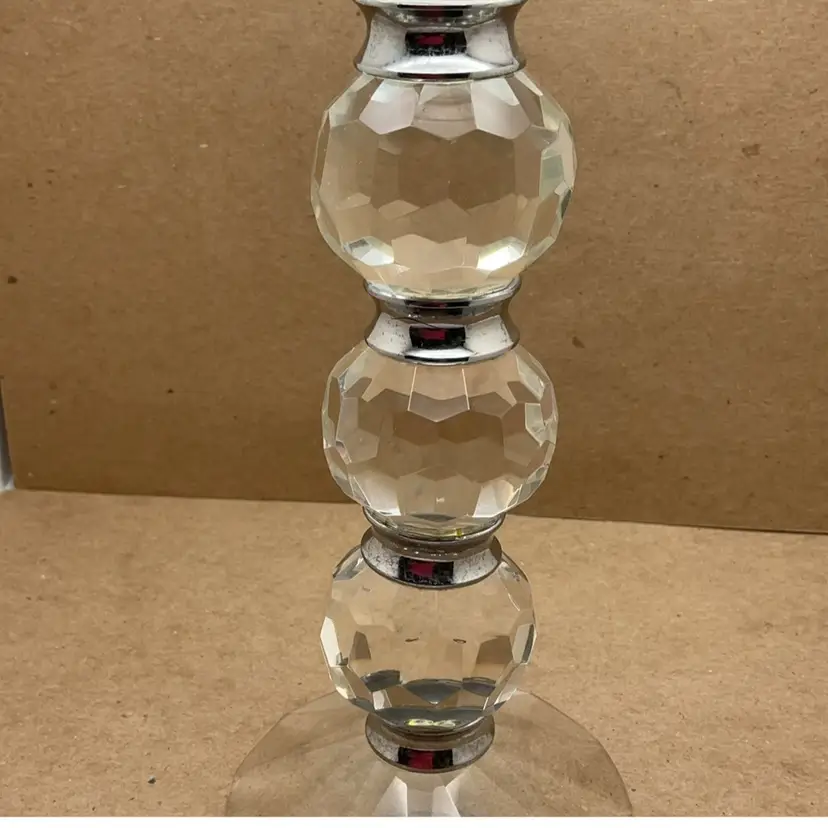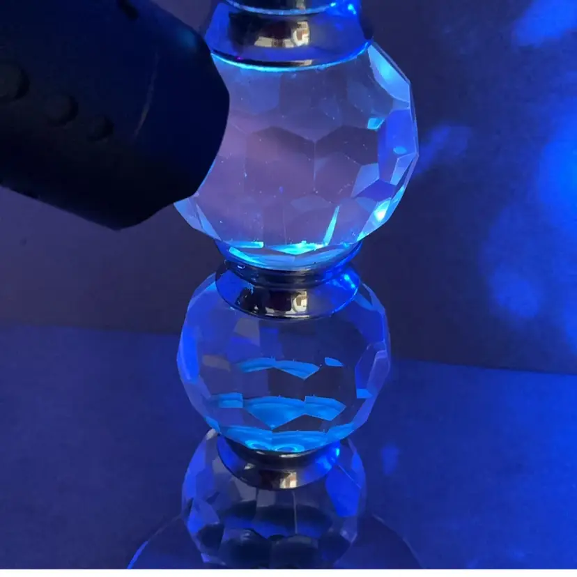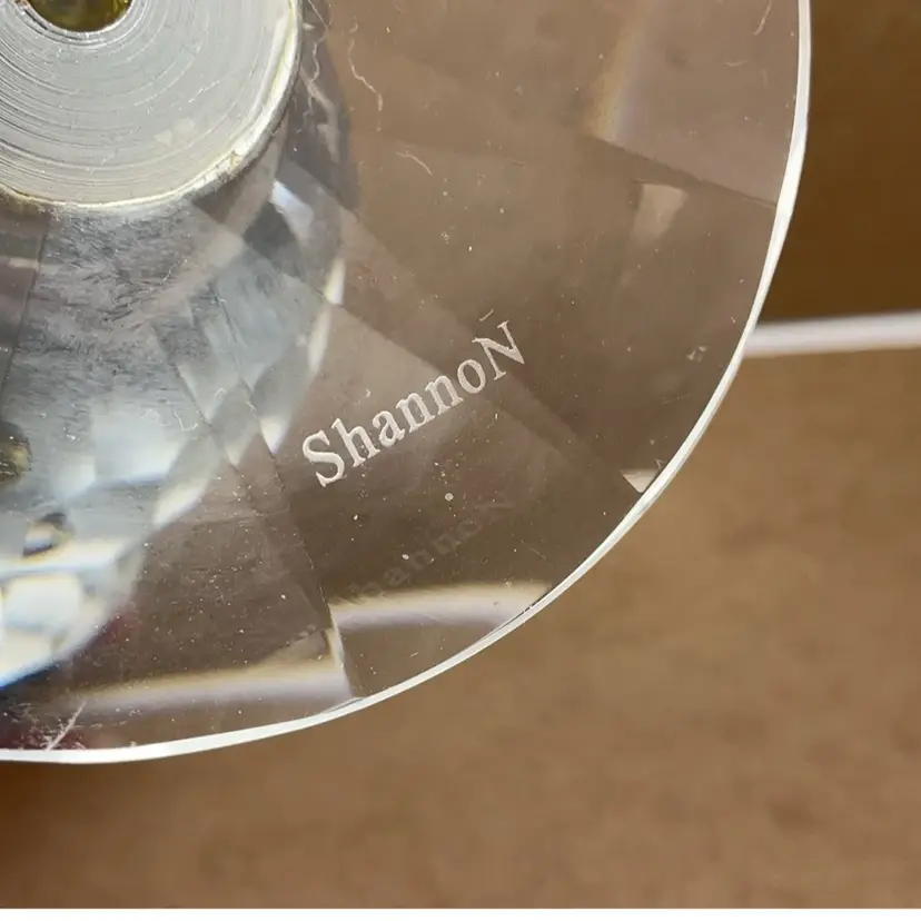 Fair pre-owned condition with no chips or cracks; some residual wax in the cup. Some metal discoloration; needs a deep cleaning. Etched Shannon on the bottom. Glows orange.