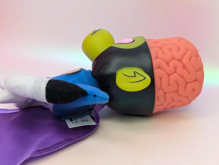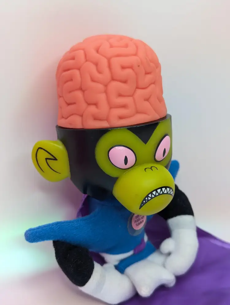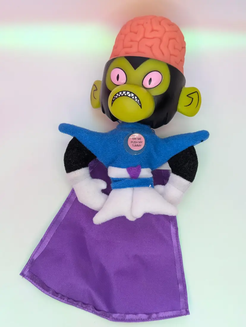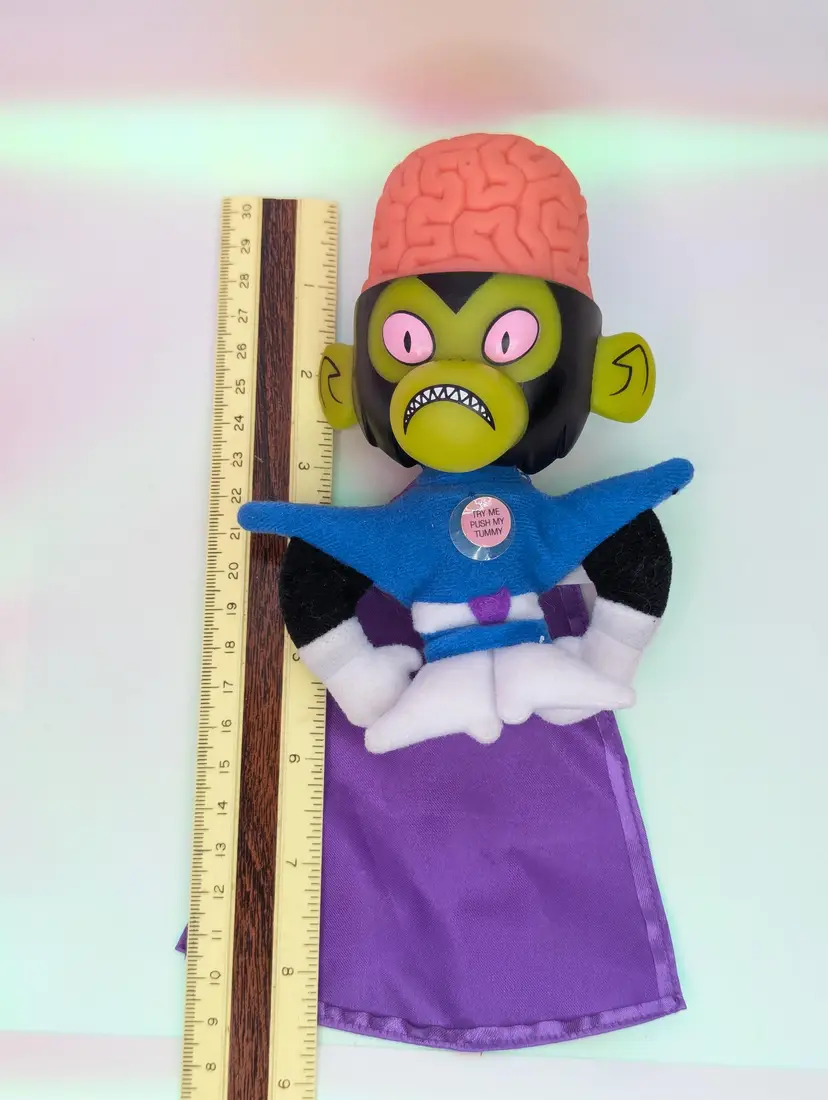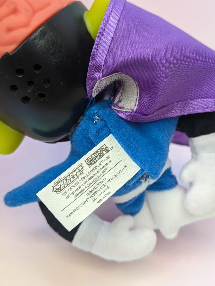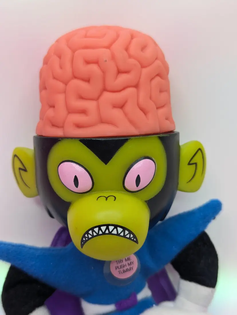 Vintage Powerpuff Girls Super Sounds Mojo Jojo Talking Plush/Vinyl Figure from 1999- Works, New batteries have been added! He is in good condition, light play wear. Comes with the original purple cape, still attache with a string around his neck so that it doesn't get lost. Has the push my tummy tag also still attached. when pushed he says a few things. Plush body has no rips, tears, holes or stains, cape is also in good condition. He is missing his hat, but head is made from a vinyl/plastic has some light marks/paint rubs. Battery compartment has been lightly cleaned, there was some very light corrosion, but after cleaning and new batteries, He works! Great figure for any collector and makes for a great craft project tool too! Comes from a smoke free, pet friendly home. Item has been lightly cleaned and stored away