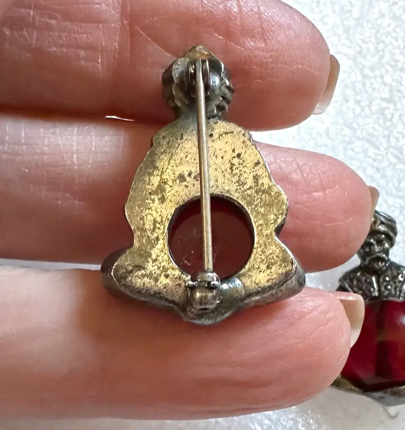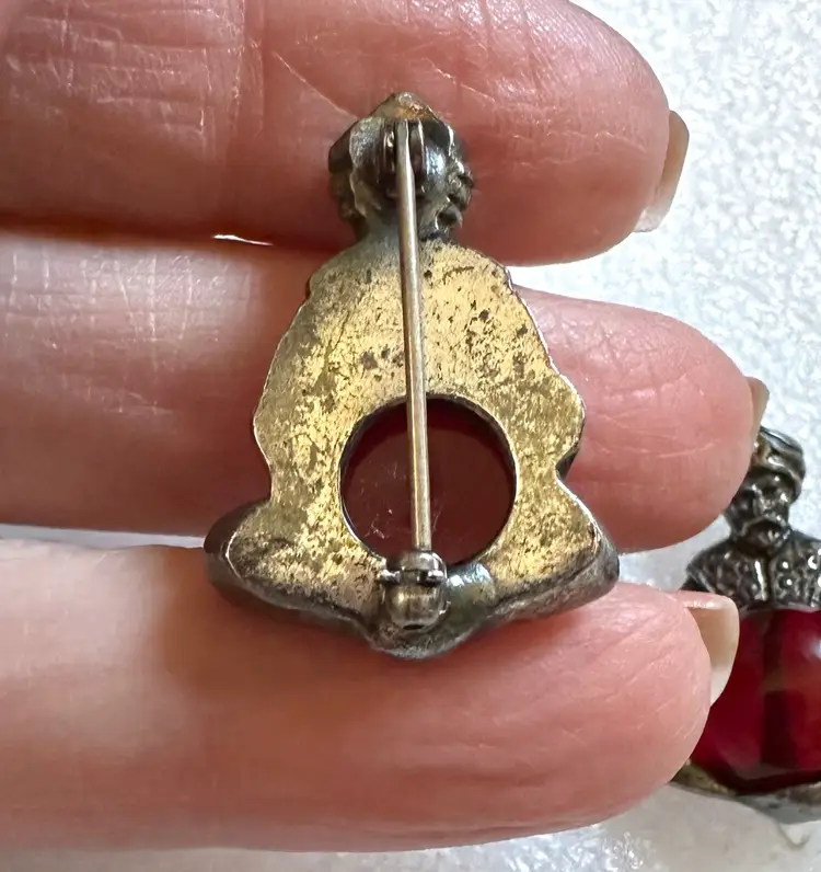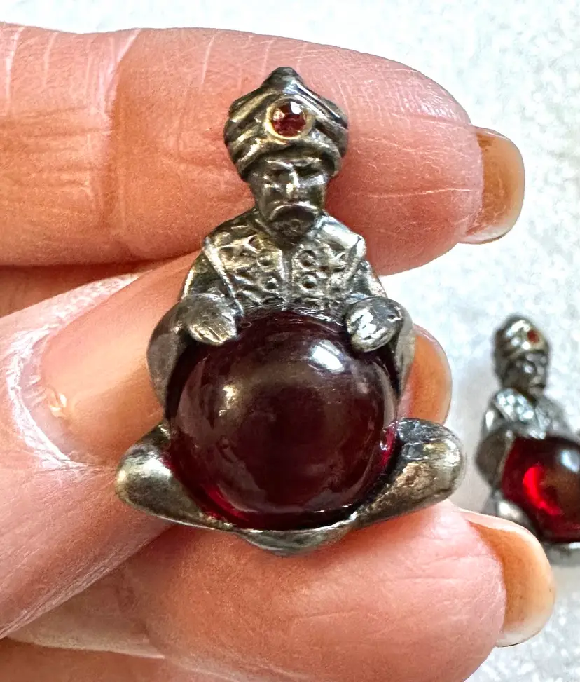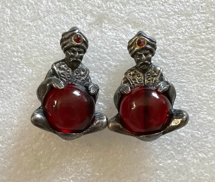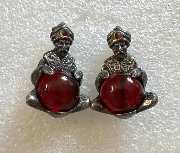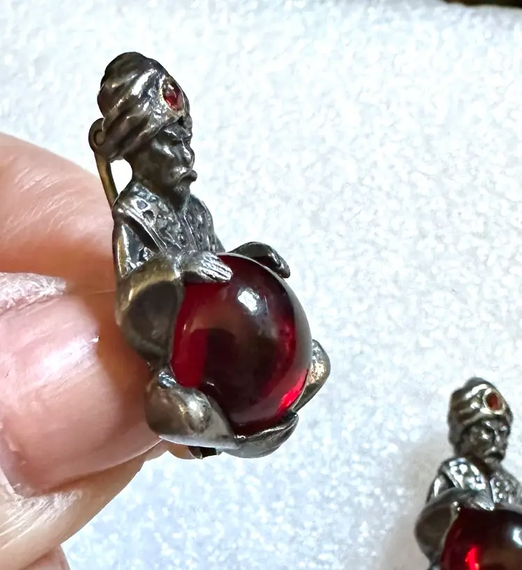 Neat pair of jelly belly fortune teller scatter pins attributed to Korda, Thief of Baghdad line. They measure 1.25” x .75”. Very good condition.