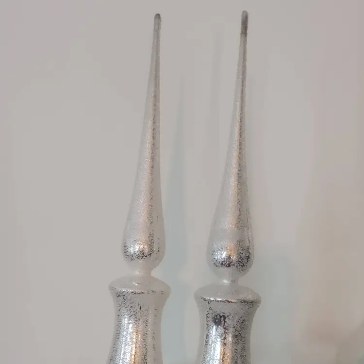 This is a pair of gorgeous mercury glass finials, covered in "snow." They are approximately 16" tall, in great condition with a little darkening of the glass on the tips.