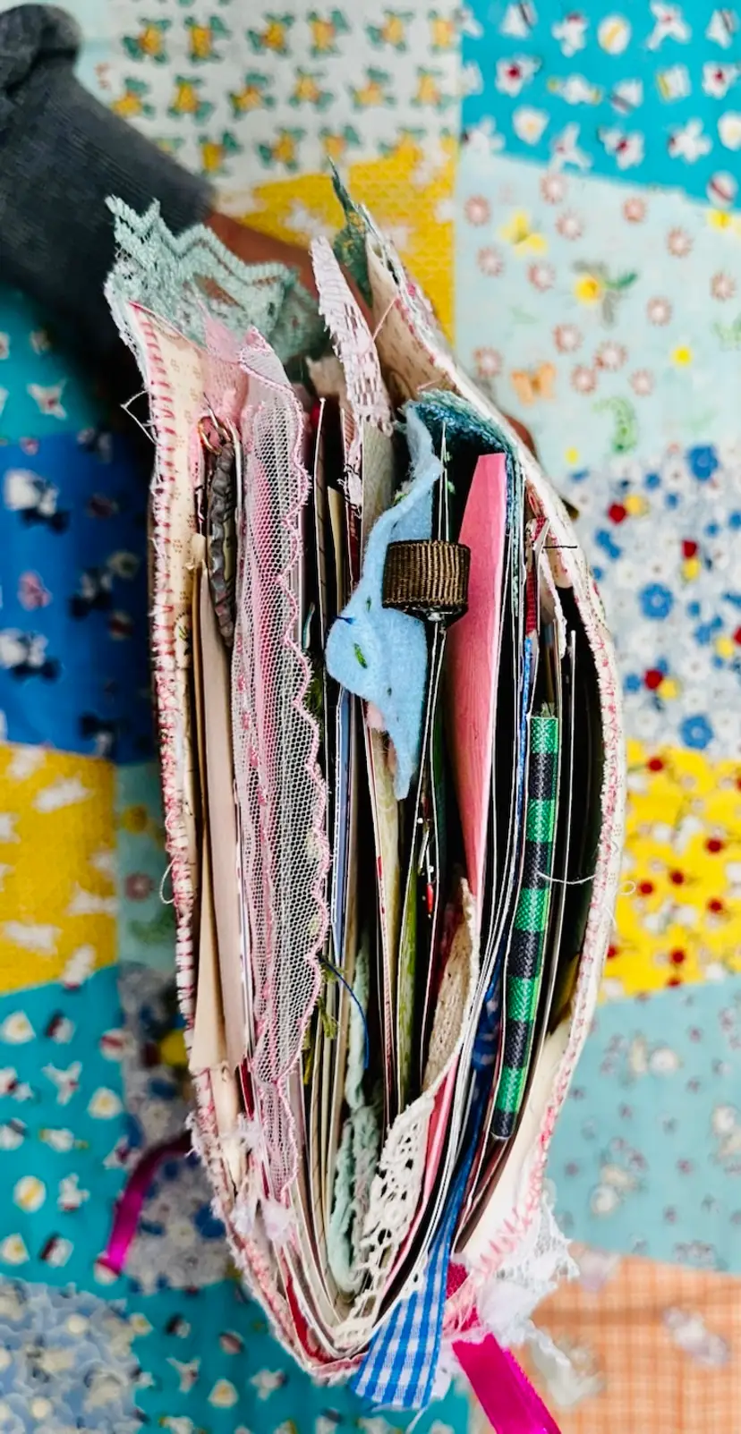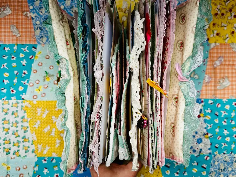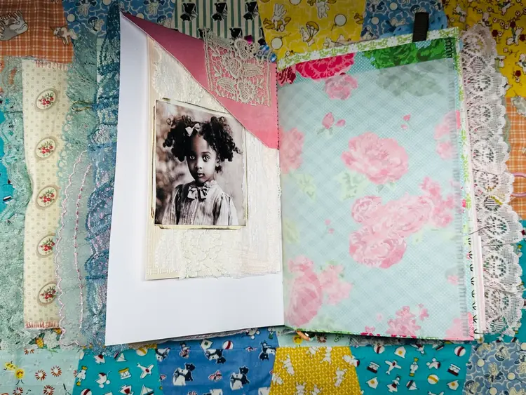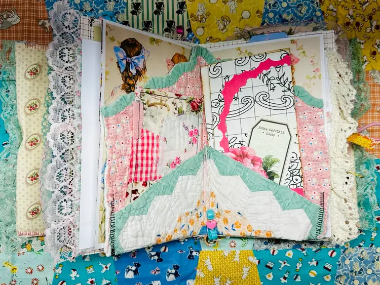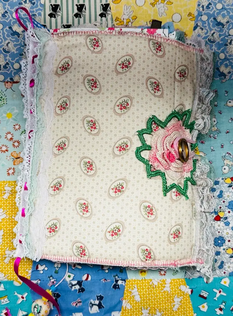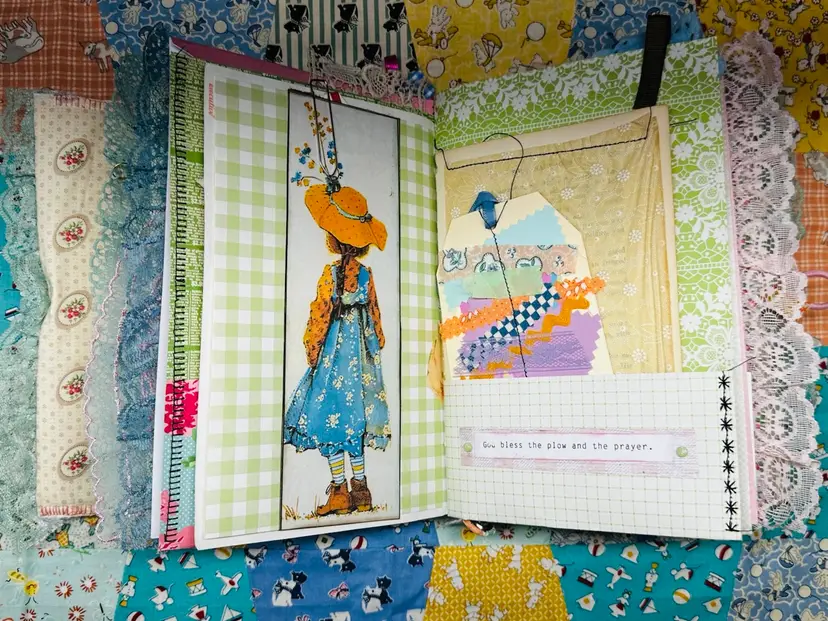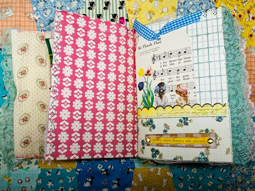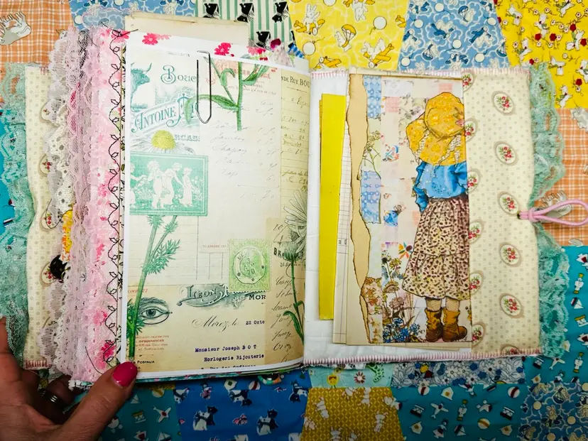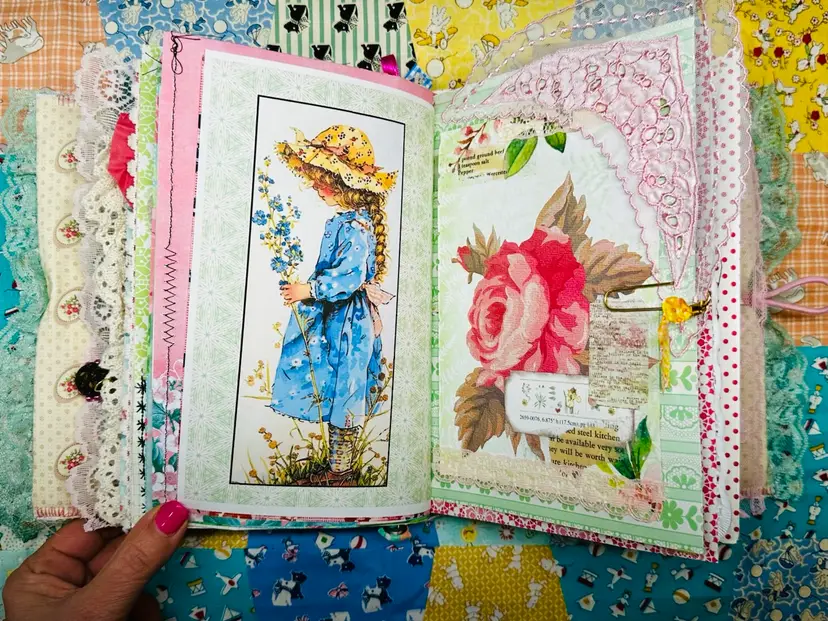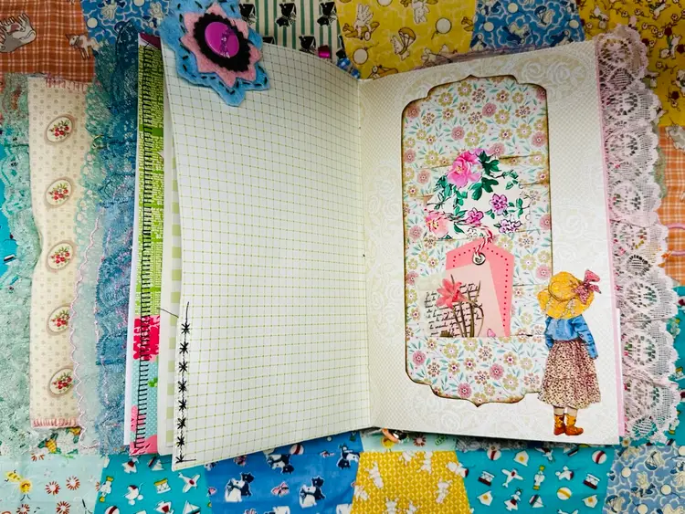 • Patchwork fabric cover • Lace edging and layered trims • Textured textile details • Vintage-inspired color palette • Journaling pages with character and warmth • Interactive elements and tuck spots