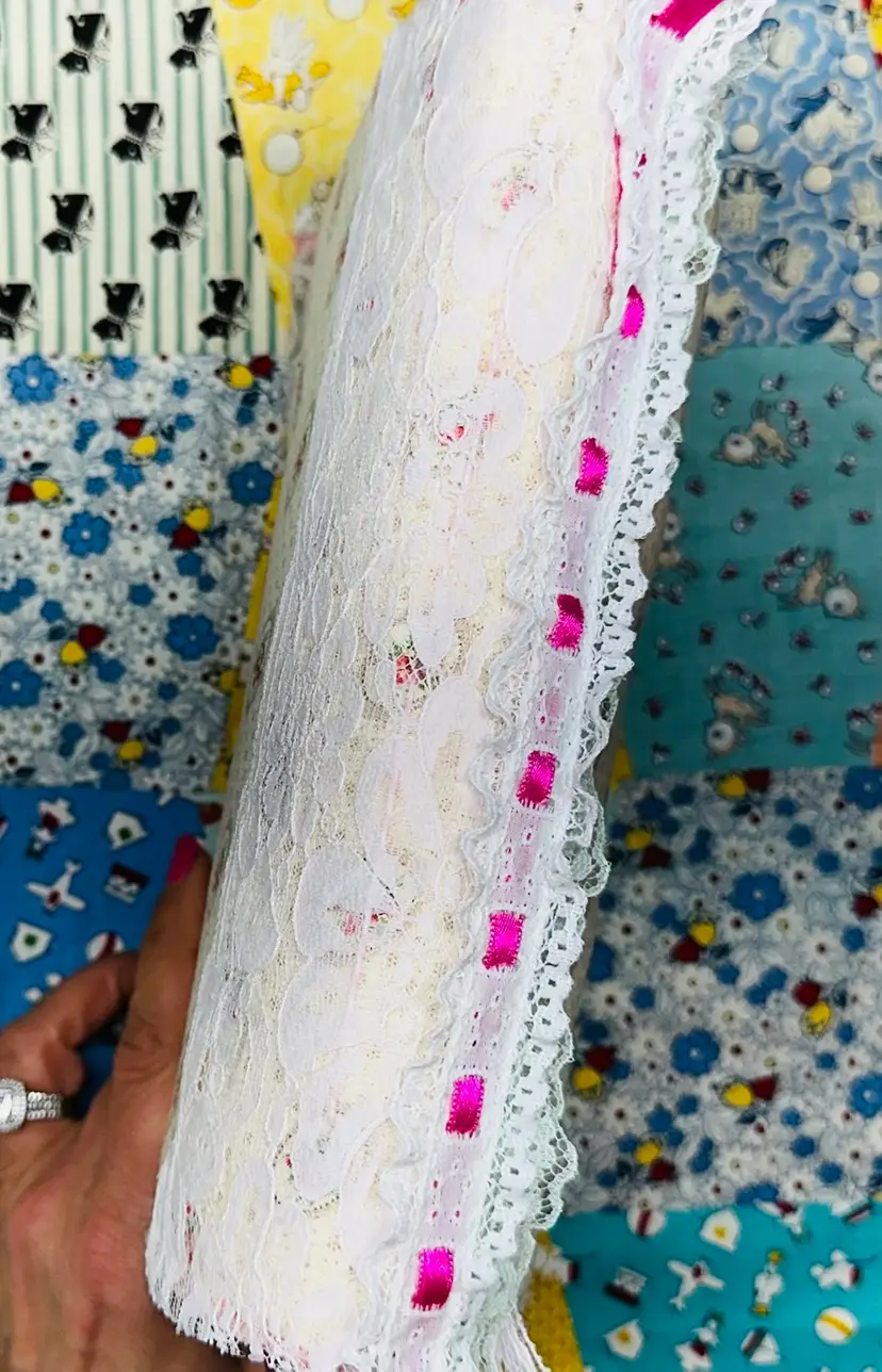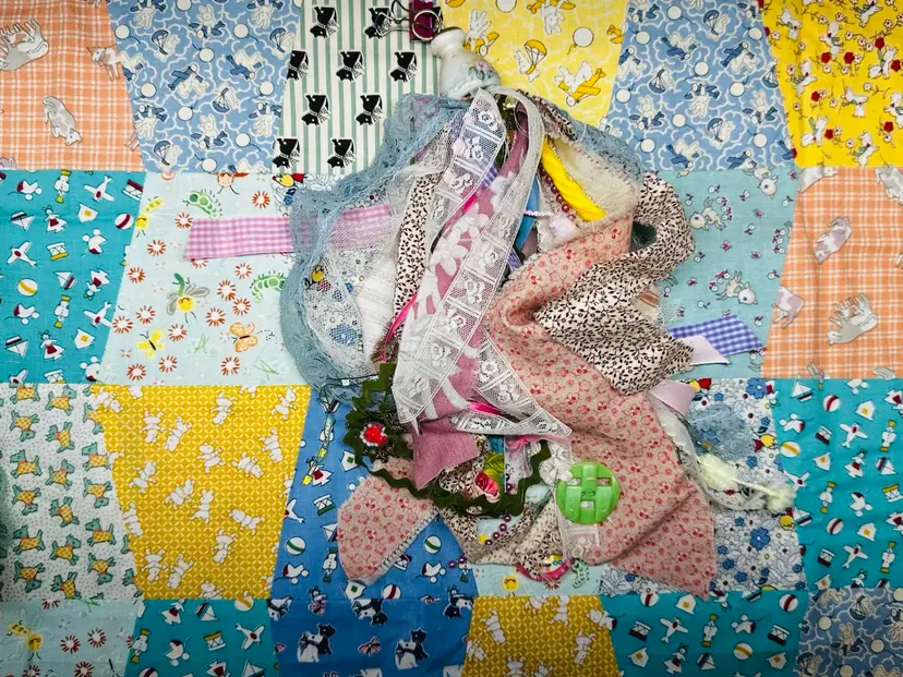 This piece leans into the beauty of gathered fabrics and quilted inspiration — a tribute to simple days and handmade treasures.