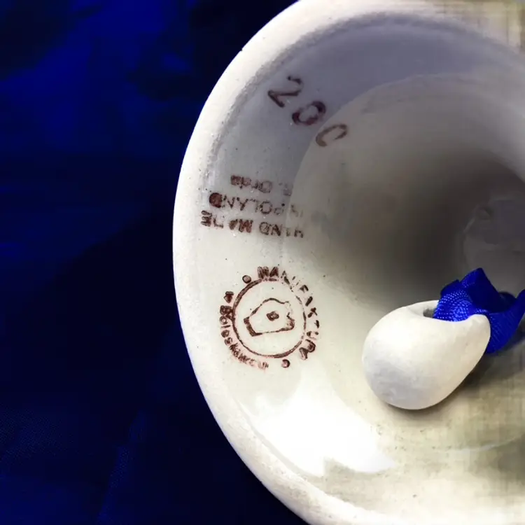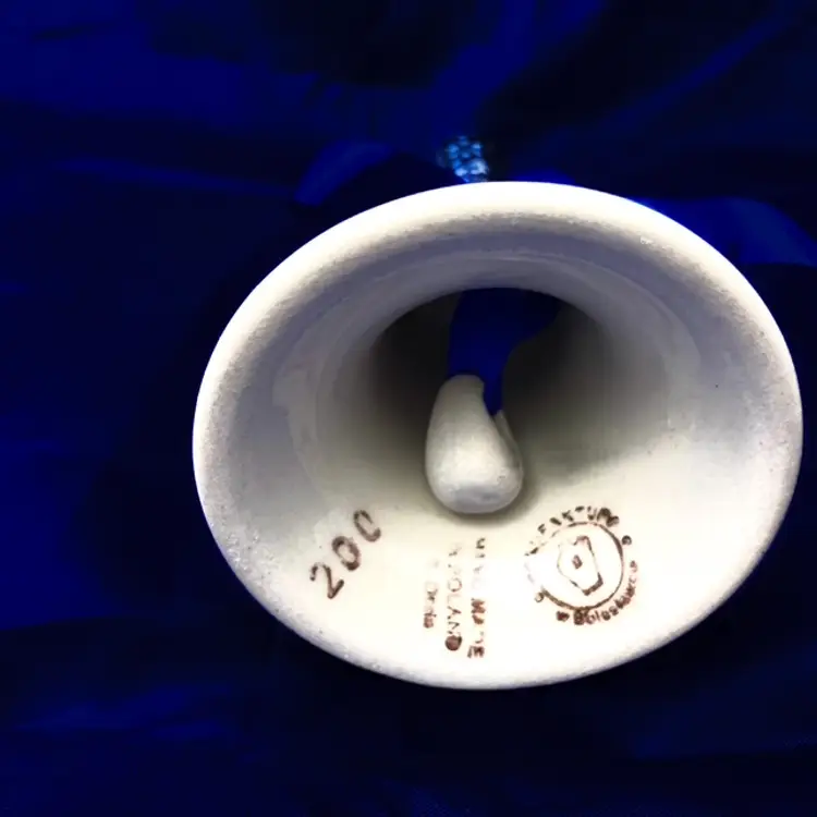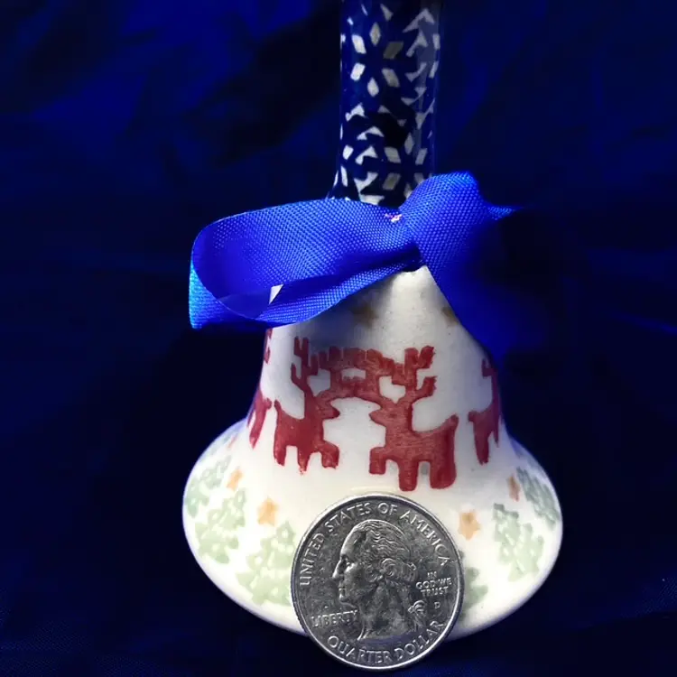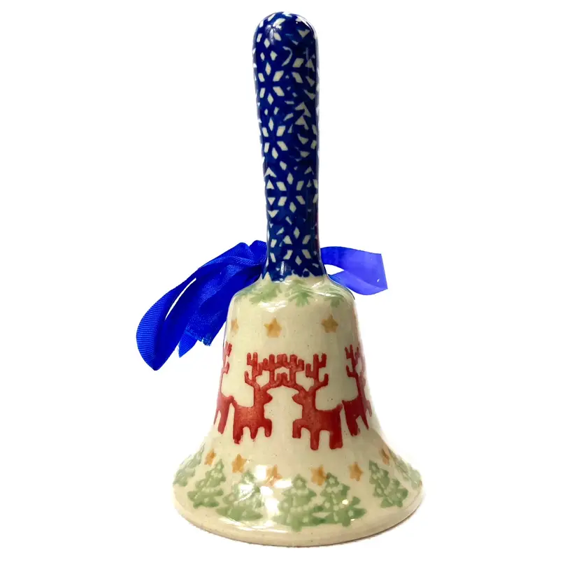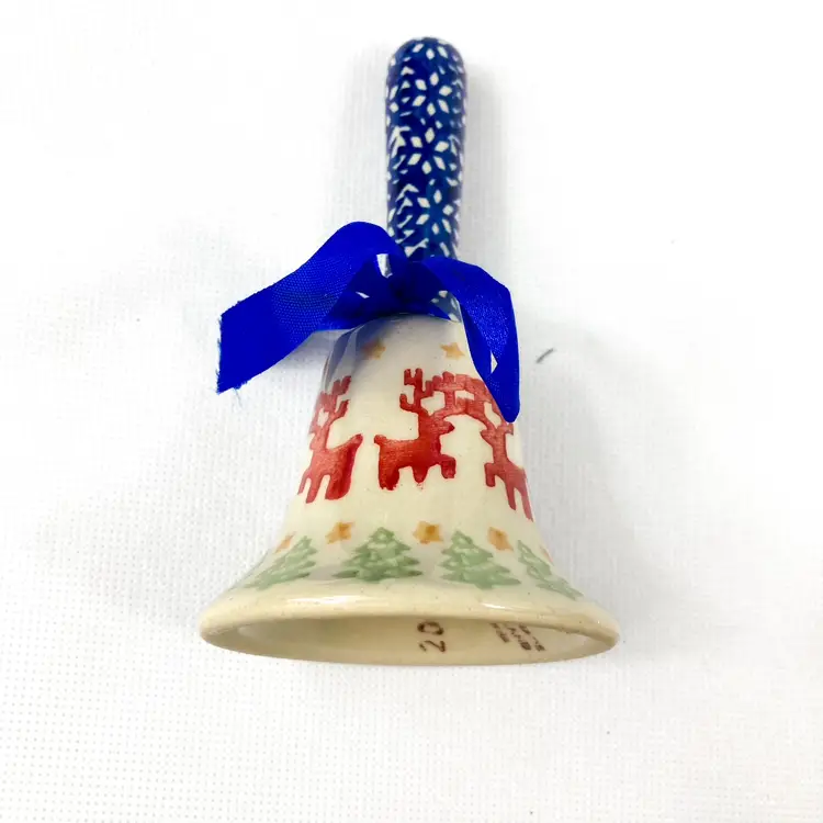 Hand-painted prancing reindeer with pine boughs, stars anddesign decorates this 4.75" Bell with clapper. Handle is about 2.5" tall and the base is 2.5" across. Pre-owned in great condition- no chips or cracks. Please note, hand crafted items may have dimples, roughs and/or fine scratches. mar1309