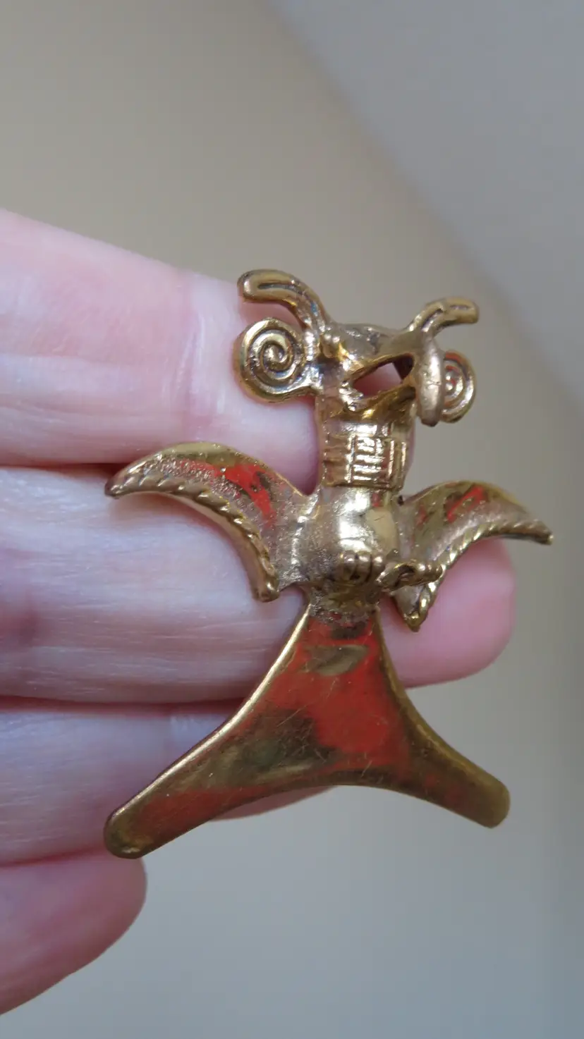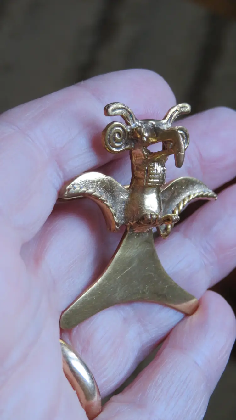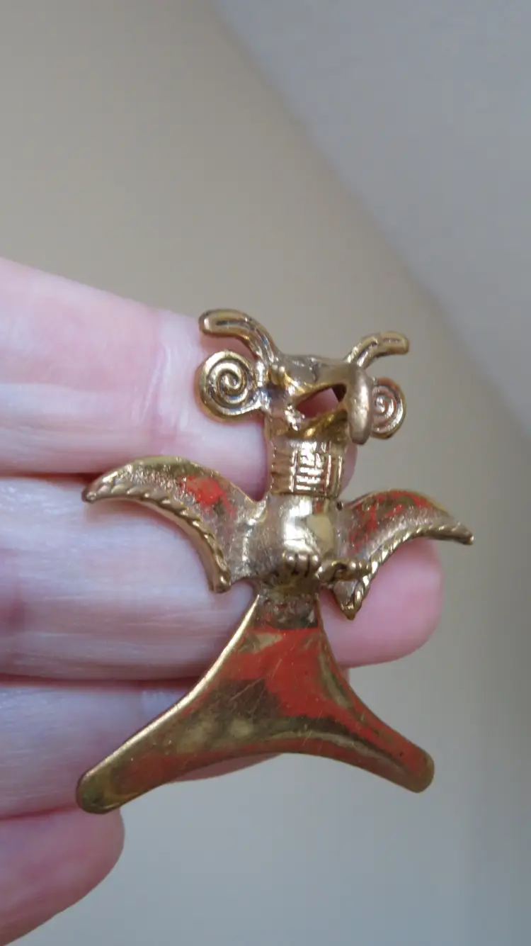 Crafted with intricate detail, this Chiriki Tumbaga Gold Condor brooch captures the essence of Pre-Columbian artistry. Its design is a homage to the majestic eagles revered by ancient Latin American cultures, rendered in a timeless style that transcends epochs. The piece is a reproduction that pays tribute to the rich heritage of Costa Rica, meticulously fashioned to showcase the hallmark aesthetics of its indigenous peoples.The brooch's metallic sheen and complex craftsmanship belie its origins, as it is the product of an unknown maker, adding an element of mystery to its already intriguing allure. Whether as an addition to a collection or a stand-alone statement piece, this brooch is sure to be a conversation starter, seamlessly blending with both contemporary and traditional ensembles.