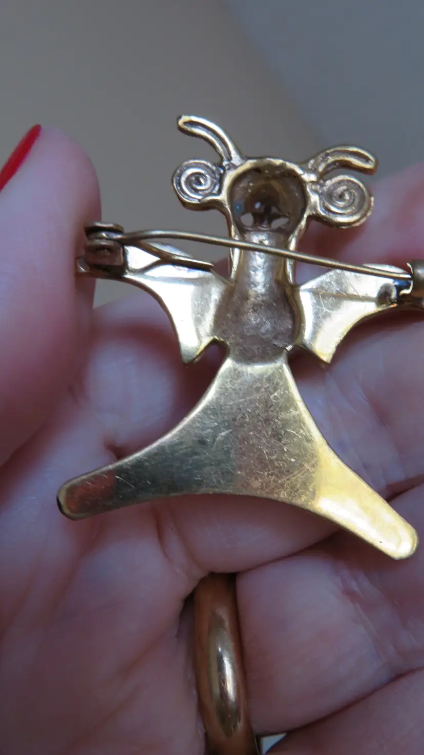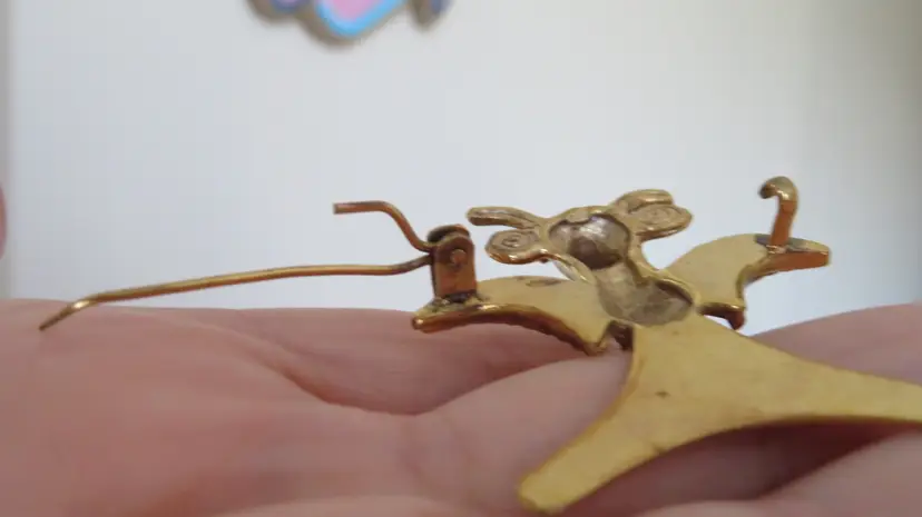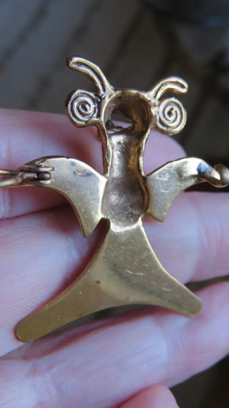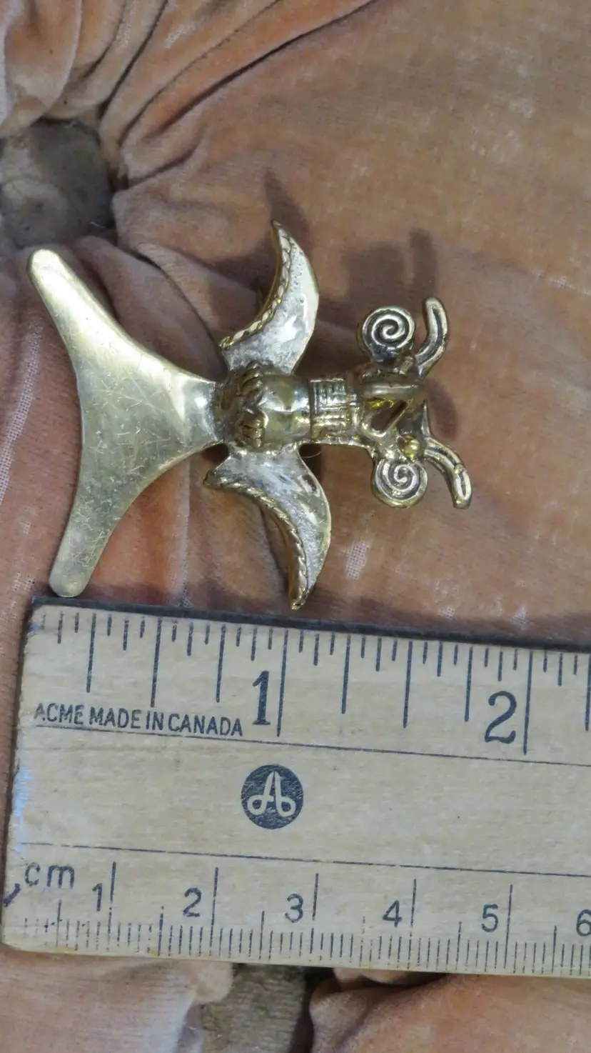 Crafted with intricate detail, this Chiriki Tumbaga Gold Condor brooch captures the essence of Pre-Columbian artistry. Its design is a homage to the majestic eagles revered by ancient Latin American cultures, rendered in a timeless style that transcends epochs. The piece is a reproduction that pays tribute to the rich heritage of Costa Rica, meticulously fashioned to showcase the hallmark aesthetics of its indigenous peoples.The brooch's metallic sheen and complex craftsmanship belie its origins, as it is the product of an unknown maker, adding an element of mystery to its already intriguing allure. Whether as an addition to a collection or a stand-alone statement piece, this brooch is sure to be a conversation starter, seamlessly blending with both contemporary and traditional ensembles.