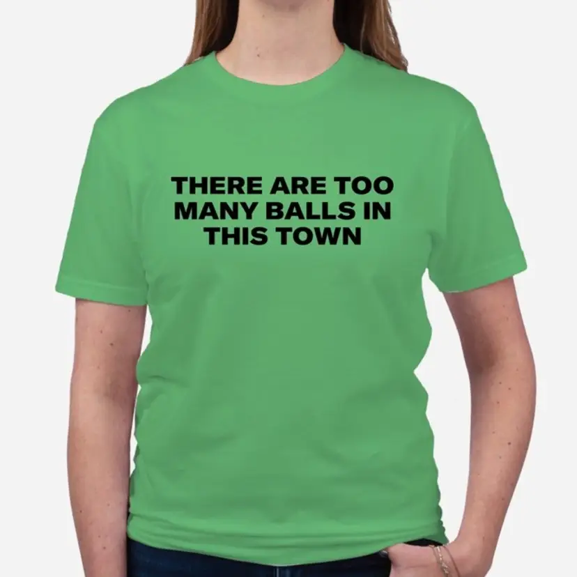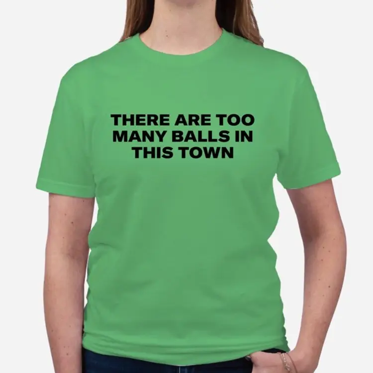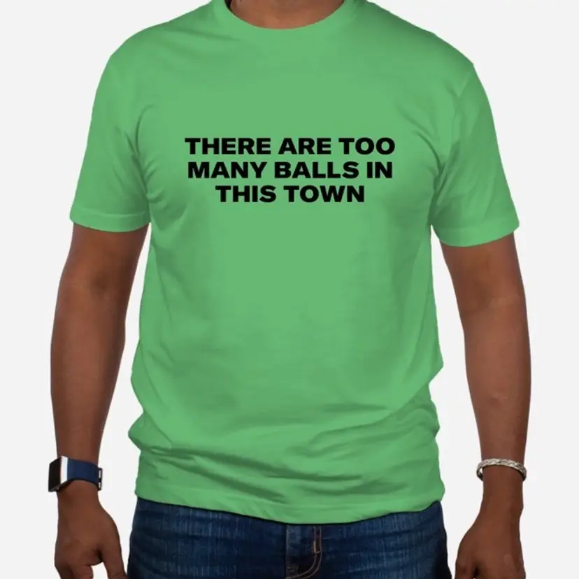 These are custom green t-shirts with the words THERE ARE TOO MANY BALLS IN THIS TOWN in black in the upper center. See photo for size guide and visual of shirt