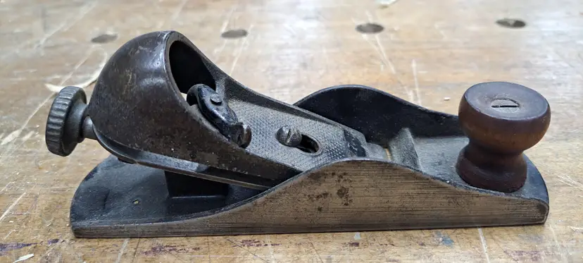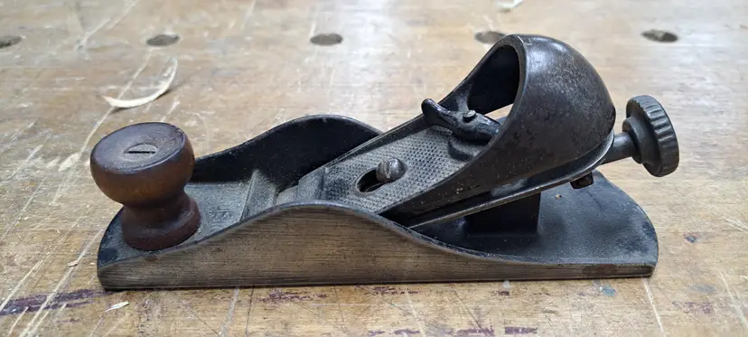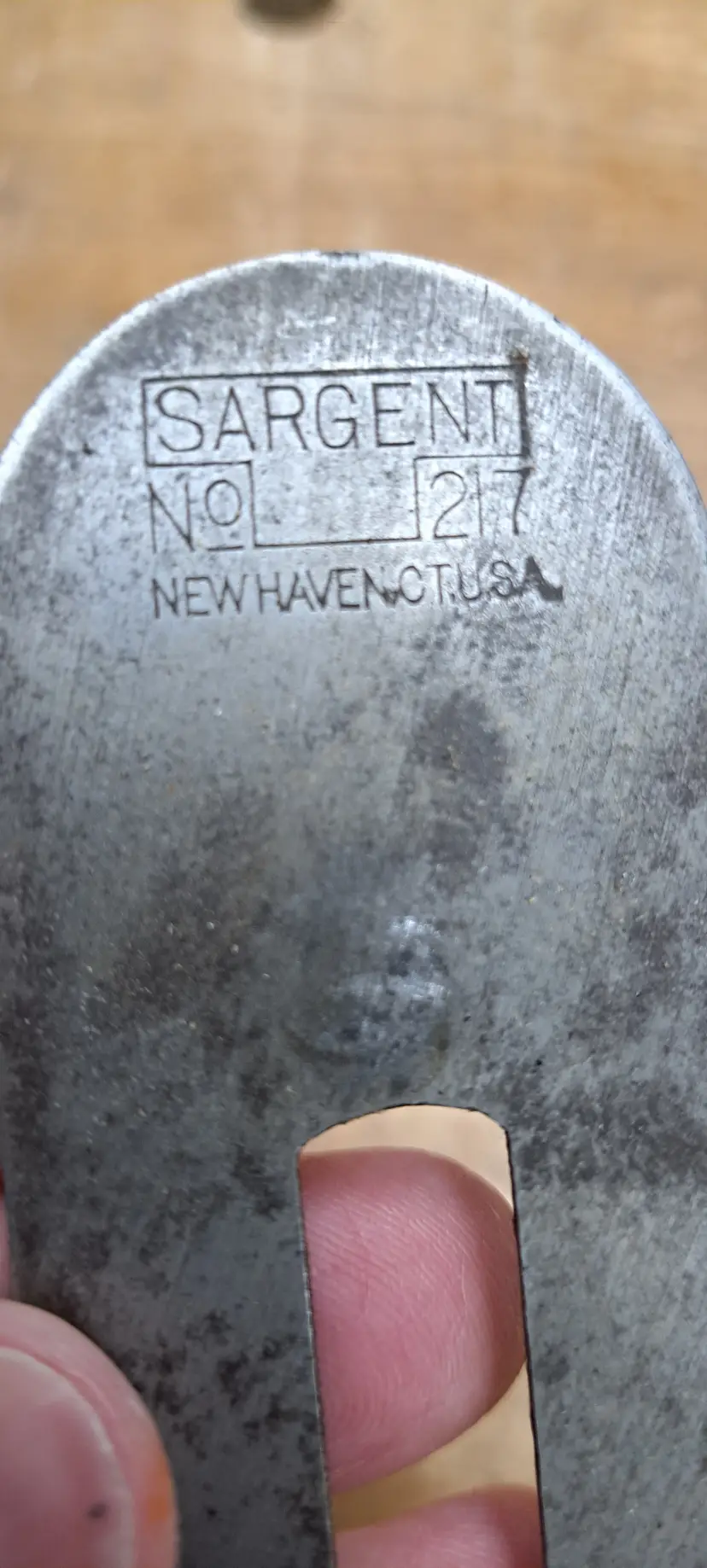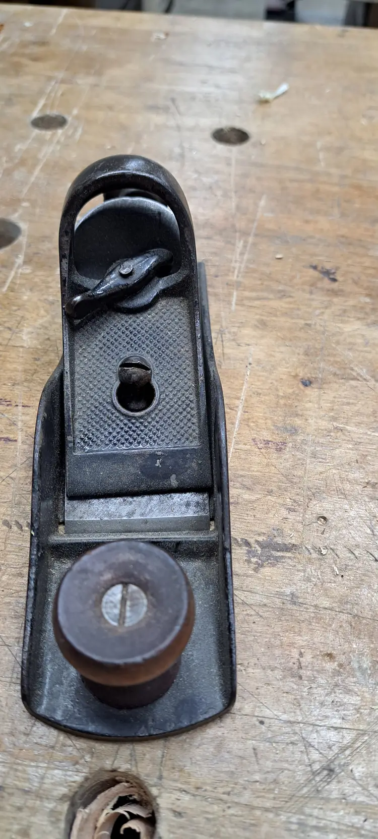 Sargent Block Plane No 217. Iron Stamp puts it from 1919-1942. The knob wood also will narrow it down, but I do not know exotic wood types. Needs restored