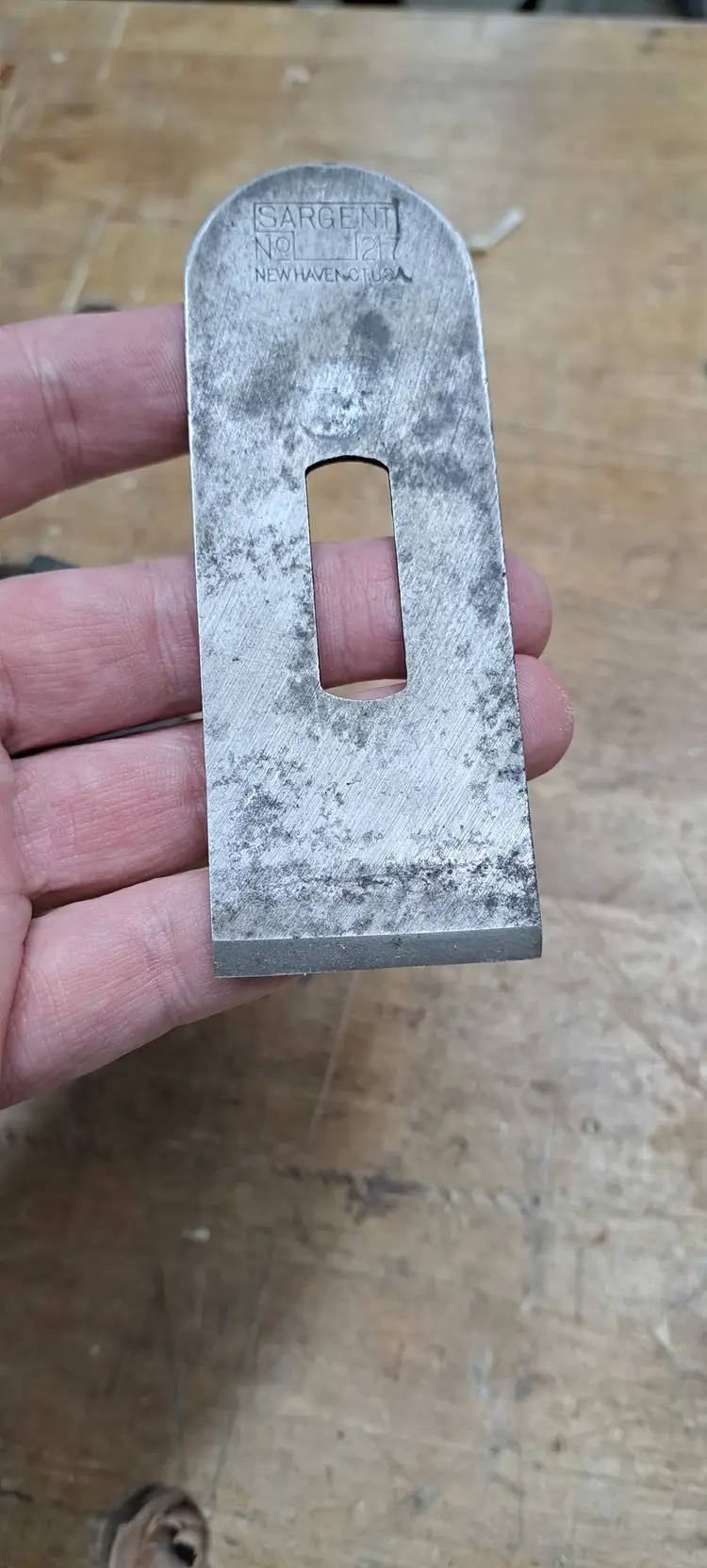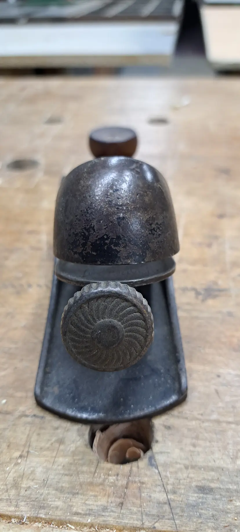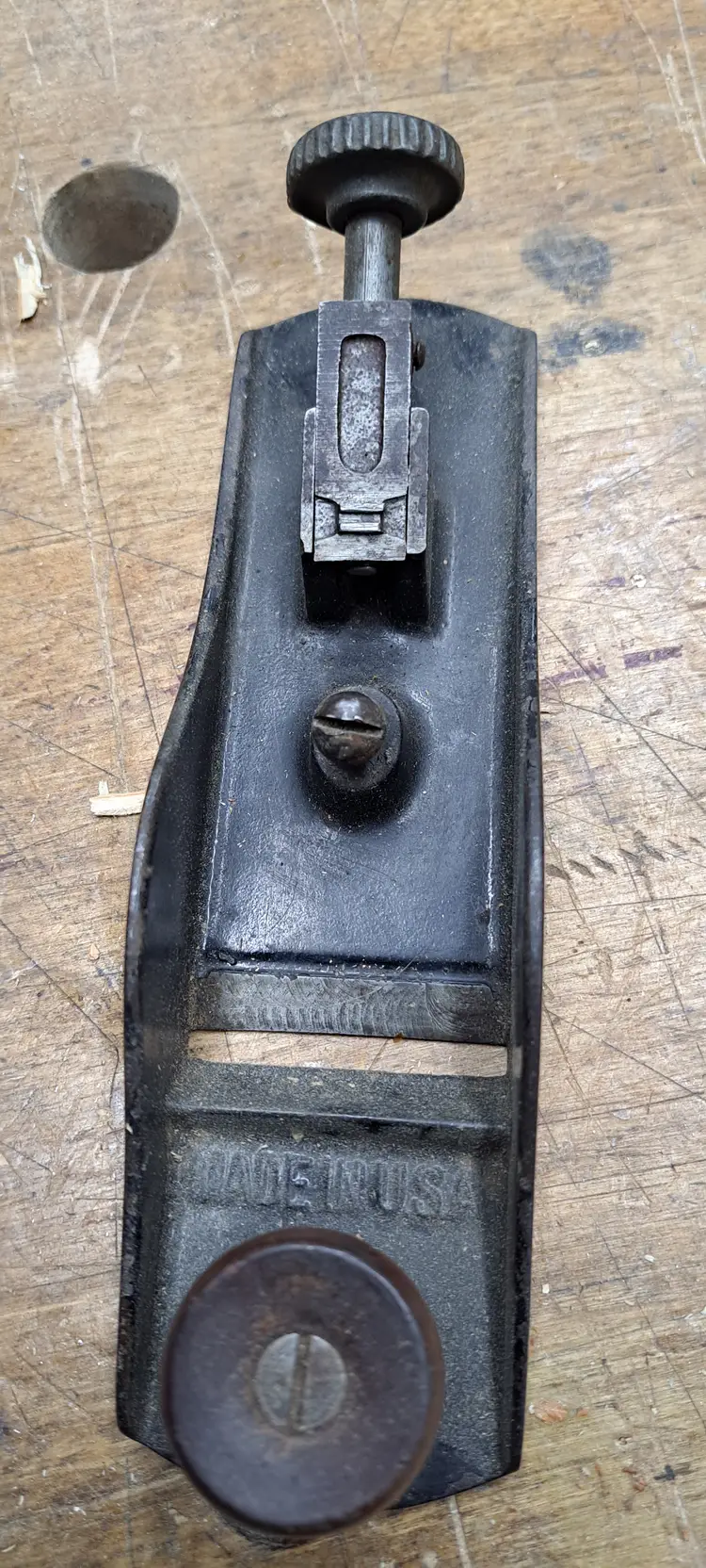 Sargent Block Plane No 217. Iron Stamp puts it from 1919-1942. The knob wood also will narrow it down, but I do not know exotic wood types. Needs restored