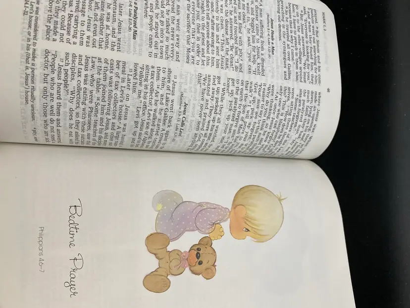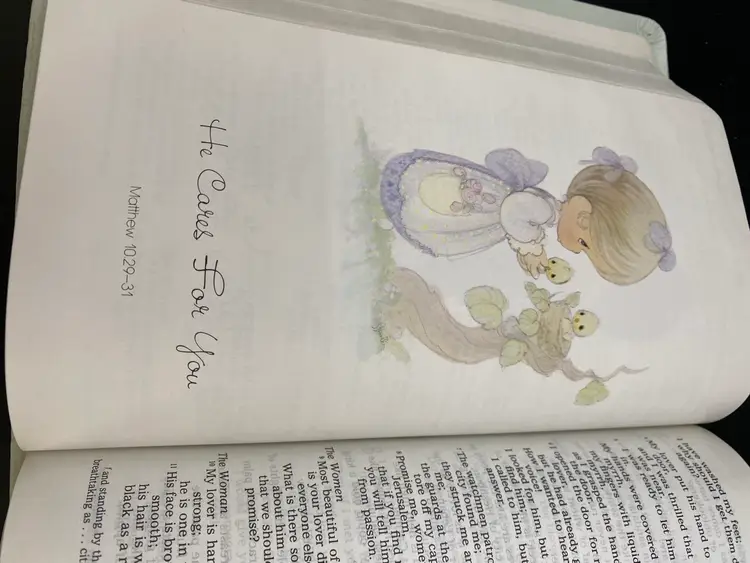 Light blue precious moments Bible 1987 Excellent condition with the cutest little note written by a child inside” love is a choice”.