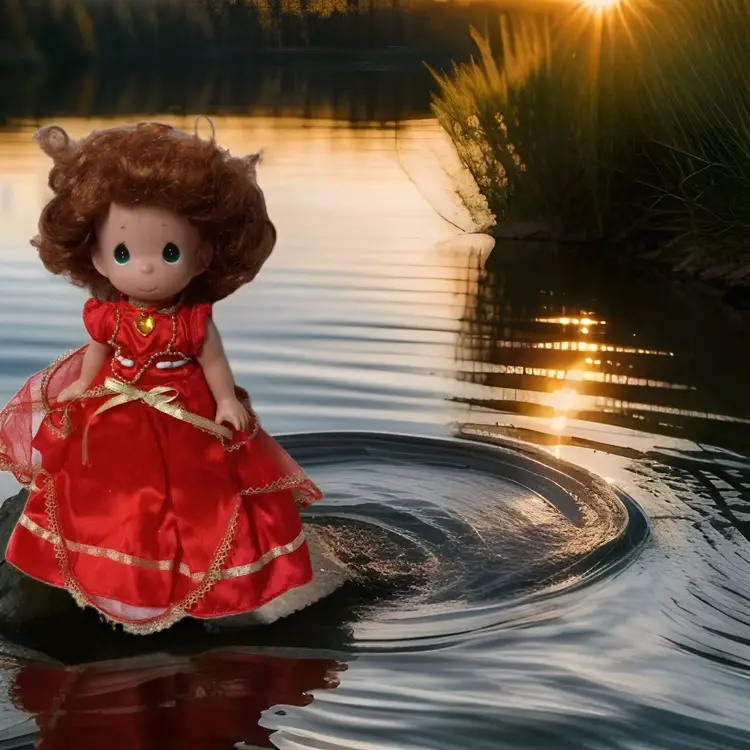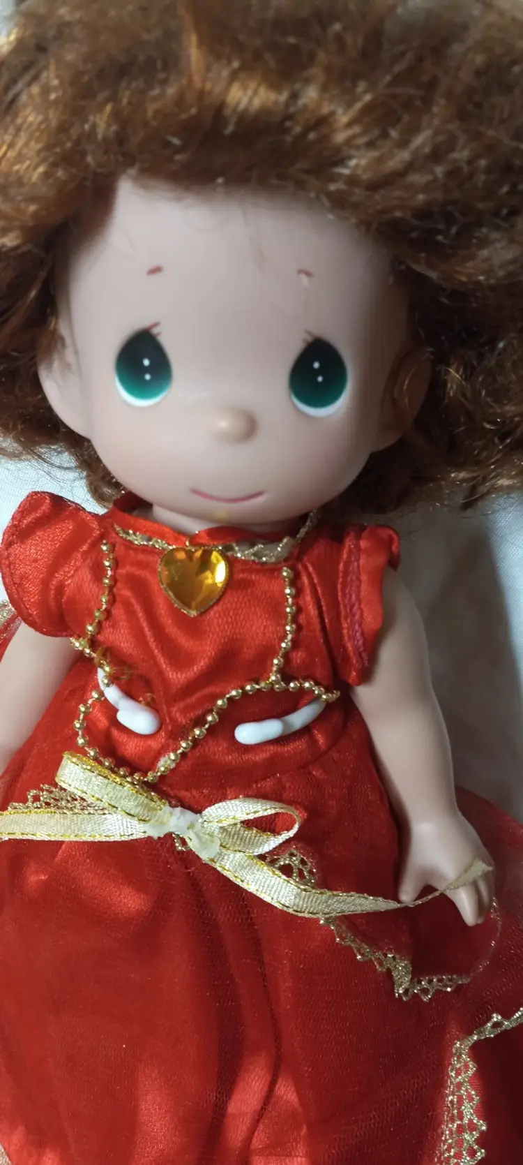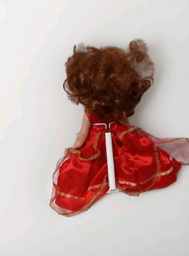Vintage , Red dress , golden necklace on a stand Red hair , 12 inches in height