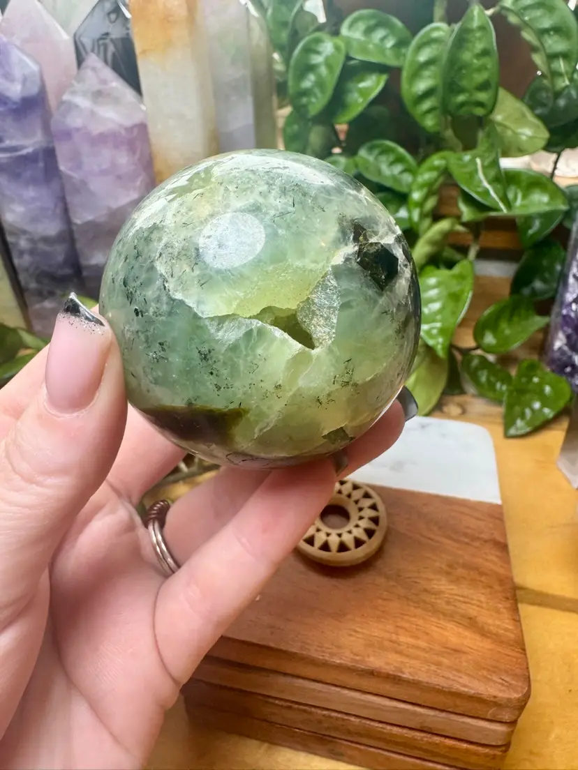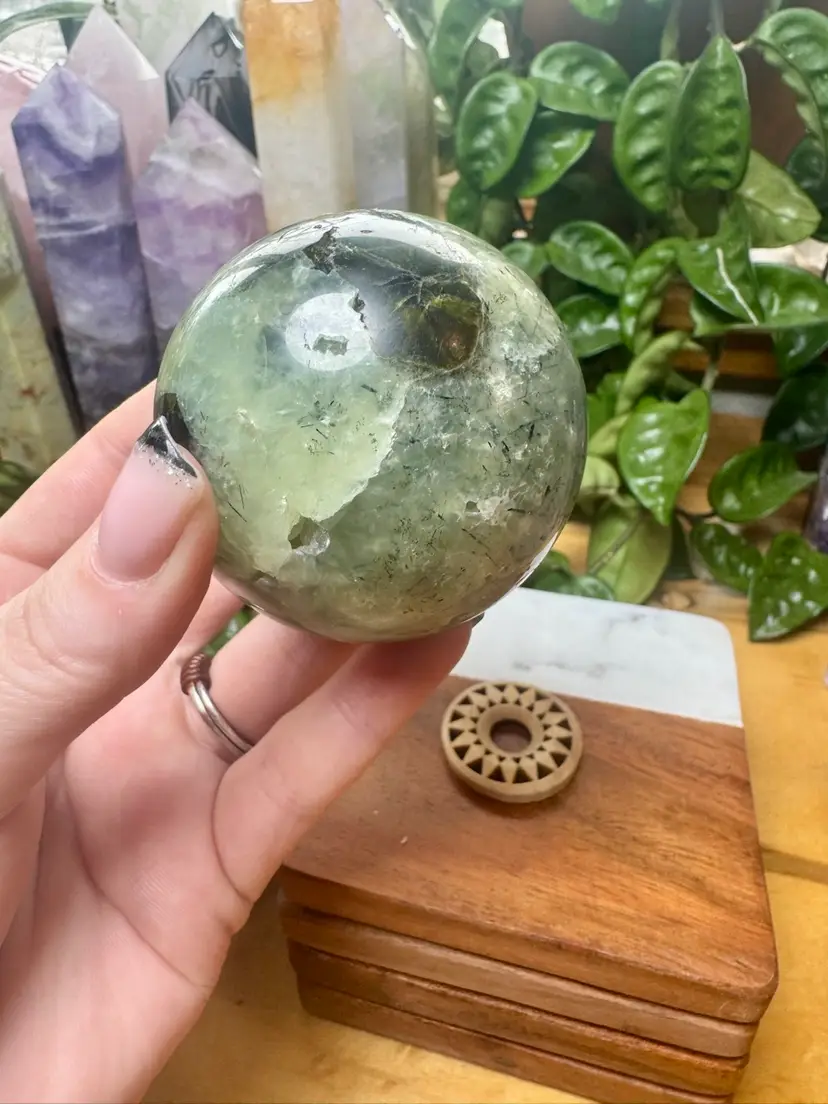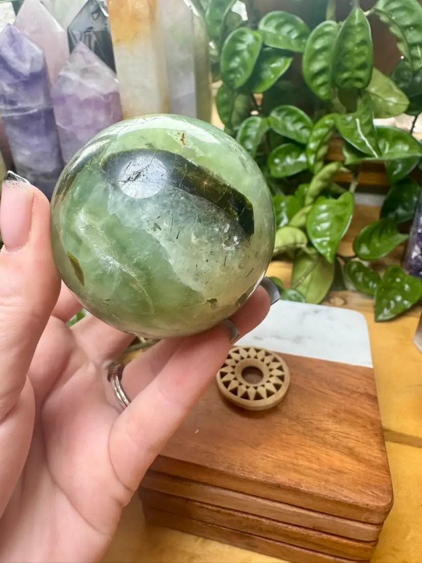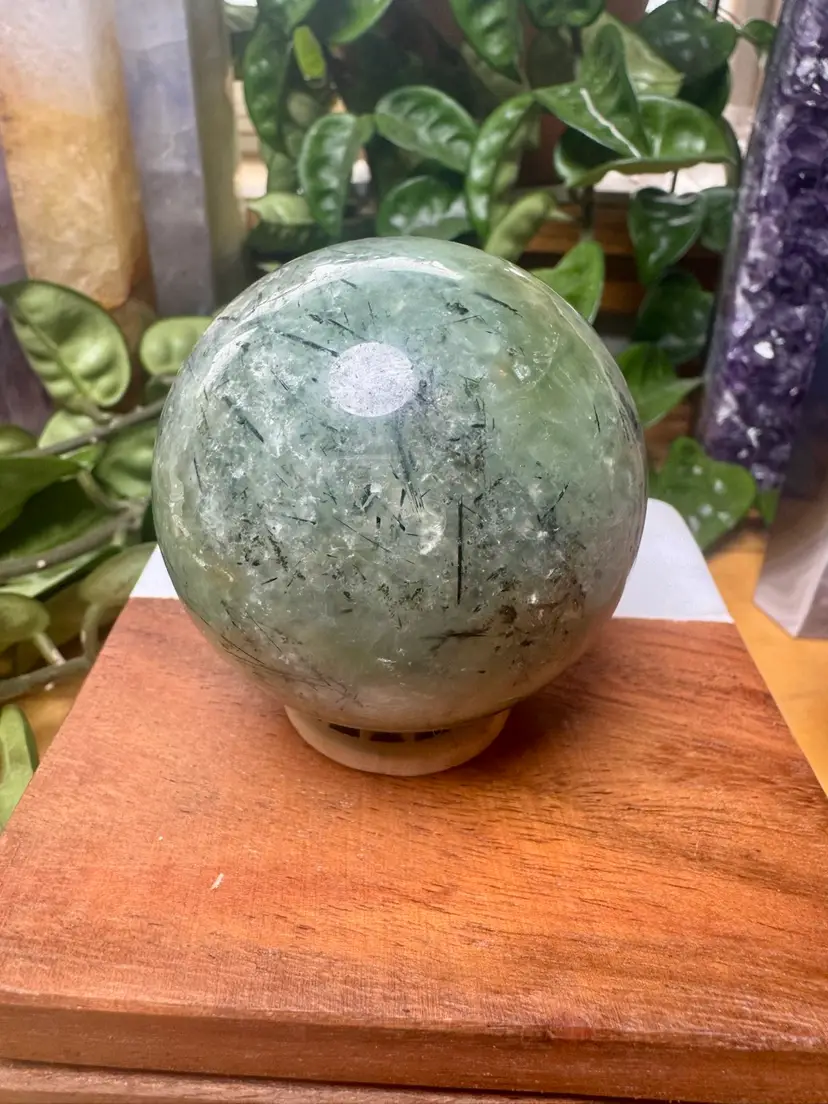 Prehnite sphere with a mix of small and large tourmaline inclusions. 61mm. Comes with small wooden stand.