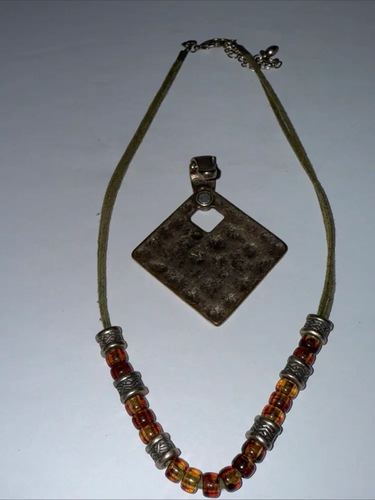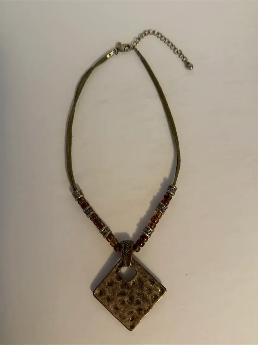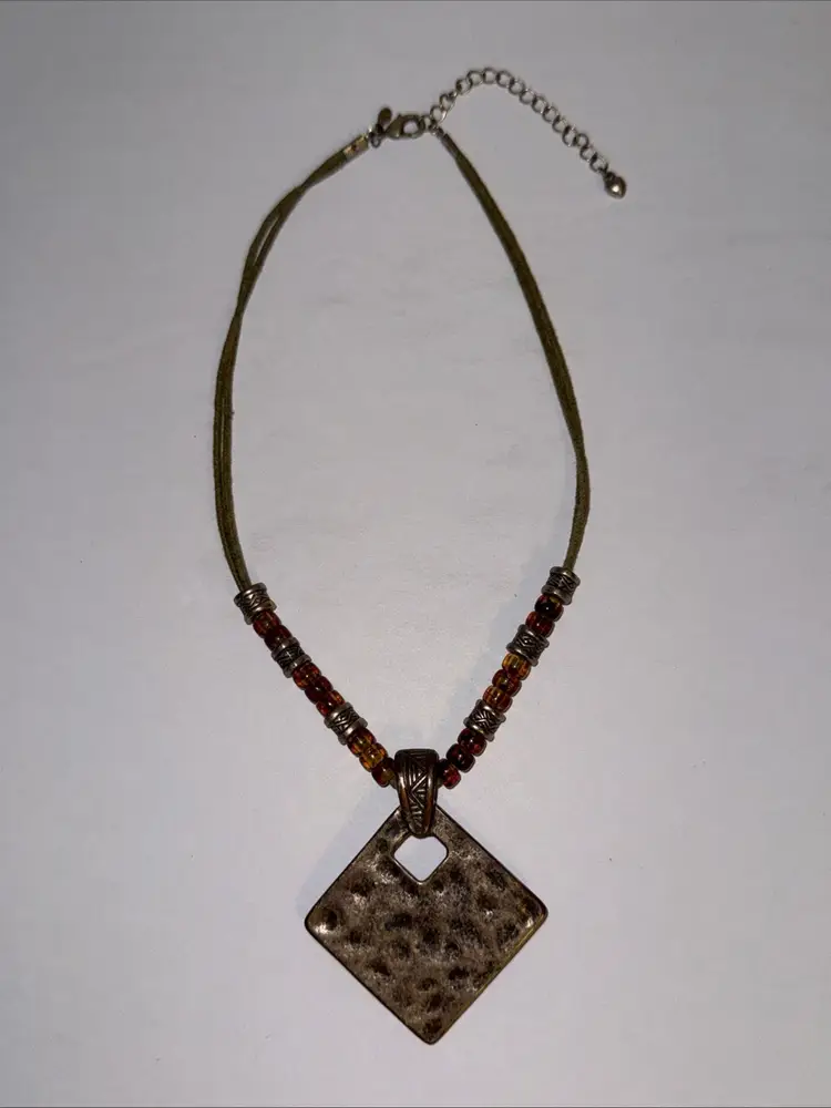 Premier Designs Bali antiqued matte brass pendant necklace. The pendant has a magnetic clasp and is removable. The necklace is in very good preowned condition.