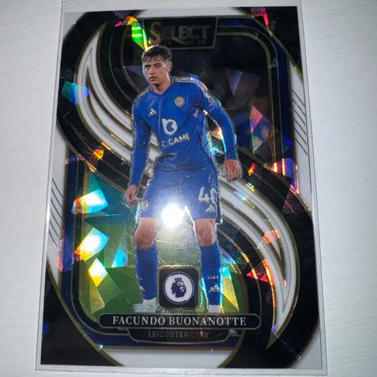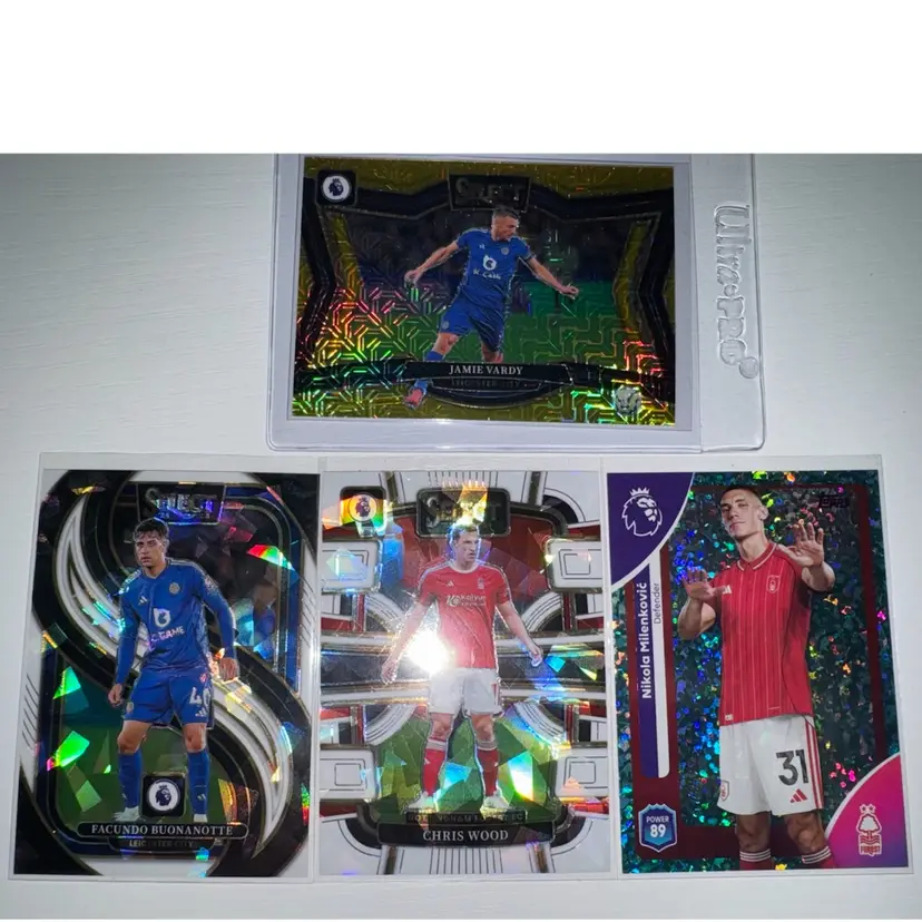 This 4 card lot includes: Jamie Vardy 2024 Select Gold 9/10 Facundo Buonanotte 2024 Select White Ice /85 Chris Wood 2023 Select White Ice /85 Nikola Milenkovic 2025 Topps /499