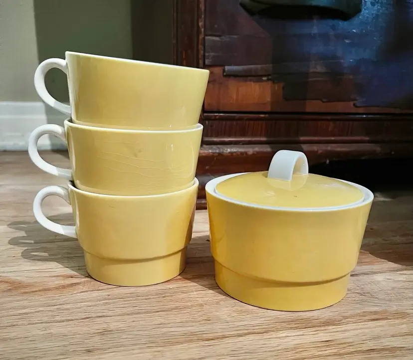 Cute set of 3 cups and sugar bow with lid! Yellow in color, each about 3 inches tall. EVC, no flaws