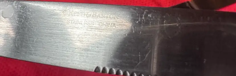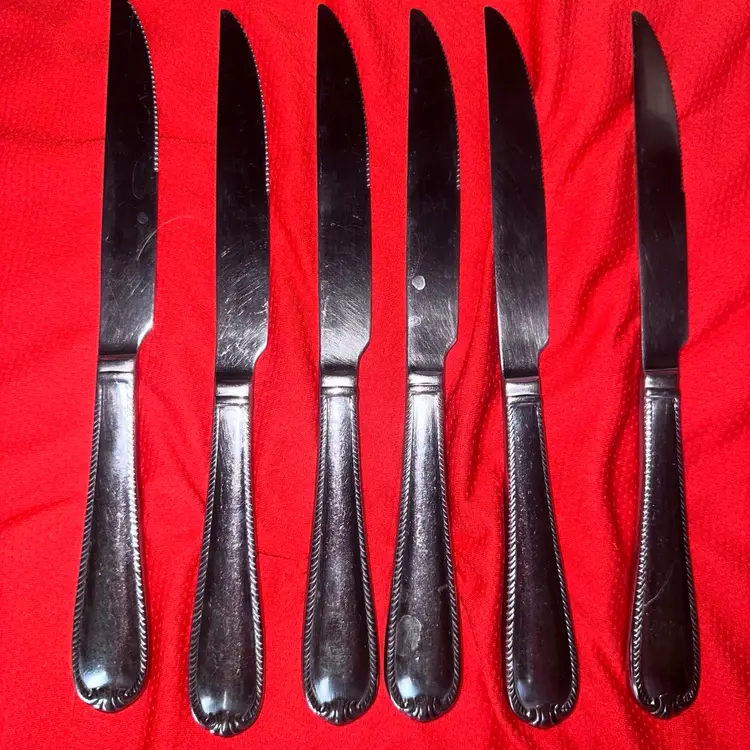 Preowned Reed & Barton DOMAIN Stainless 18/10 Glossy Rope Edge Steak Knives Set Of 6. Heavy Solid Knives. Approx Length 9 5/8”z Smoke Free Home. #reedbarton #domainsilverware #steakknives #silverware