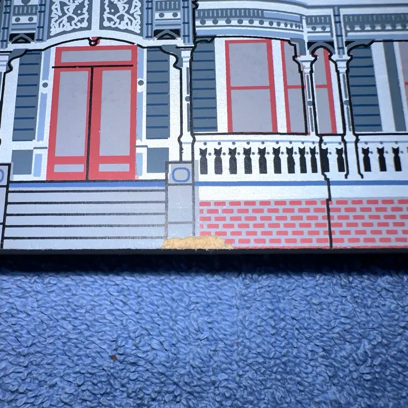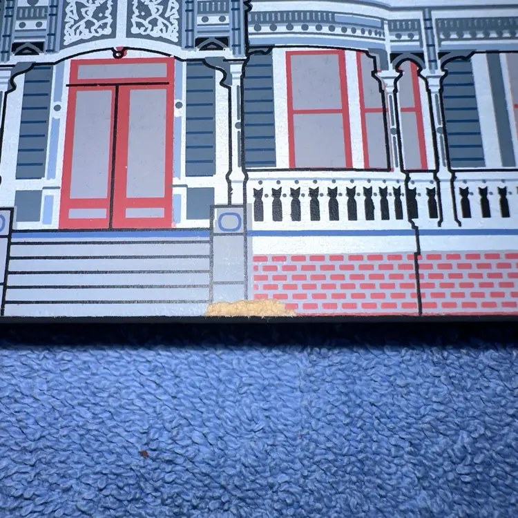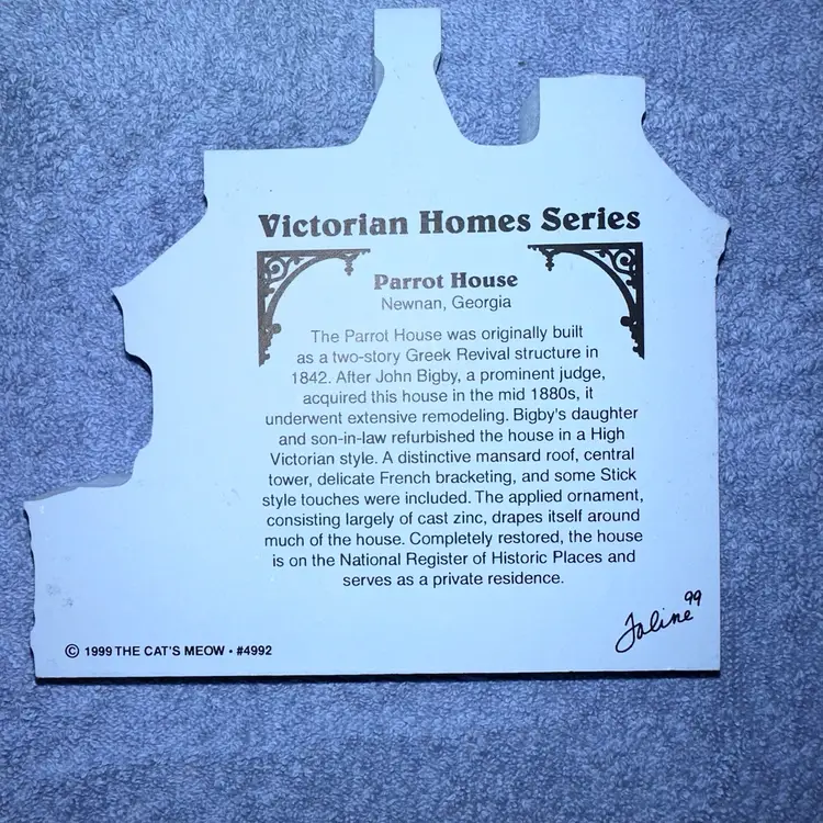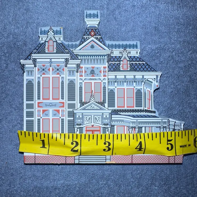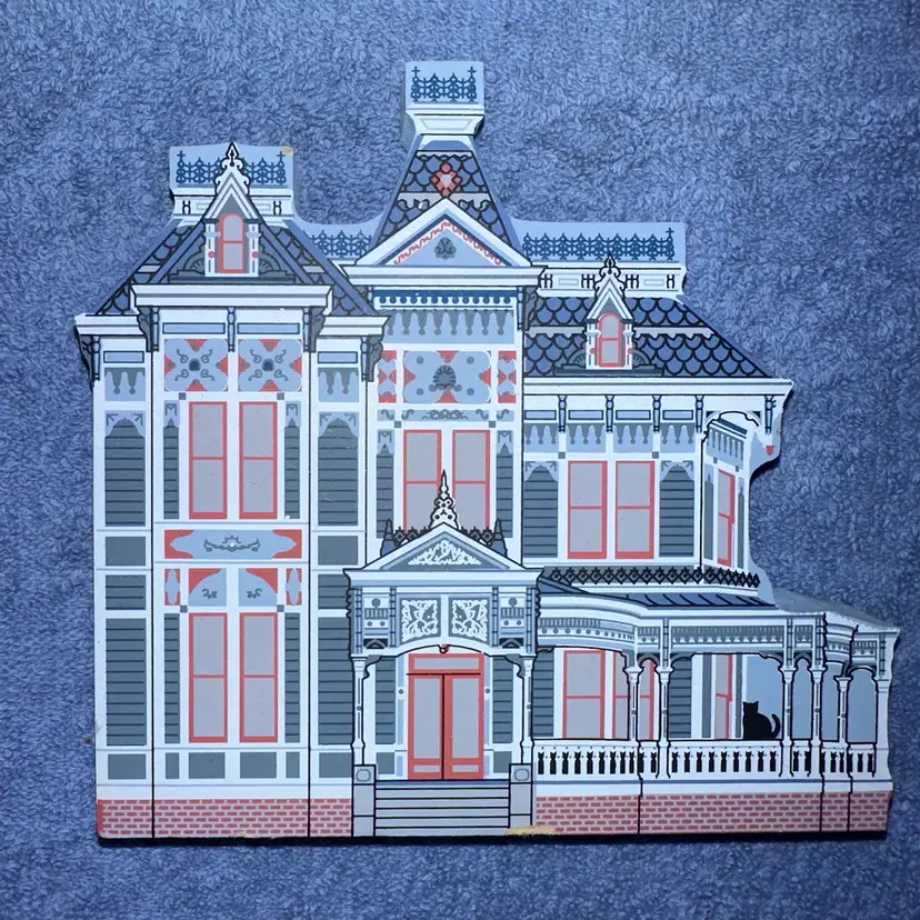 This victorian home is handcrafted in the USA from 3/4" thick wood. Printed with the colorful details on the front and the back includes a written history. Group this home with other victorian Cat's Meows to create a cozy little village of your own. You can set it on a mantle, shelf, or dresser, or perch them on wainscotting or the trim above you window or door. #4992