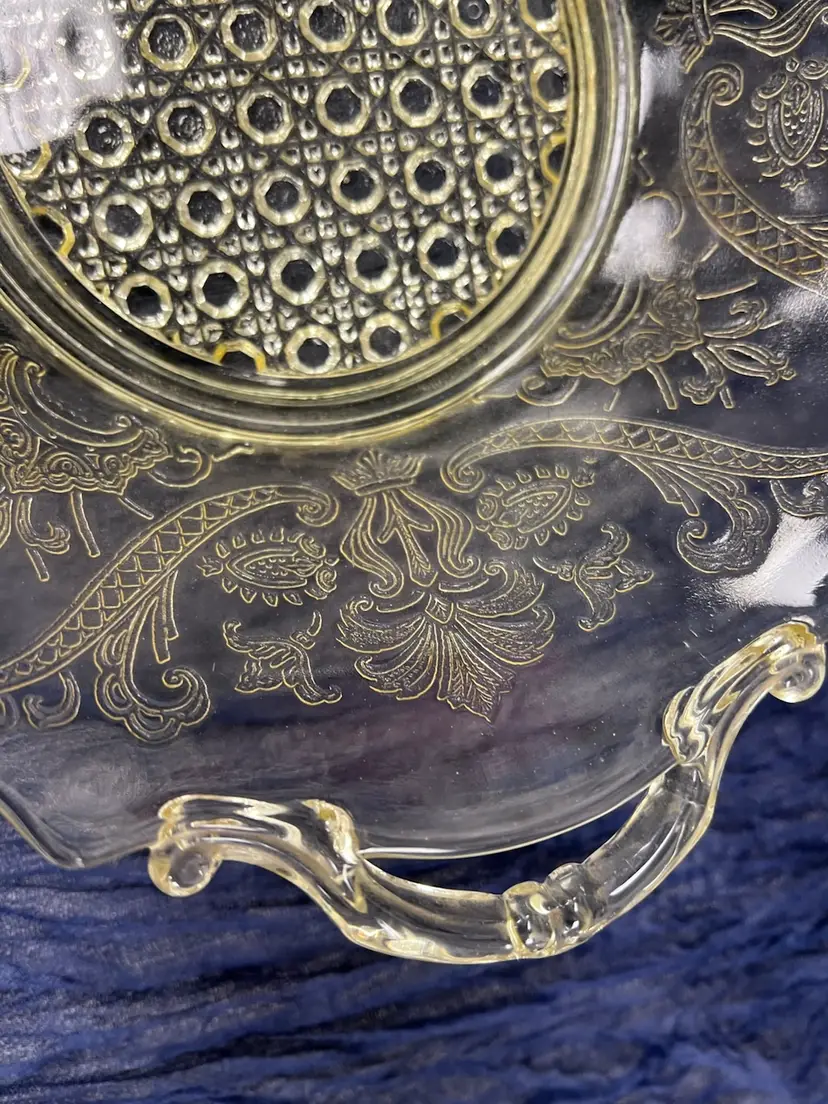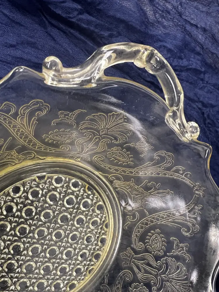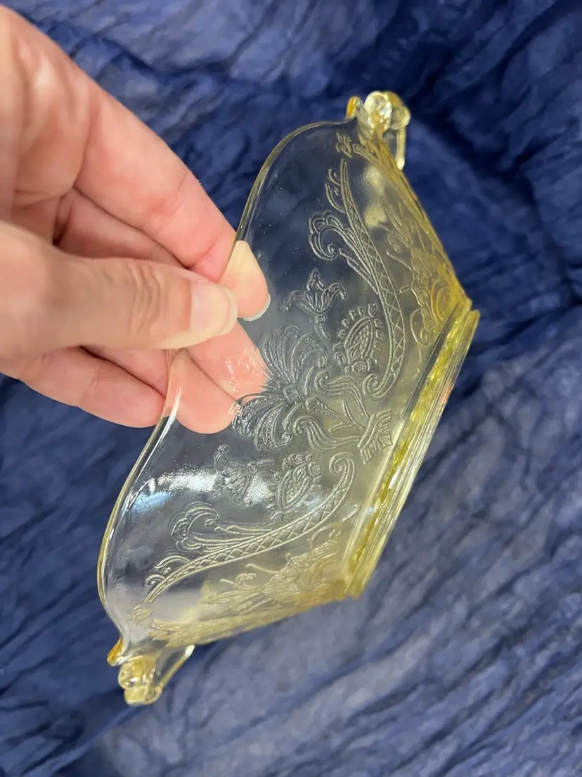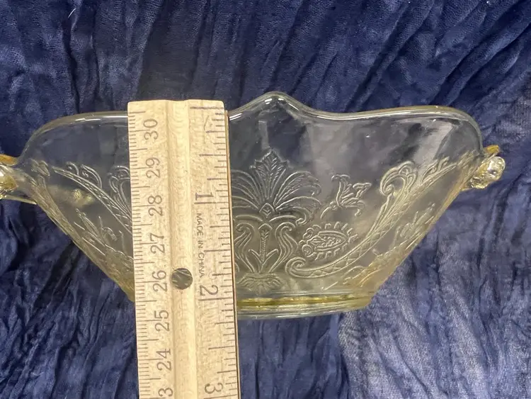 Elegant serving bowl with molded handles. Intricate floral and lattice design. Yellow glass. Ready for display or entertaining. Light vintage wear. No chips or cracks but there are manufacturer bubbles in glass (pictured).