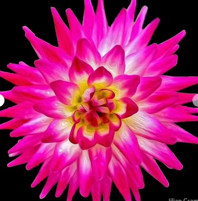 Macro photograph of a stunning Dahlia; popping off a stark black background. Digital enhanced for an amazing piece of wall art - textile or accessory! Great gift for her!