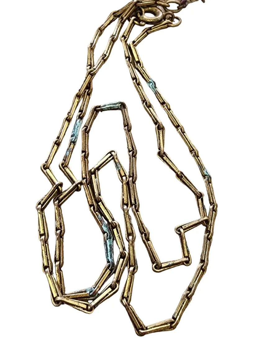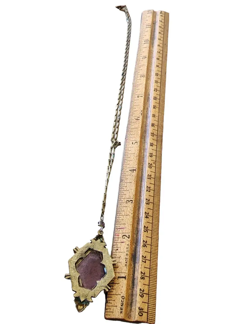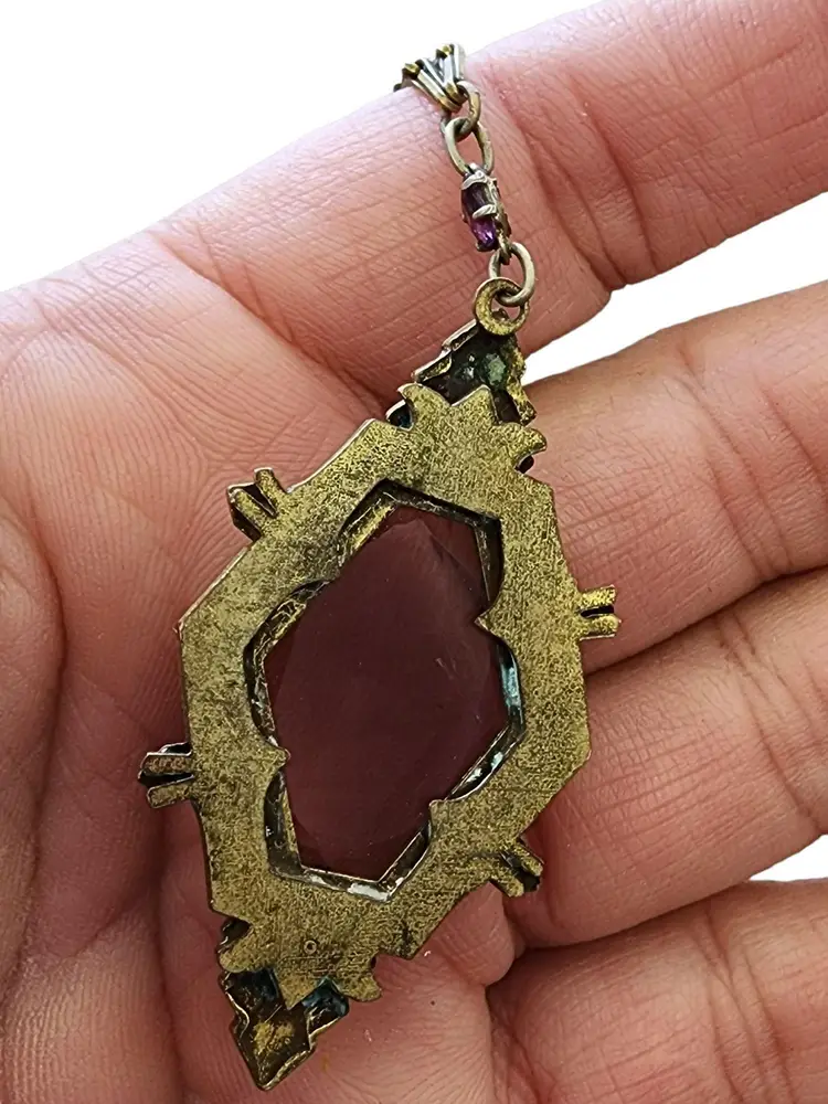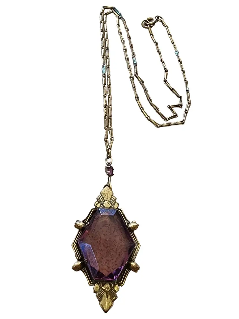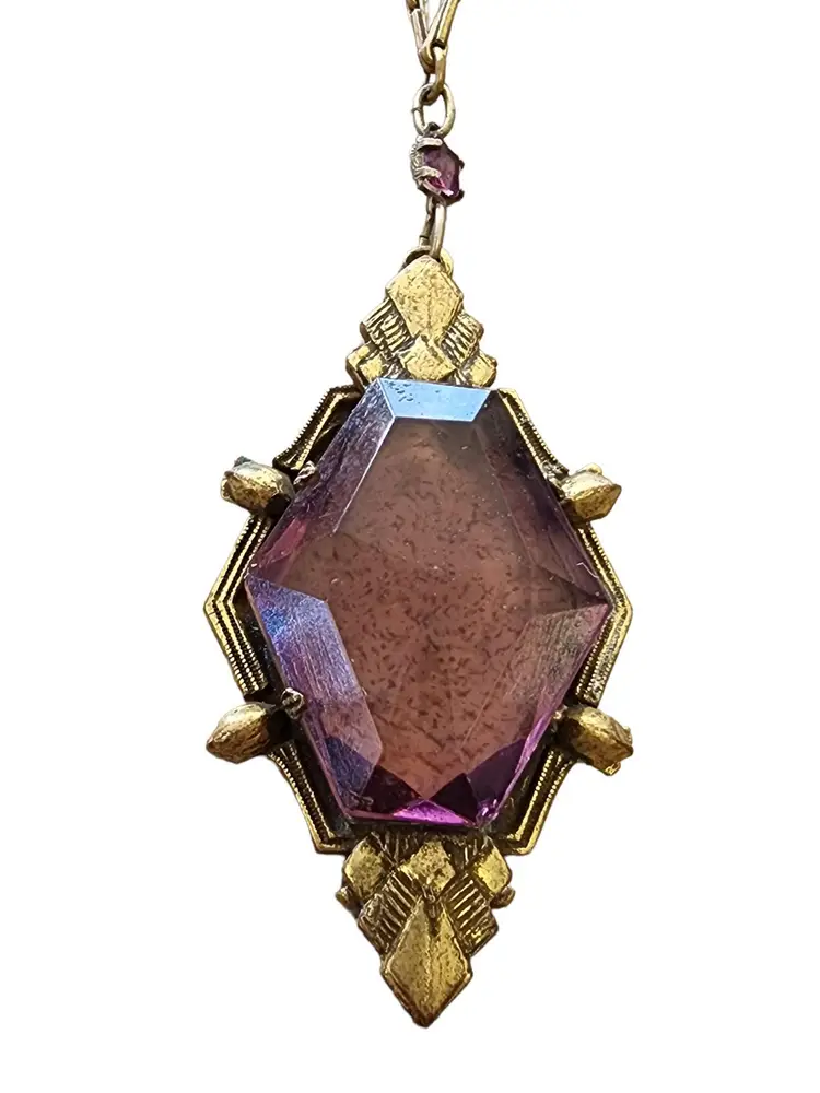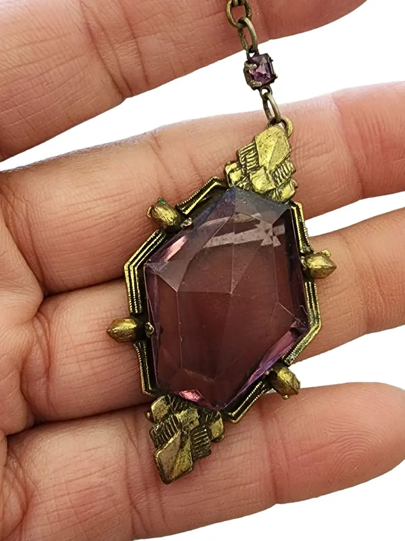Size: Textured link chain 20", Pendant 2.25" Condition: Good condition Era: Circa 1920s Signed: None Details: It features all prong-set glass with nice detail to the brass. There are a few sections on the chain with some verdigris, as well as on the back of the pendant, and it has not been cleaned. The piece is all original, with a few tiny flea bites to the glass.