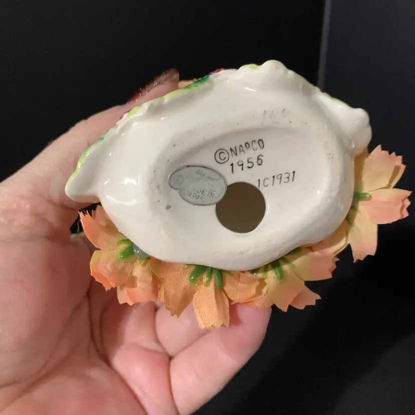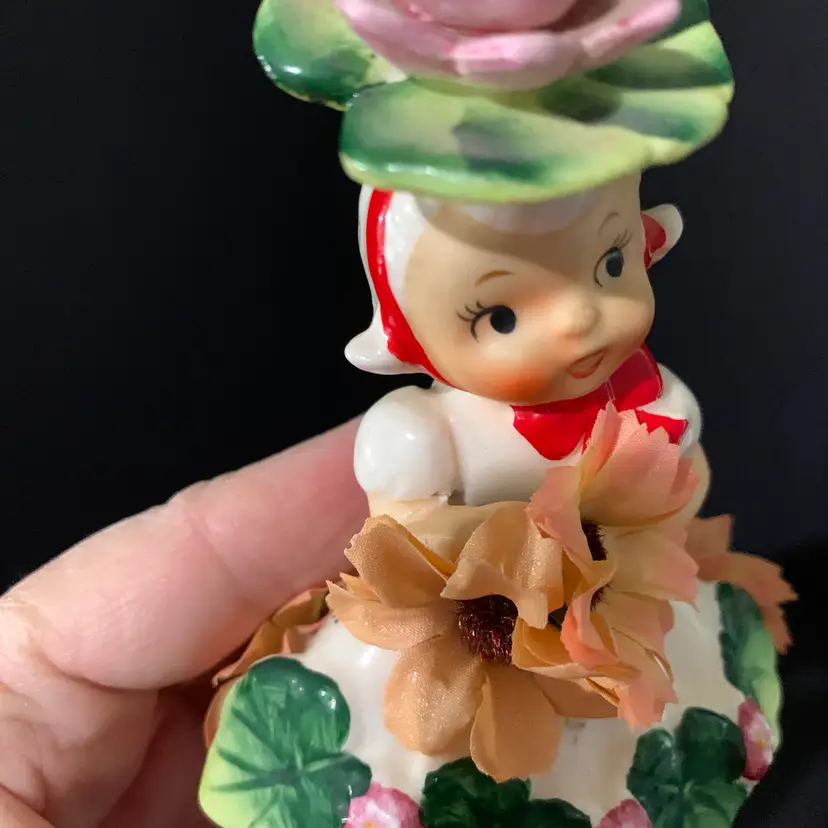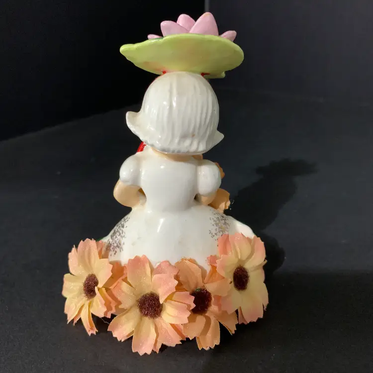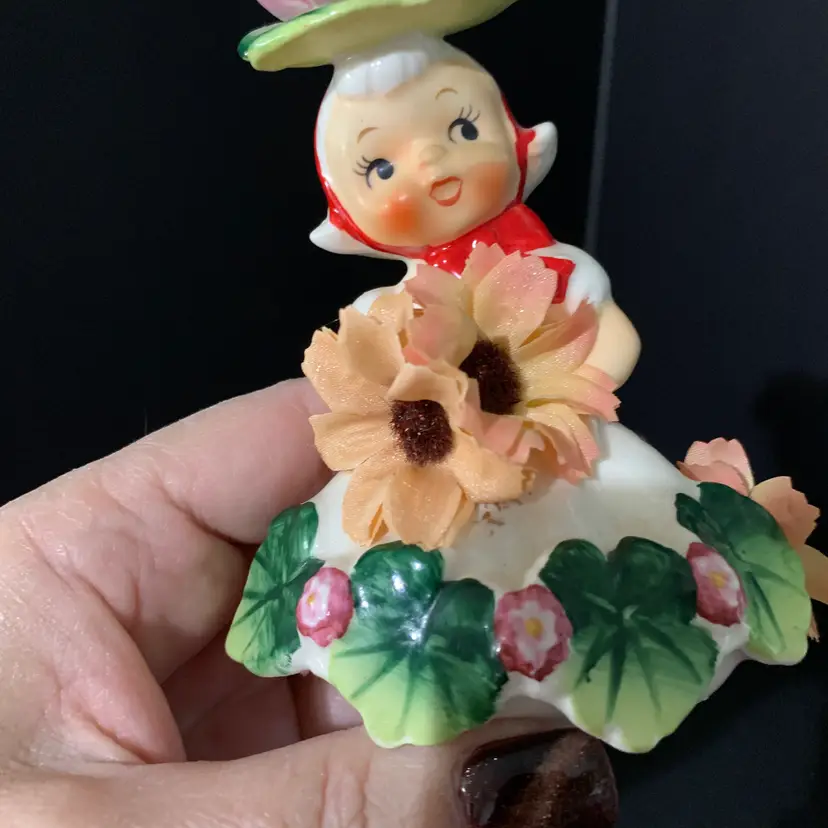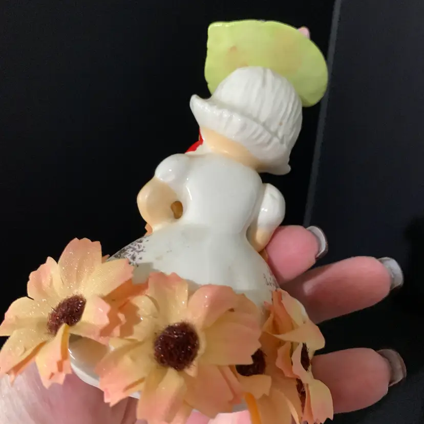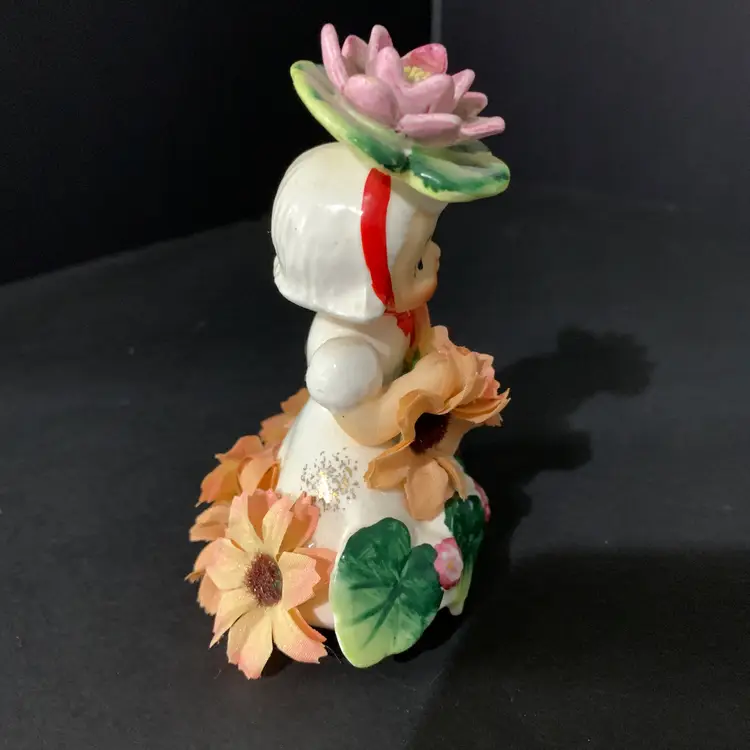 This girl was originally holding something and it had been broken off. So I added the flowers to give her a new life. Measures 3 1/2 inches across, 2 1/2 inches wide and 4 1/2 inches tall. Weighs 3 ounces. If the actual postage ends up being less than what you paid, you will be refunded for anything over one dollar.