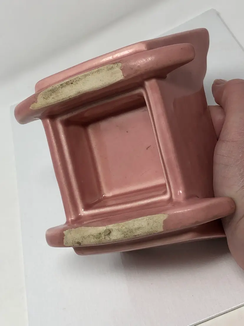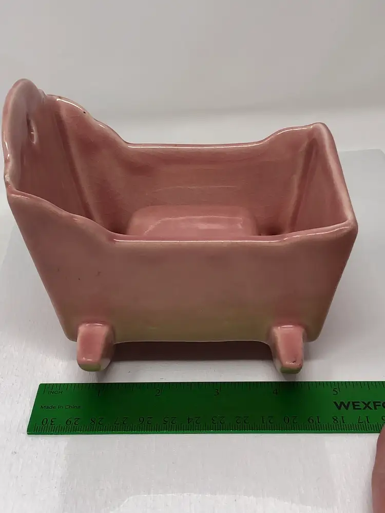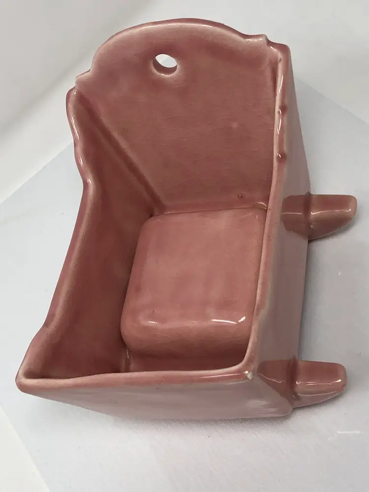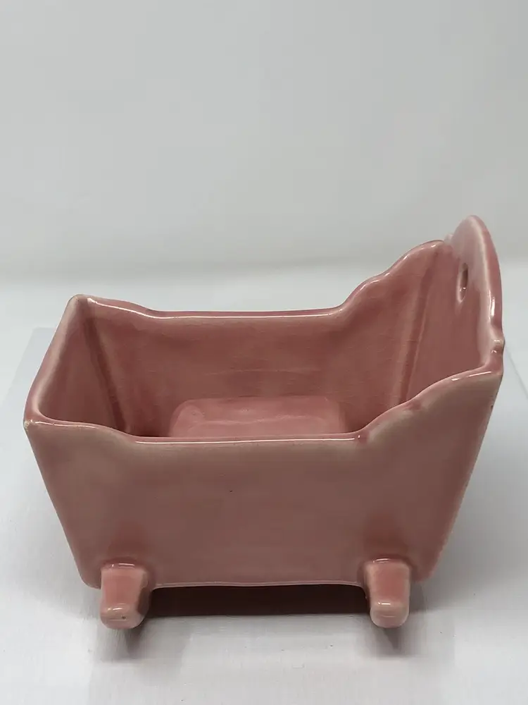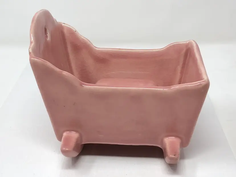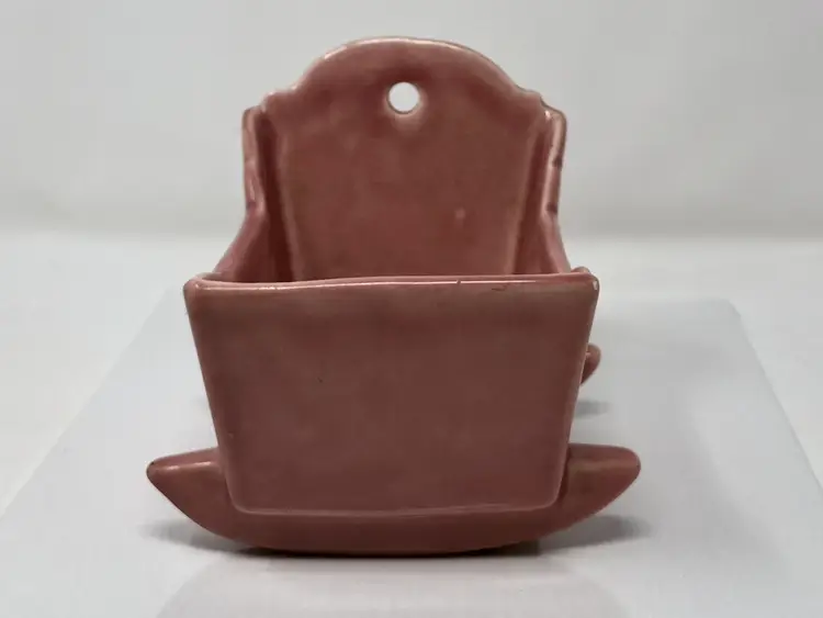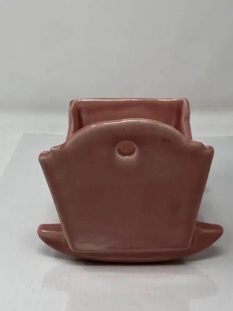 5 1/2" pink rocking baby cradle planter. No markings or labels. Some crazing in the glaze and small chips to the corners as shown in photos