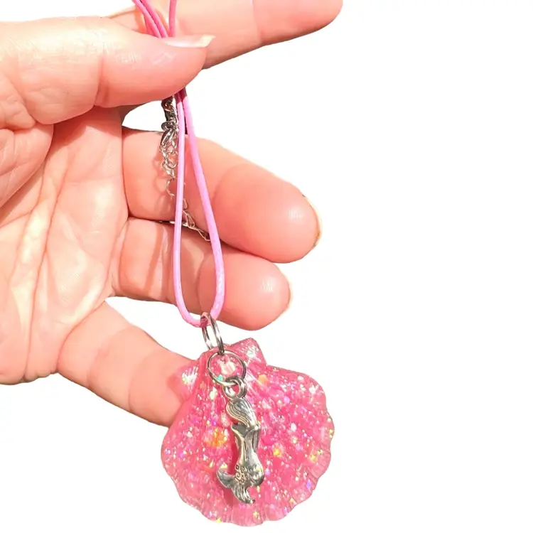 Handmade by me š«¶ Resin and pretty pink pigment & glitter Fun mermaid charm Adjustable pink cord necklace Seashell 1-1/4ā wide x 1-1/4" tall Necklace adjustable from 17-1/2" to 19-1/2" length
