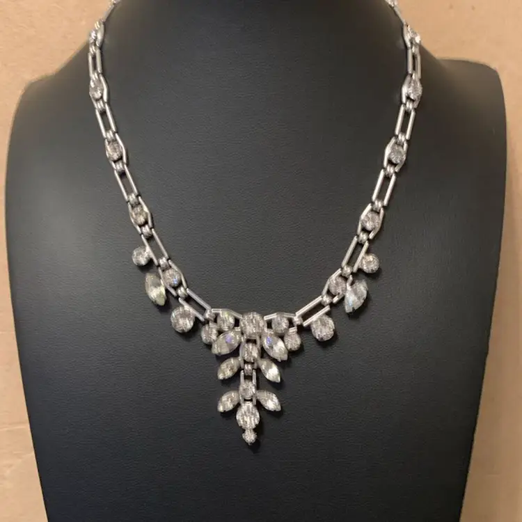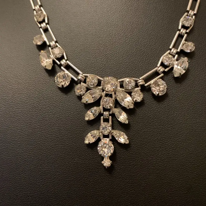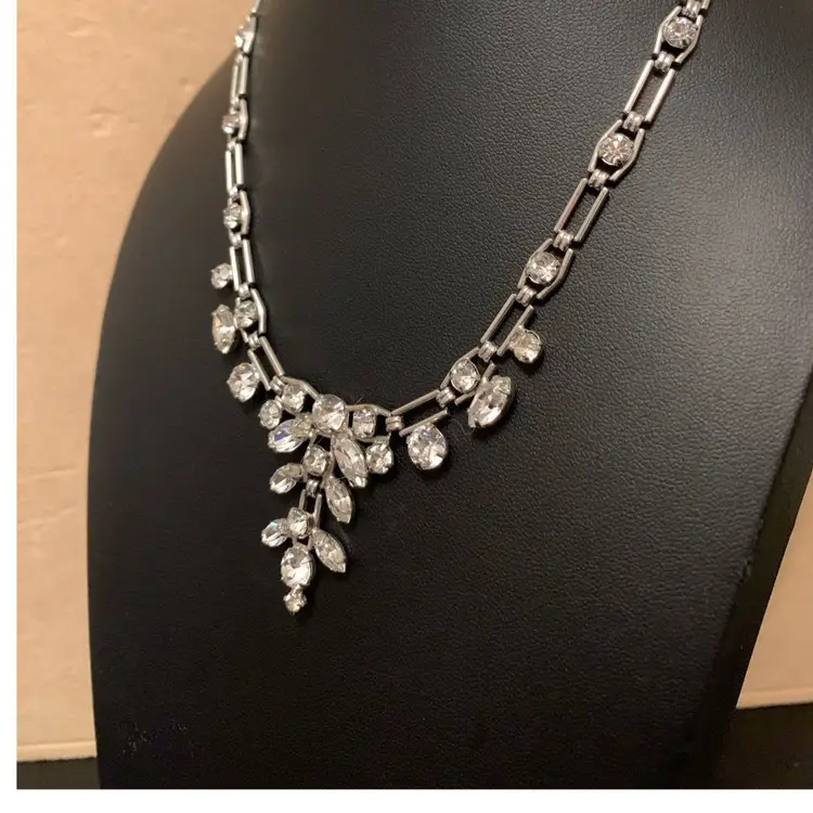 Love this piece. It is a statement piece without it screaming at you. Would be lively for a bride or for a prom this spring 17 drop from clasp to tip of pendant Can be made shorter to 15 in if you wish All stones are sparkly and intact