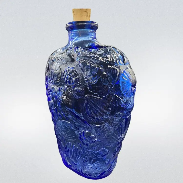 Pretty Vintage Blue Glass Bottle Seashell Theme Marked Canada