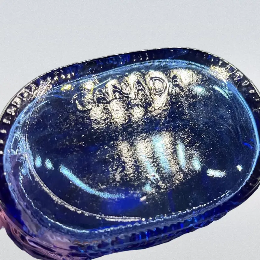 Beautiful vintage blue bottle with a nautical seashell embossing. Marked Canada on the bottom. Measures just over 8” tall 6” wide 2.5” deep. Good vintage condition, no chips or cracks.