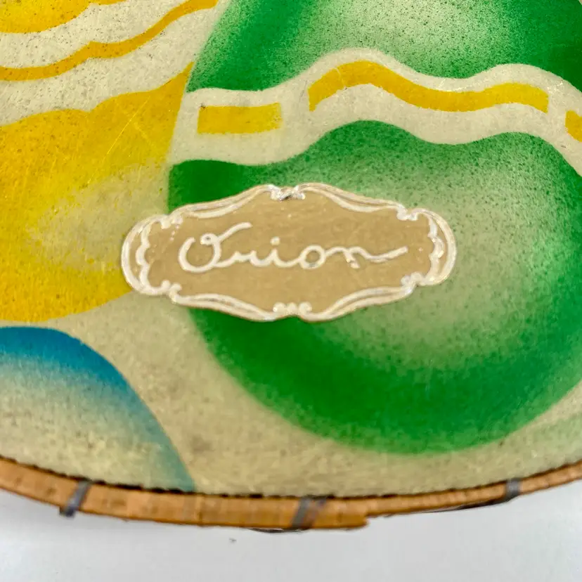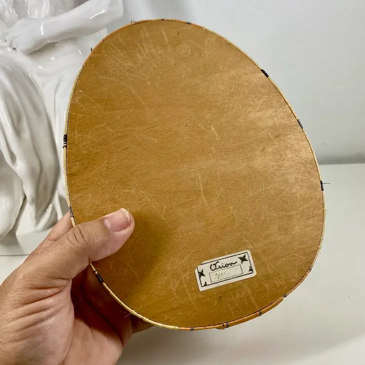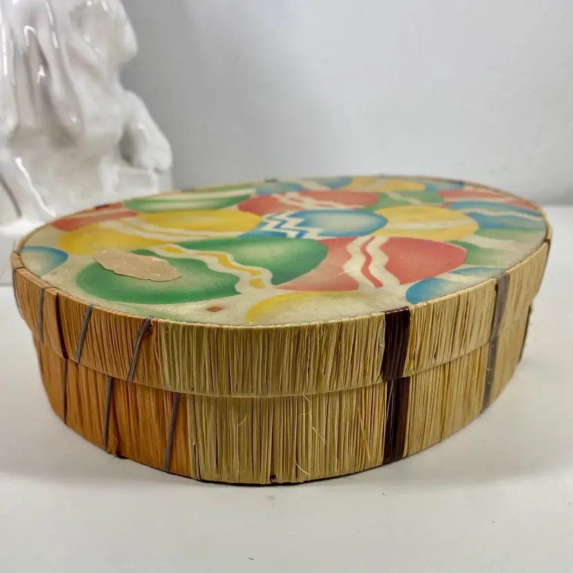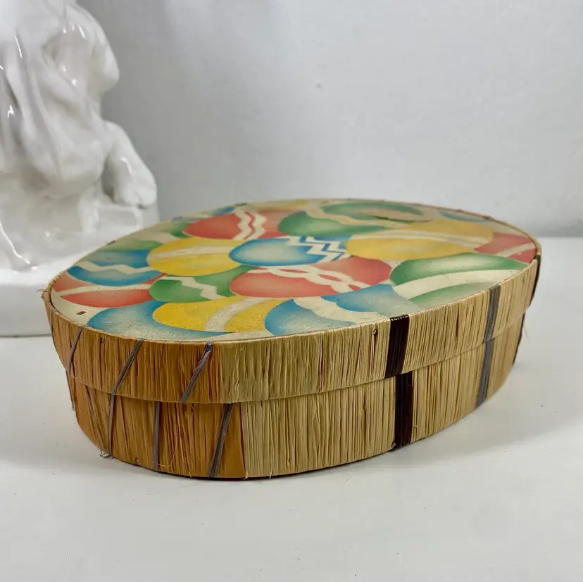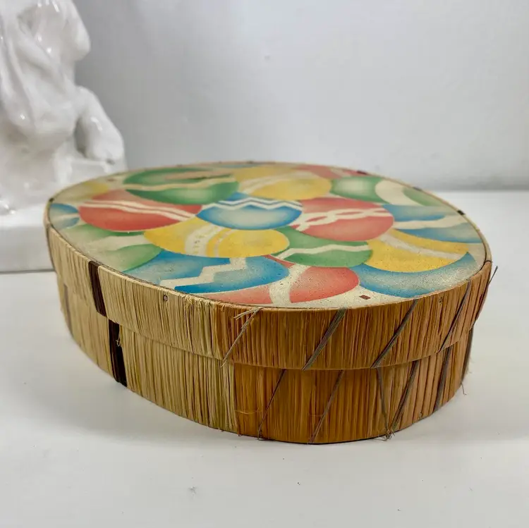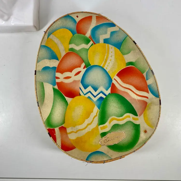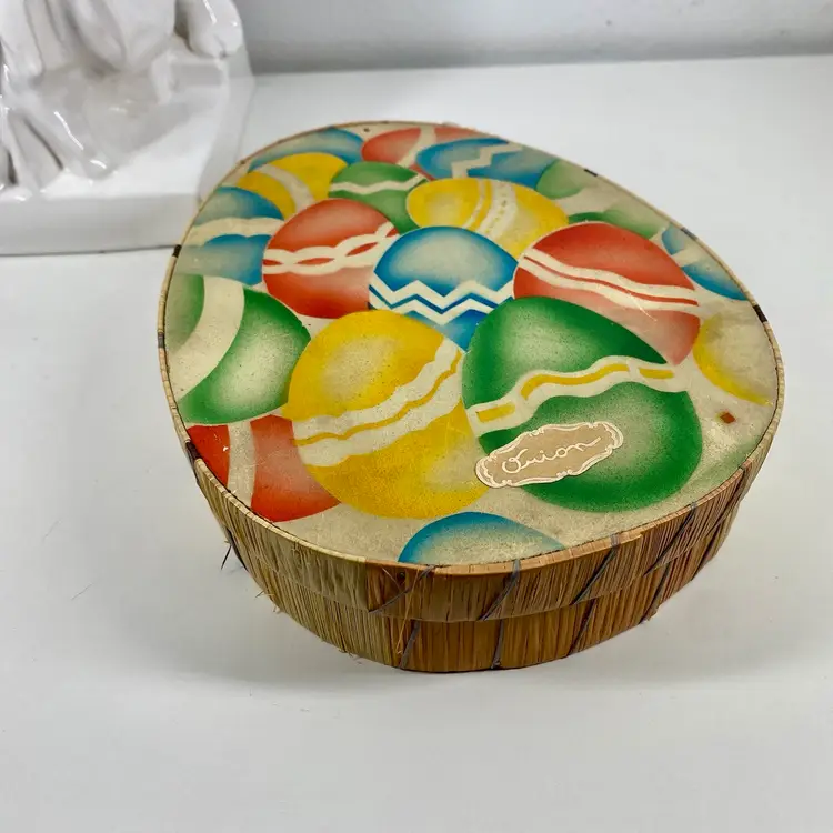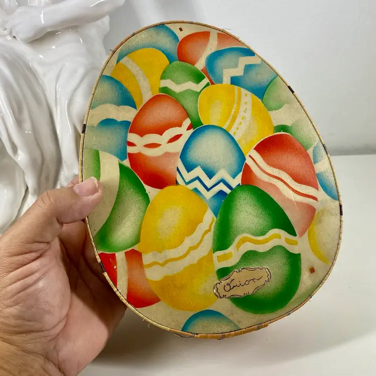 Hi... This vintage Easter candy box is a unique find from the 20s to 30s. The wooden box, made in prewar Czechoslovakia, features a beautifully colorful airbrush design of multicolored eggs on it's top and sides constructed of colored raffia material. It is handcrafted in the style of the period, Art Deco and measures 8" x 6.5" x 2" in depth. This candy advertising box is a perfect example of European minimalism. And it is labeled ORION on it's front and back. It makes for a great addition to any collection and a perfect way to celebrate the holiday season.