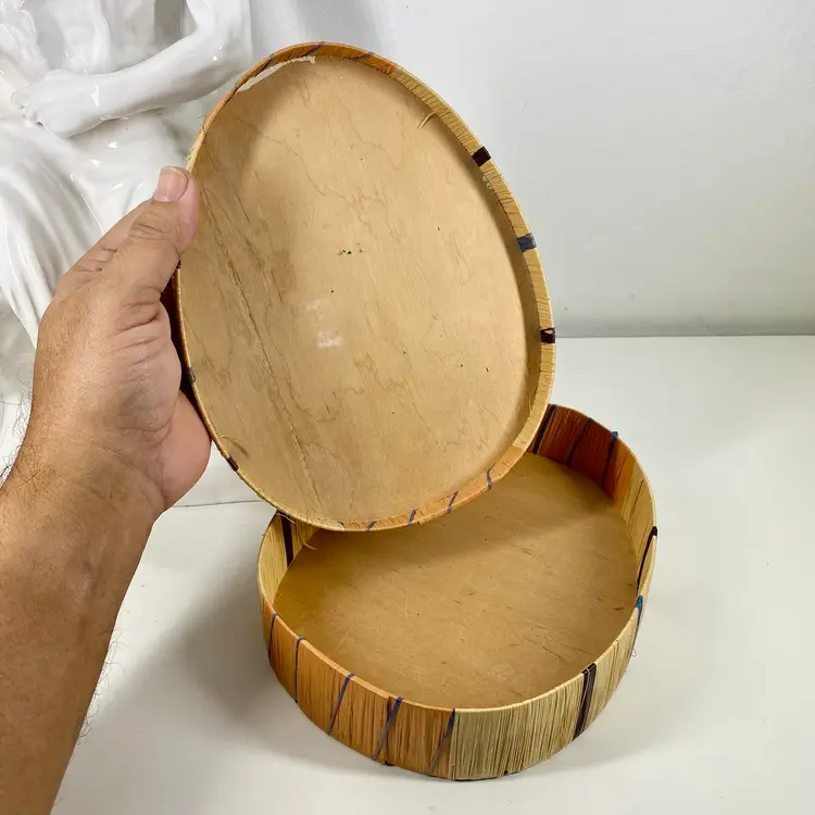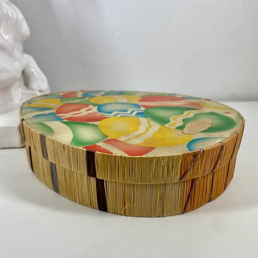 This precious box is just lovely for his age. No cracks, only a very few broken raffia reeds along the sides and a few surface scratches on it's top. It's in really lovely condition for its age. Please review pics for details.