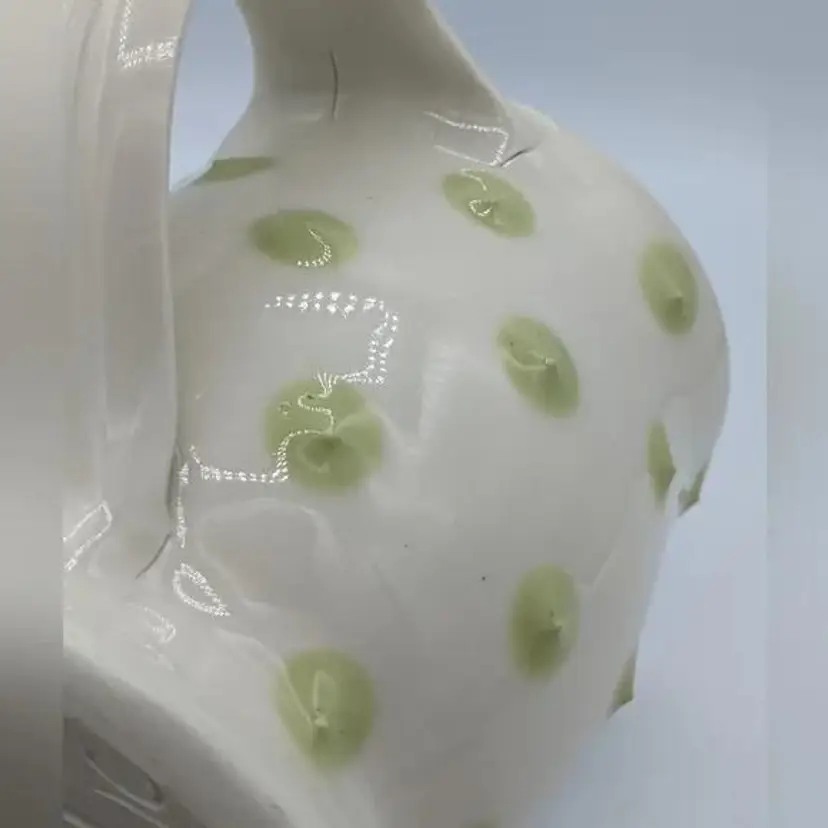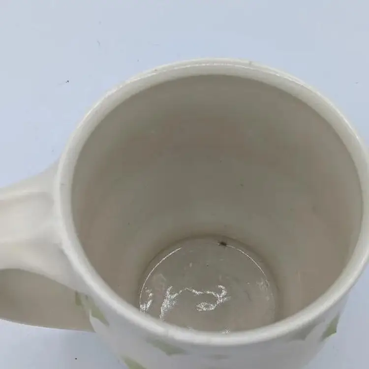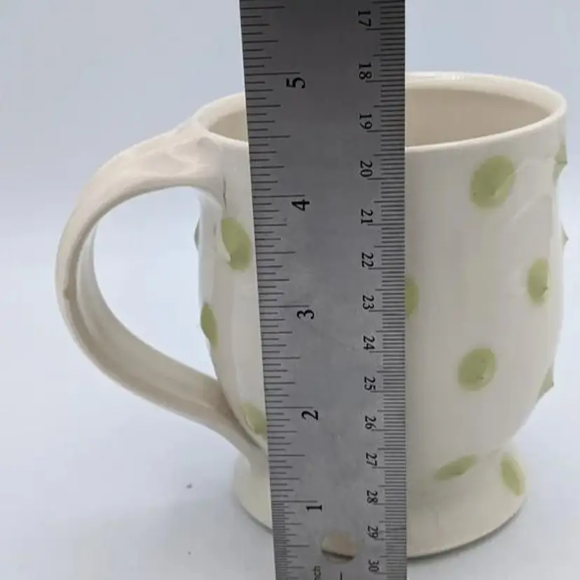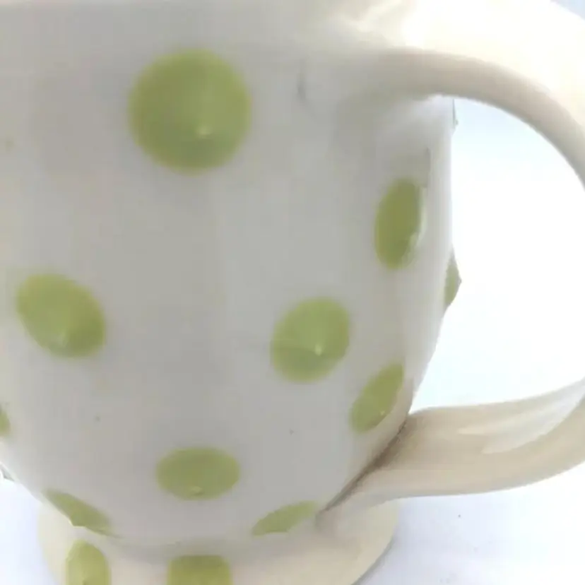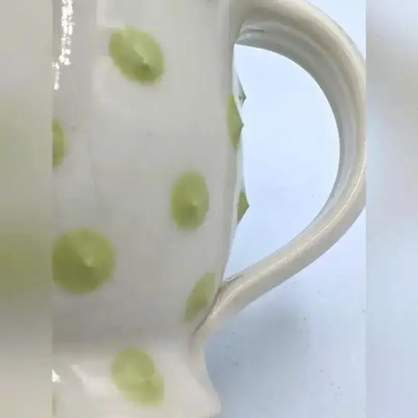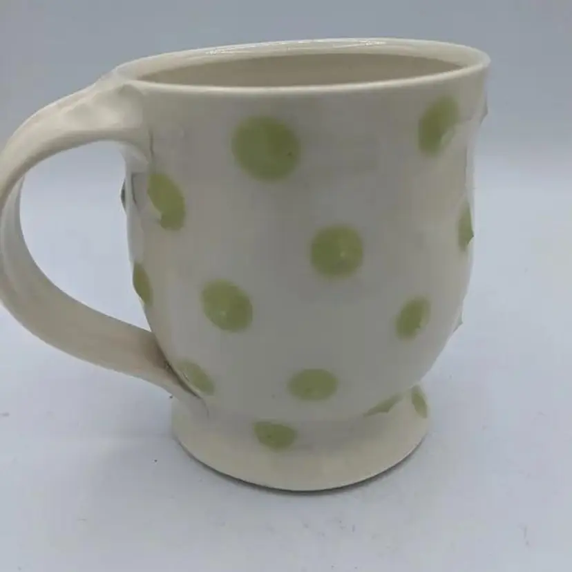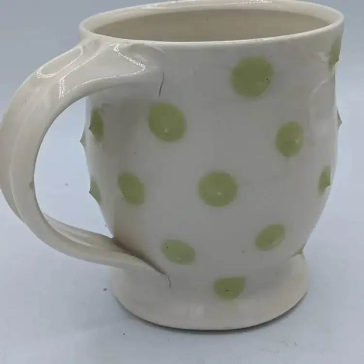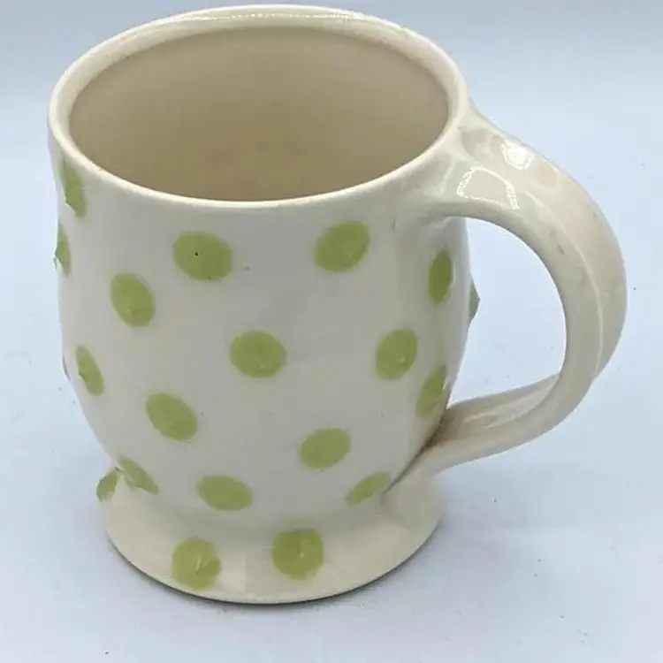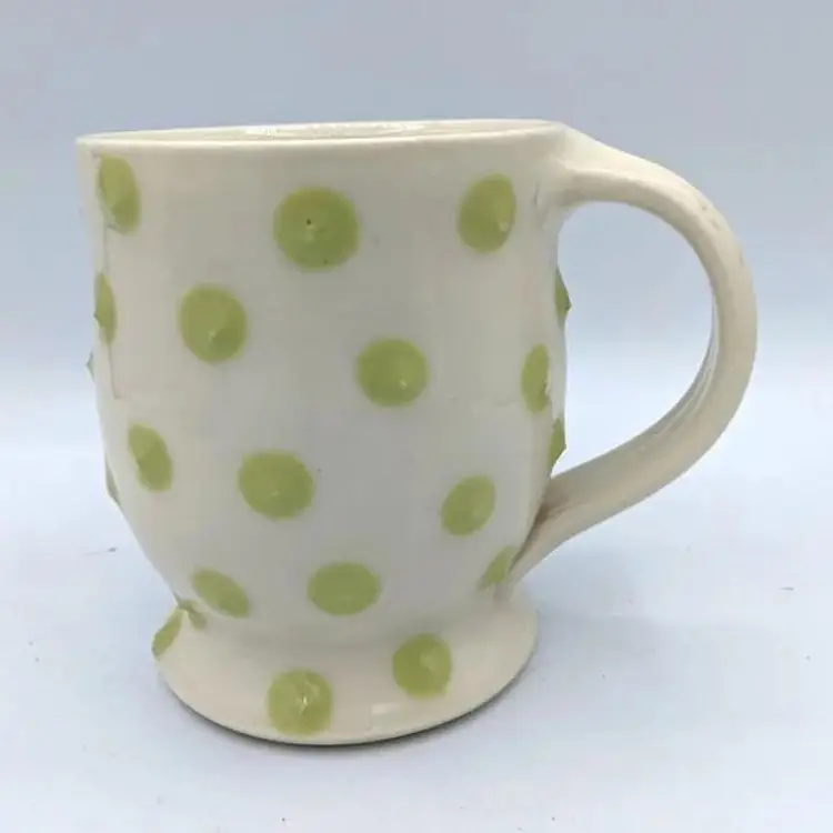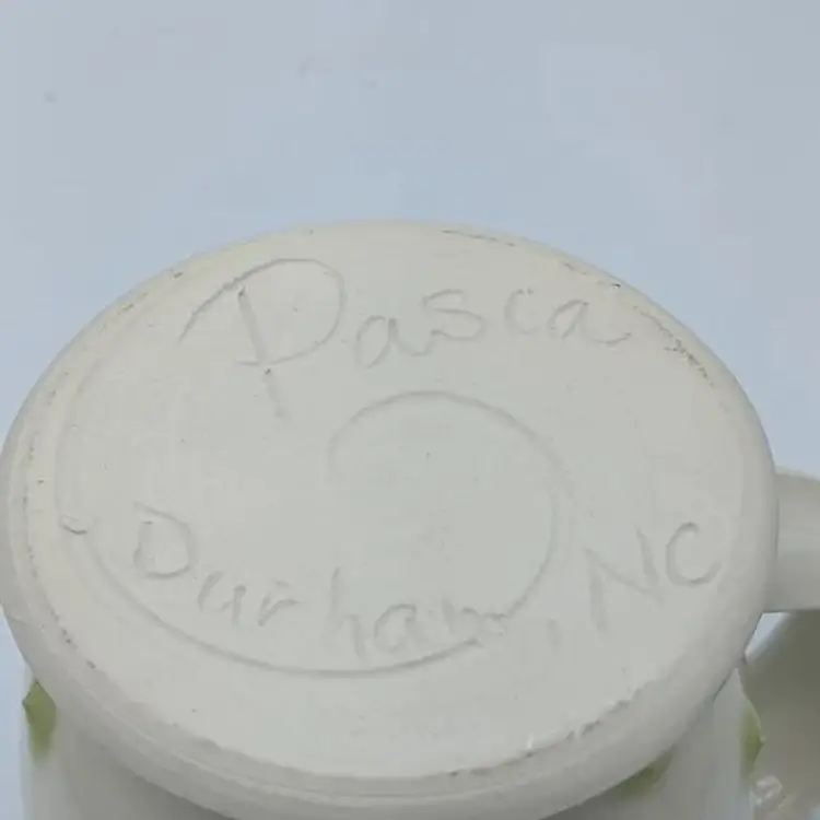 Pasca Pottery has been an extremely successful art pottery Studio located in Durham North Carolina. they have been open for over 30 years producing beautiful artistic yet functional tableware such as this. Their designs are usually three-dimensional, and all the dots you see on the cups actually feel prickly. The line you see near the handle in the photos is not a crack, it has been glazed over and was part of the original design. CH61925