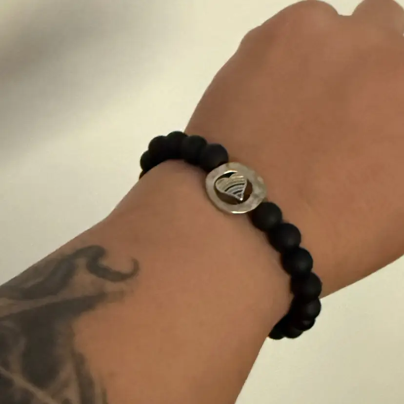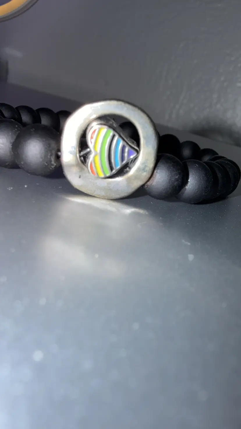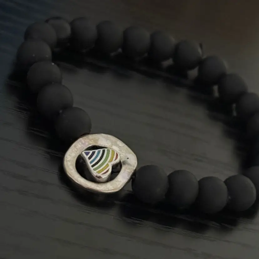 Show your LGBTQ+ pride with this bracelet. Black matt beads with a silver rainbow charm. Customizable