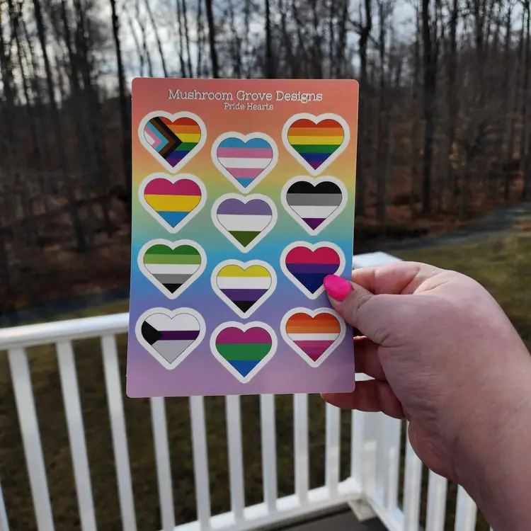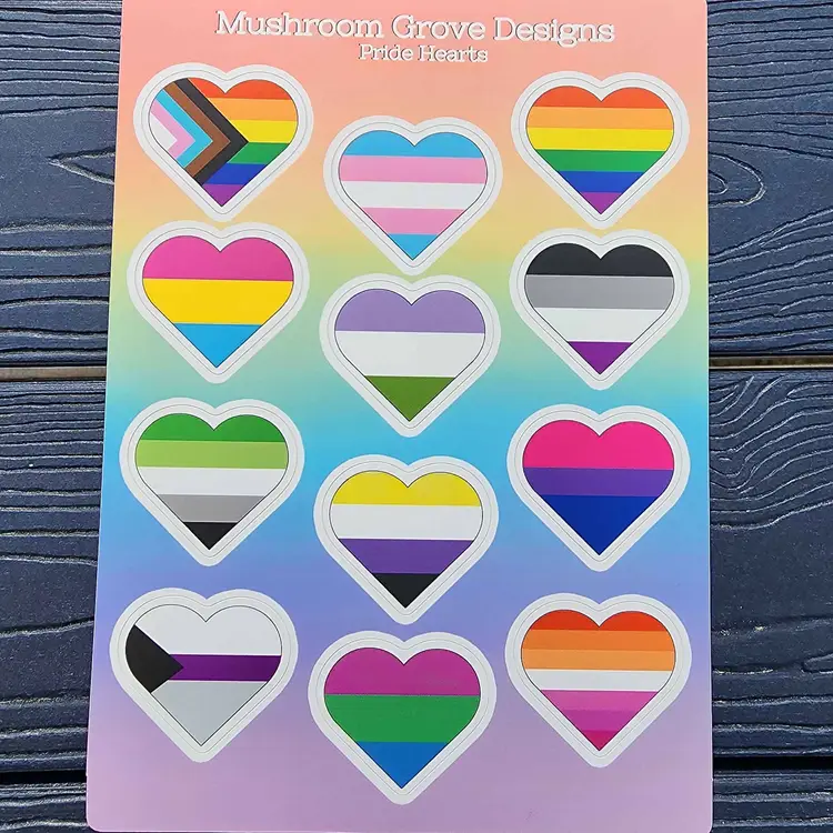This sticker sheet features 12 stickers of different pride flags in hearts. Each sticker sheet measures 5x7 inches (12.7x17.8 cm) with each sticker measuring approximately 1.25x1 inch (3.18x2.5 cm).