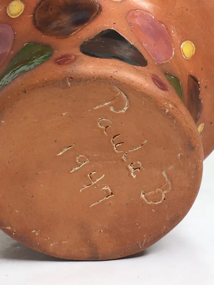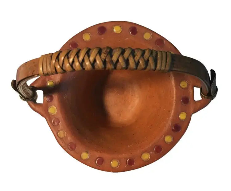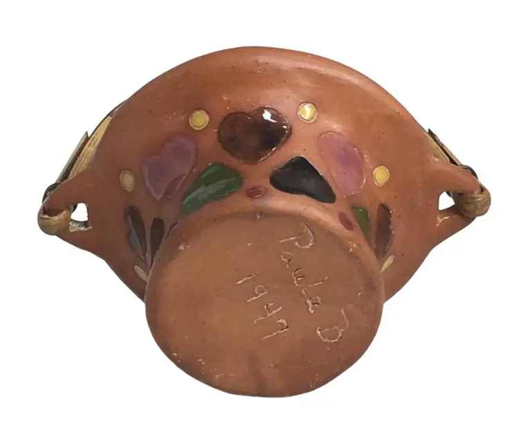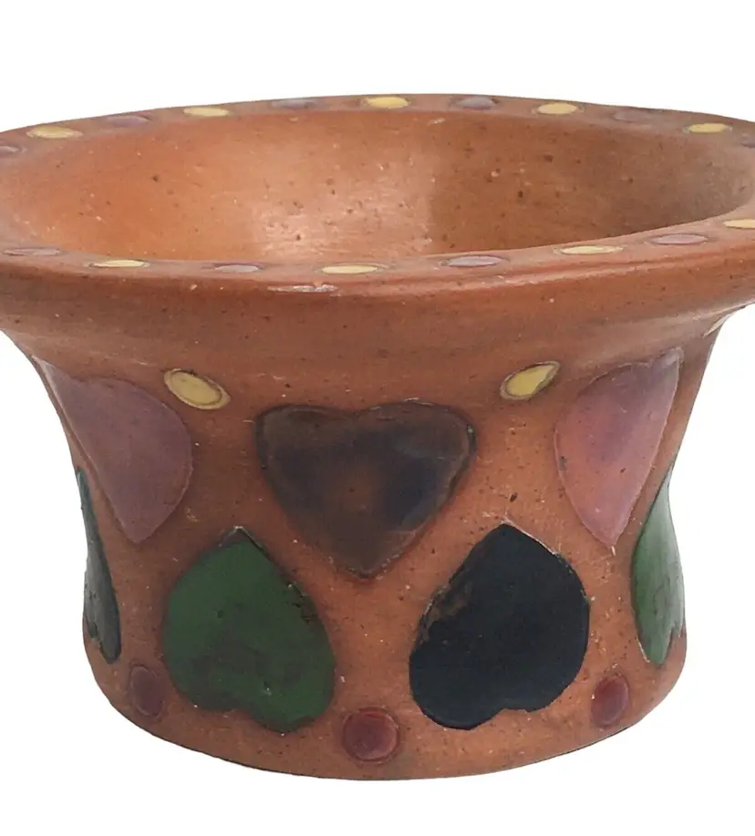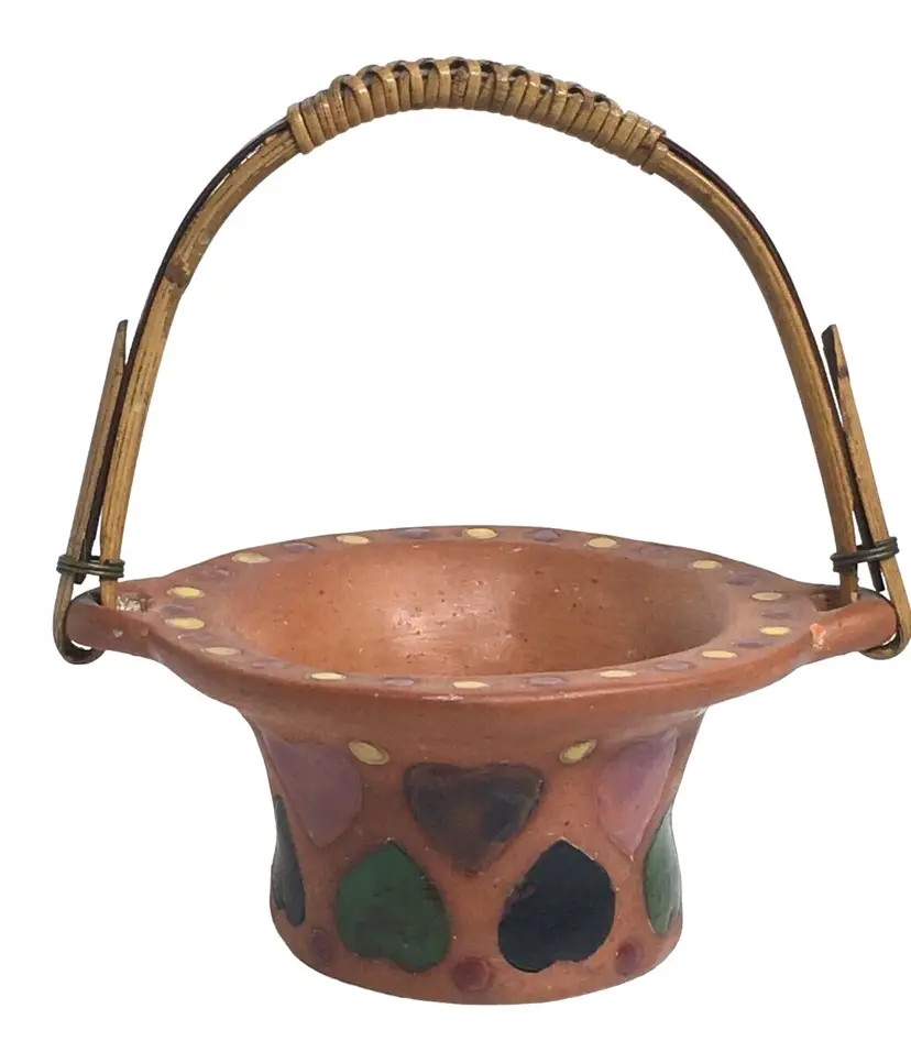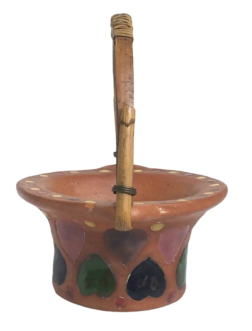 Brand: Paula B. Type: Pottery Basket Item Height: 6" Color: Multicolor Theme: Hearts and Dots Material: Clay Item Length: 5 3/4" Production Technique: Pottery Finish: Matte and Glossy Item Width: 4 1/2" Handmade: Yes