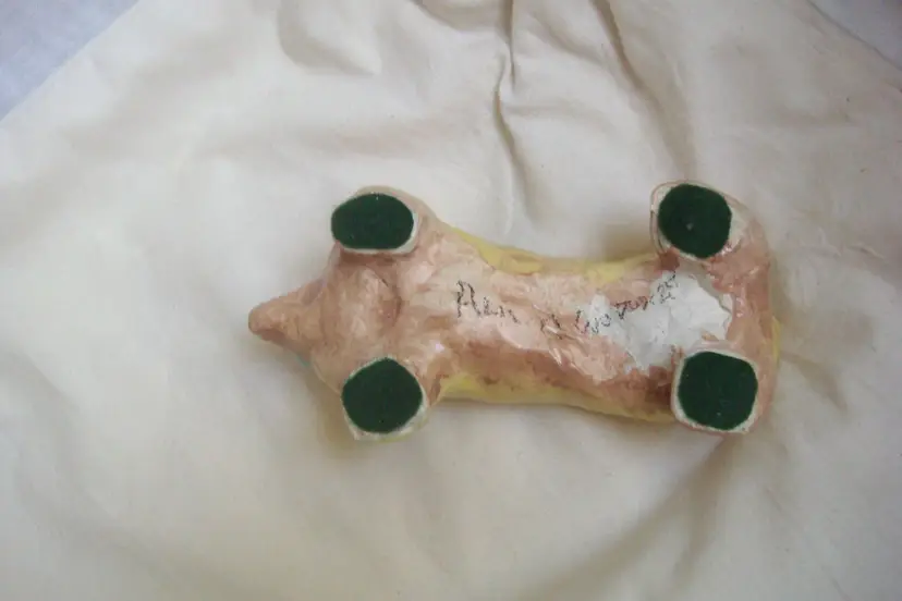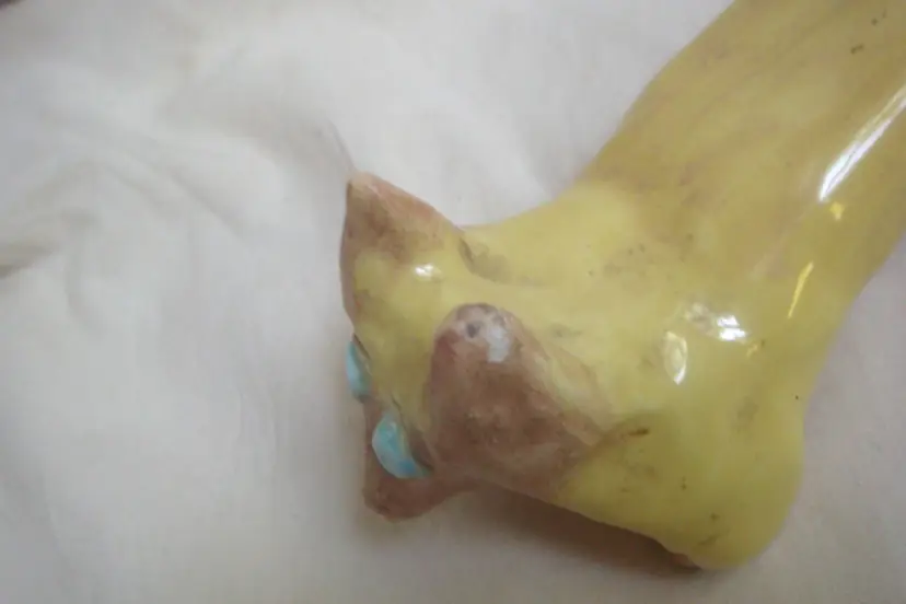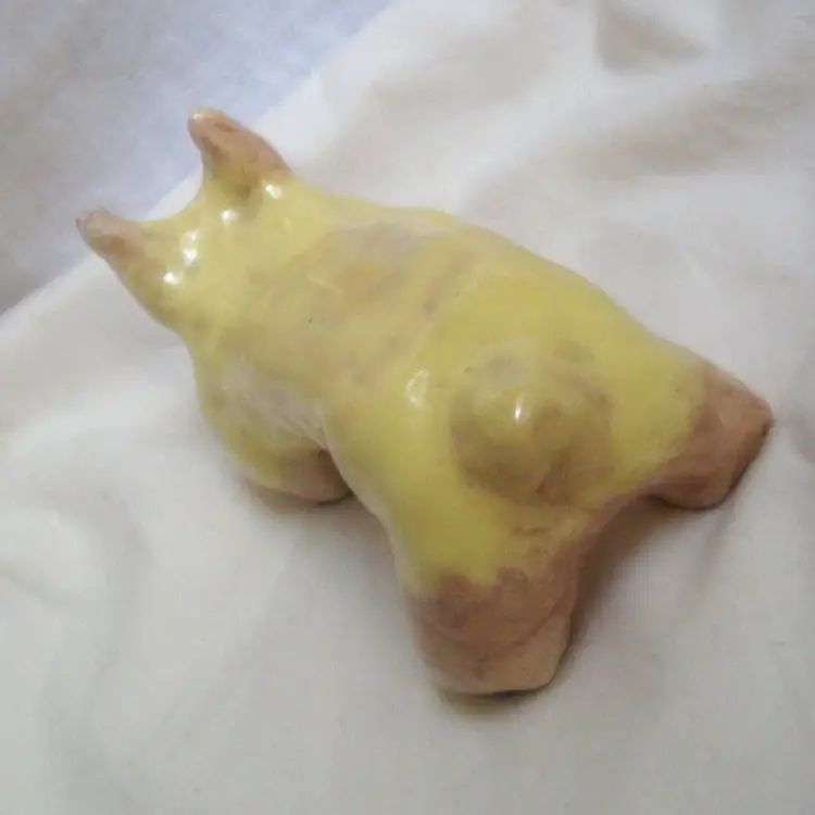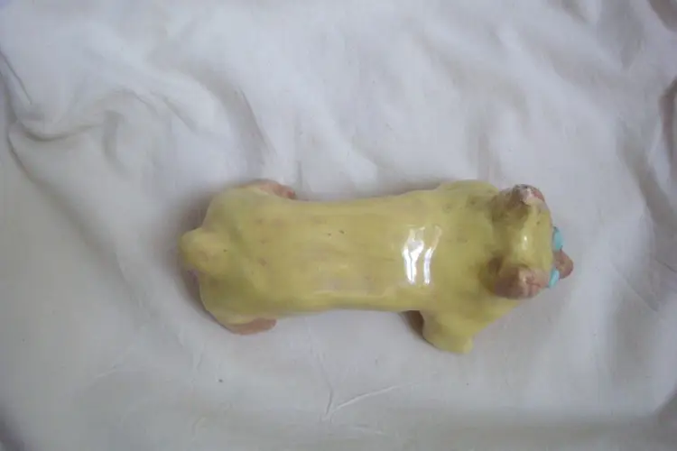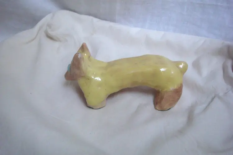 Long yellow dog-like with blue bug eyes, Corgi-esque. Dimensions: 6ʺW × 3ʺD × 1.5-2.5ʺH Wabi sabi, small ear chip & unglazed spots. Artist, origin, age unknown. Quite cute.