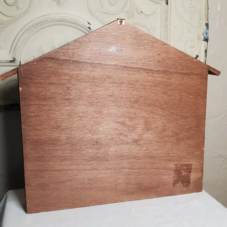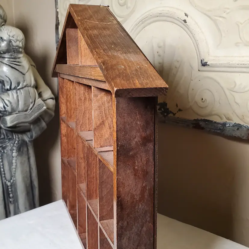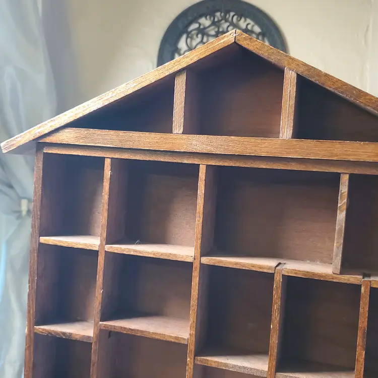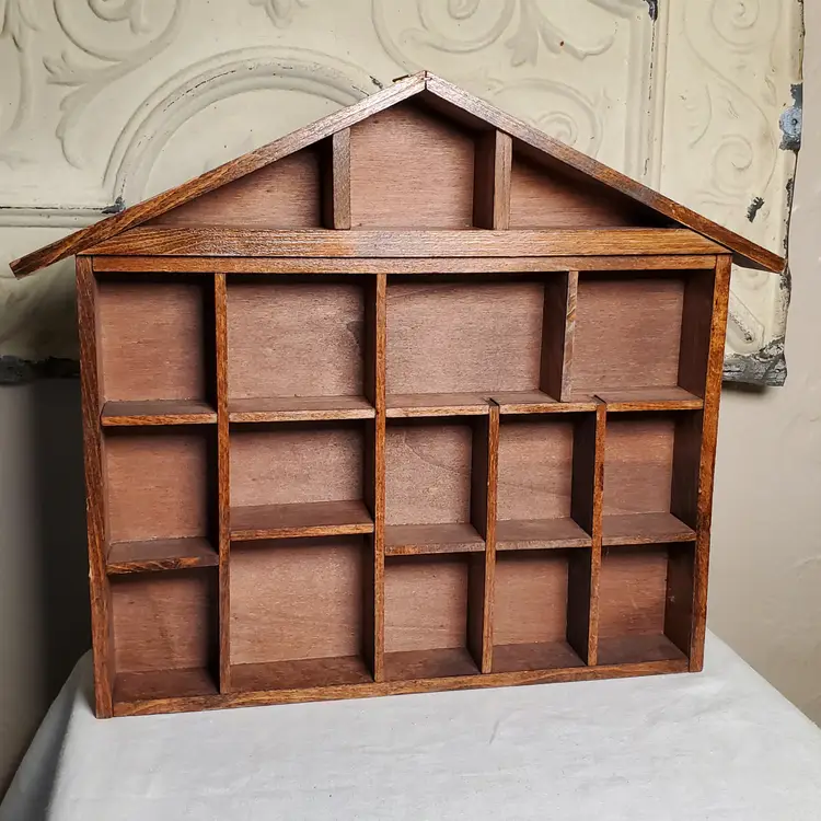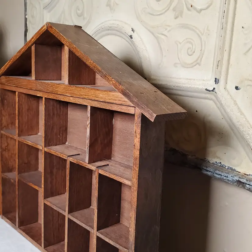 Adorable house shaped display shelf waiting to be filled with your tiny treasures. 17 compartments including roofline. Approx 12" x 12". Wood is raw and rustic.